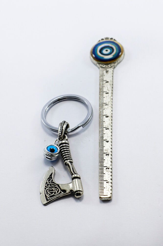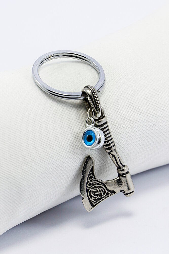 Erkek Anahtarlığı Çİft Taraflı Cam Nazar Boncuğu Metal Balta Anahtarlık, Erkek Hediyesi
