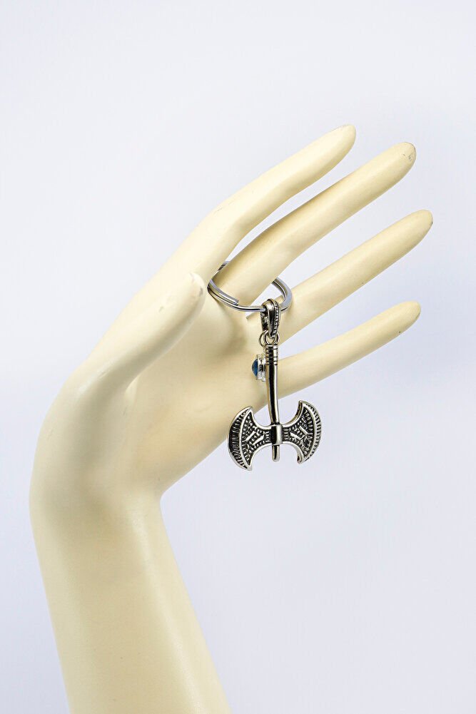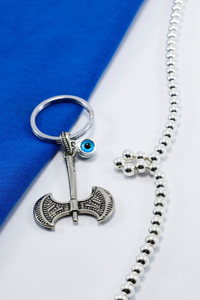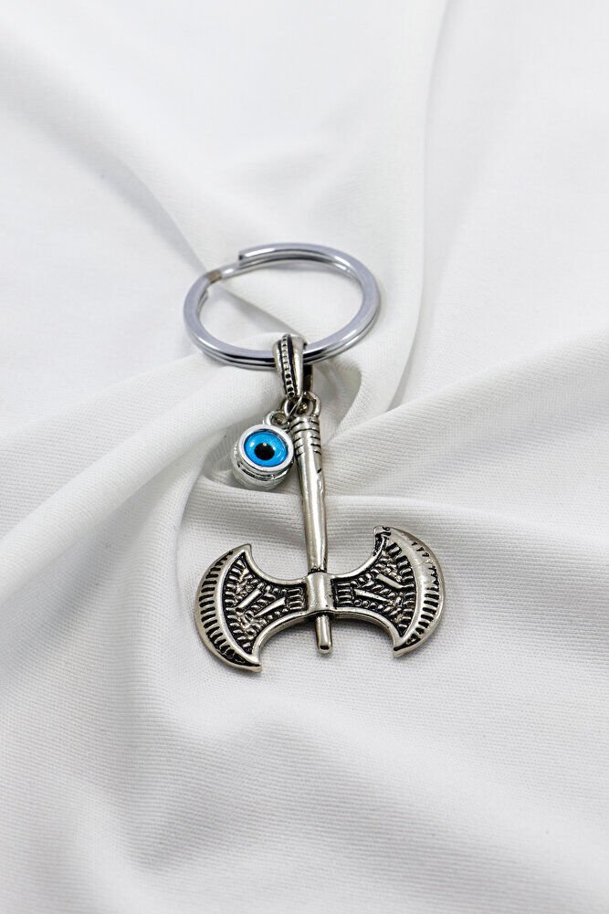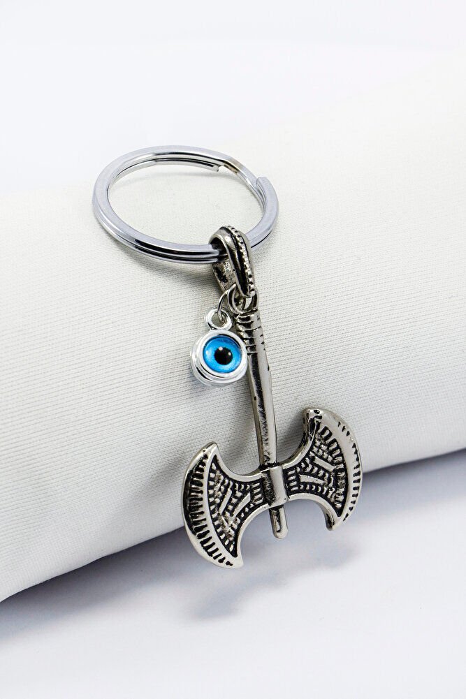 Erkek Anahtarlığı Çİft Taraflı Cam Nazar Boncuğu Metal İki Ağızlı Balta Anahtarlık