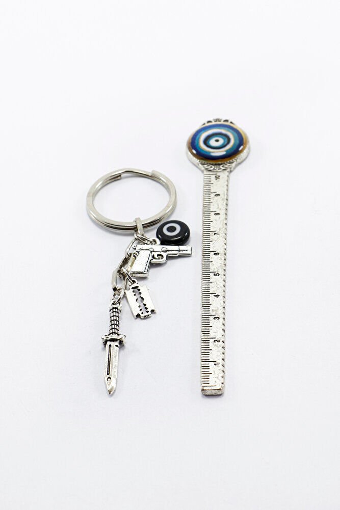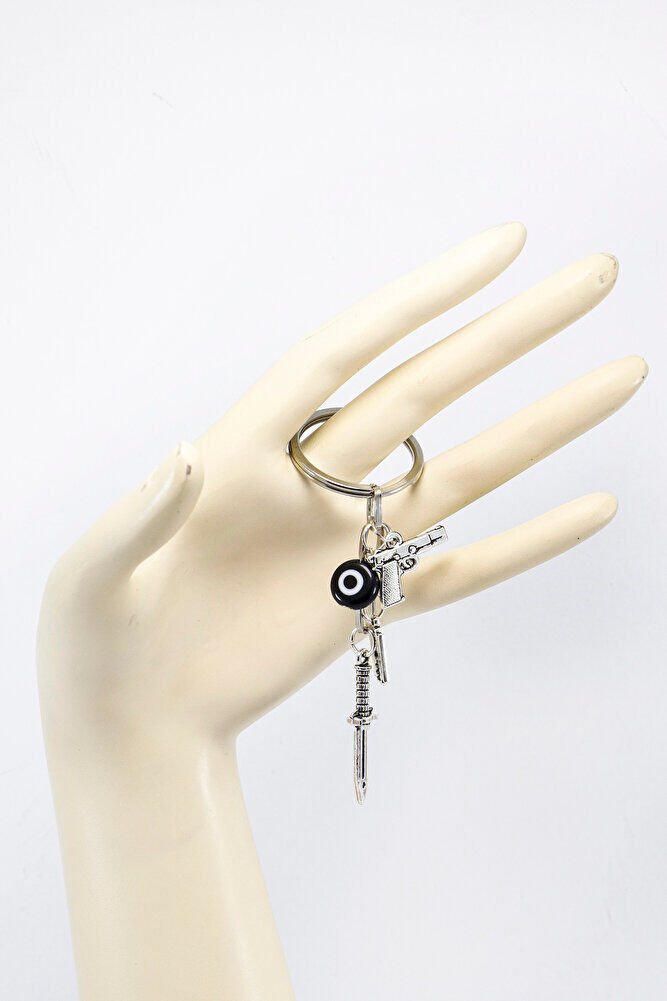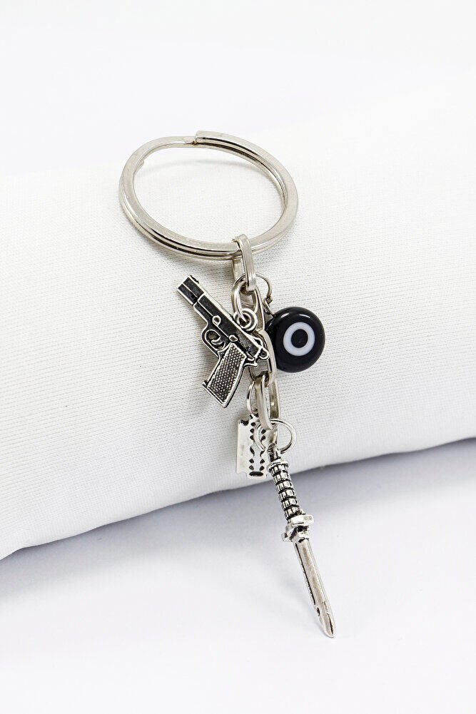ElSiyah tonlarda hazırlanmış bu anahtarlık, el yapımı cam nazar boncuğu ve metal minyatür hançer, silah ve jilet gibi tematik objelerle süslenmiştir.; Nazar boncuğunun, geleneksel olarak kötü bakışlara karşı koruyucu bir sembol olarak kullanıldığına inanılır.; Bu nedenle birçok kişi nazar boncuğunu günlük eşyalarında taşımayı tercih eder.; Karakterli ve sıra dışı tasarımıyla çanta ya da anahtarlara özgün bir hava katar.; Farklı tarzları sevenler için anlamlı ve dikkat çekici bir seçenektir.; TÜM ÜRÜN FOTOĞRAFLARI ENNEA ARTFİRMASINA AİTTİR VE ÖZGÜN ÇALIŞMALARDIR.; İZİNSİZ KULLANIM, KOPYALAMA VEYA DAĞITIM KESİNLİKLE YASAKTIR.; GEREKLİ DURUMLARDA YASAL İŞLEMBAŞLATILACAKTIR.;