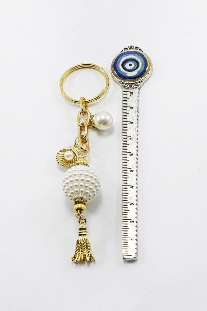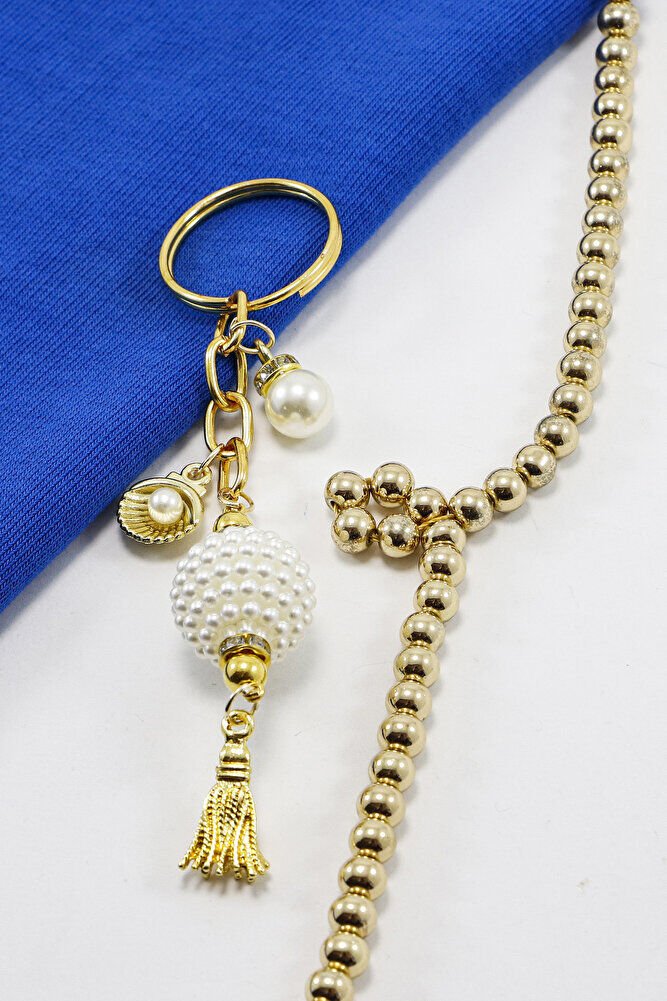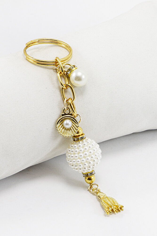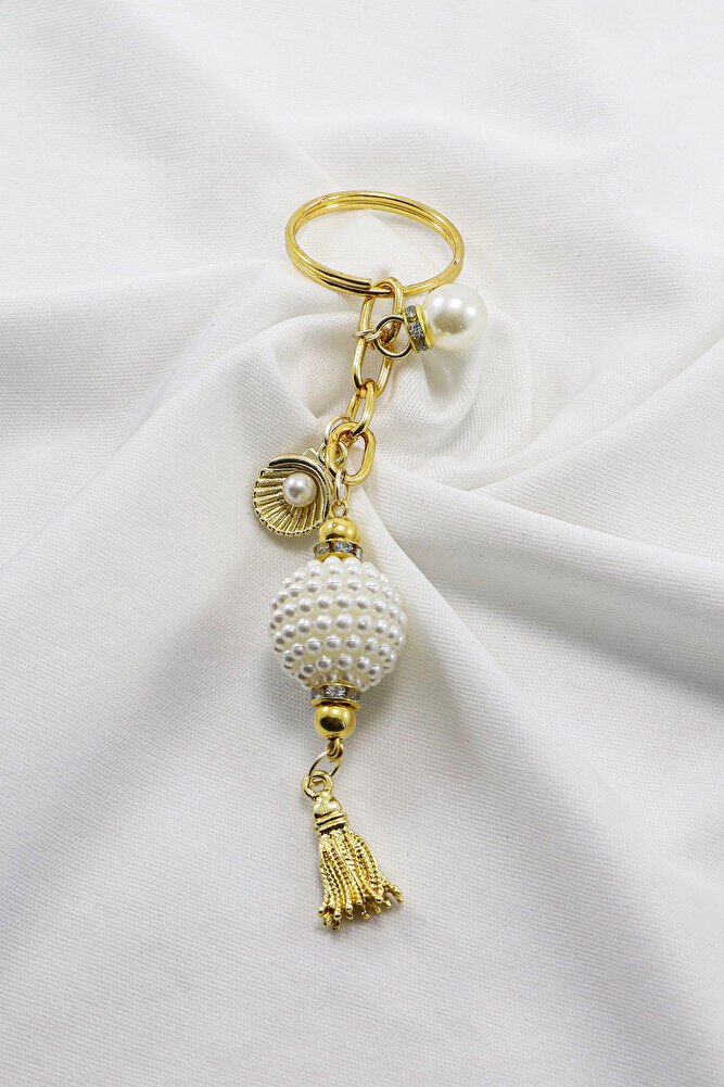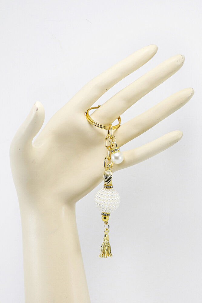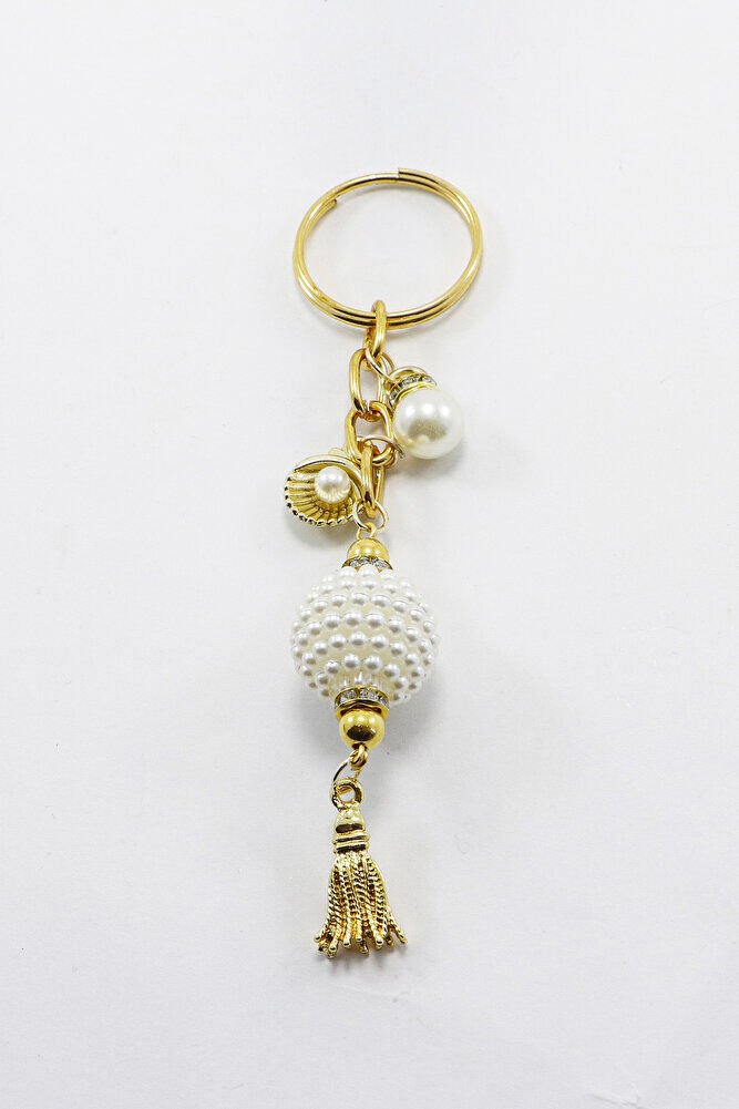Gold Halkalı Beyaz İncili Böğürtlen Salkım Püsküllü Anahtarlık, Hediyelik Çanta Süsü