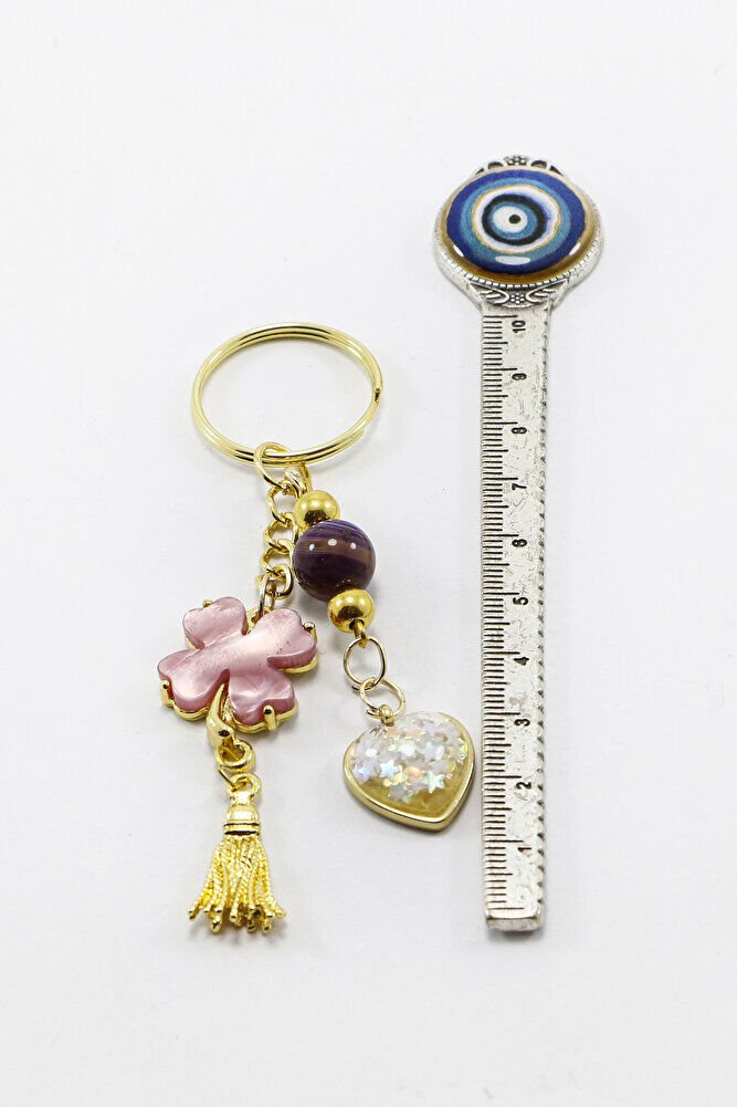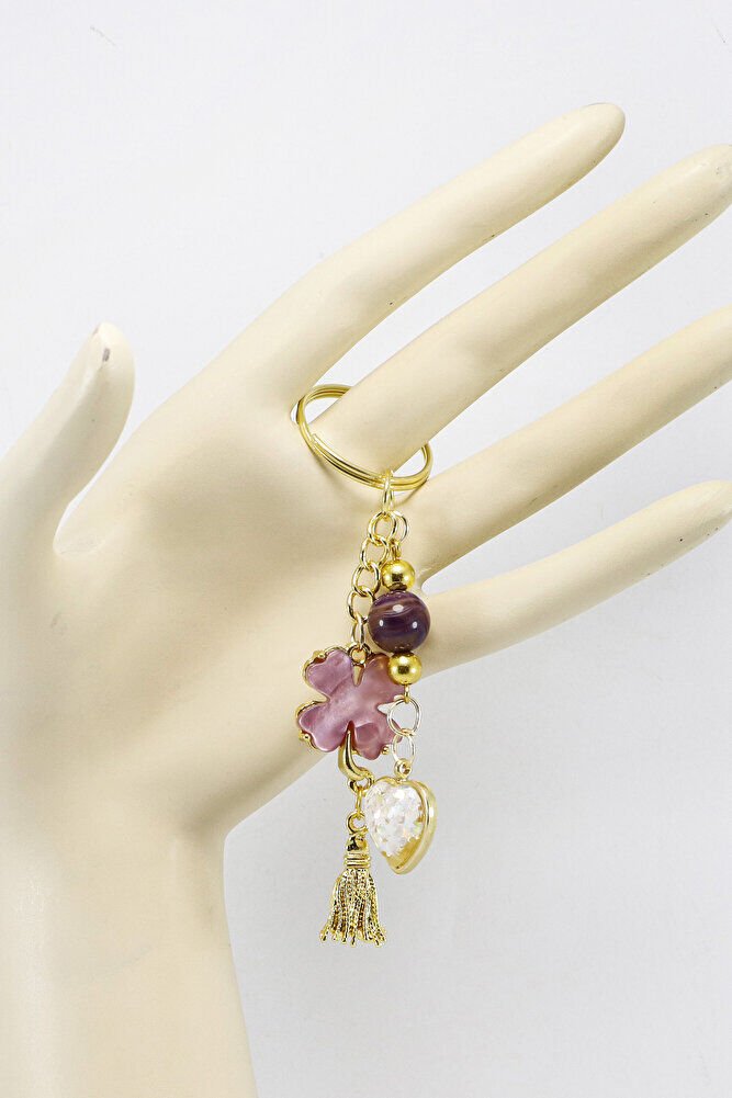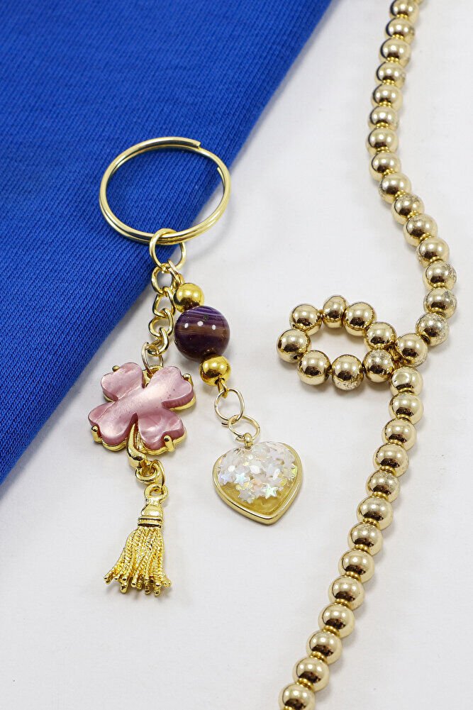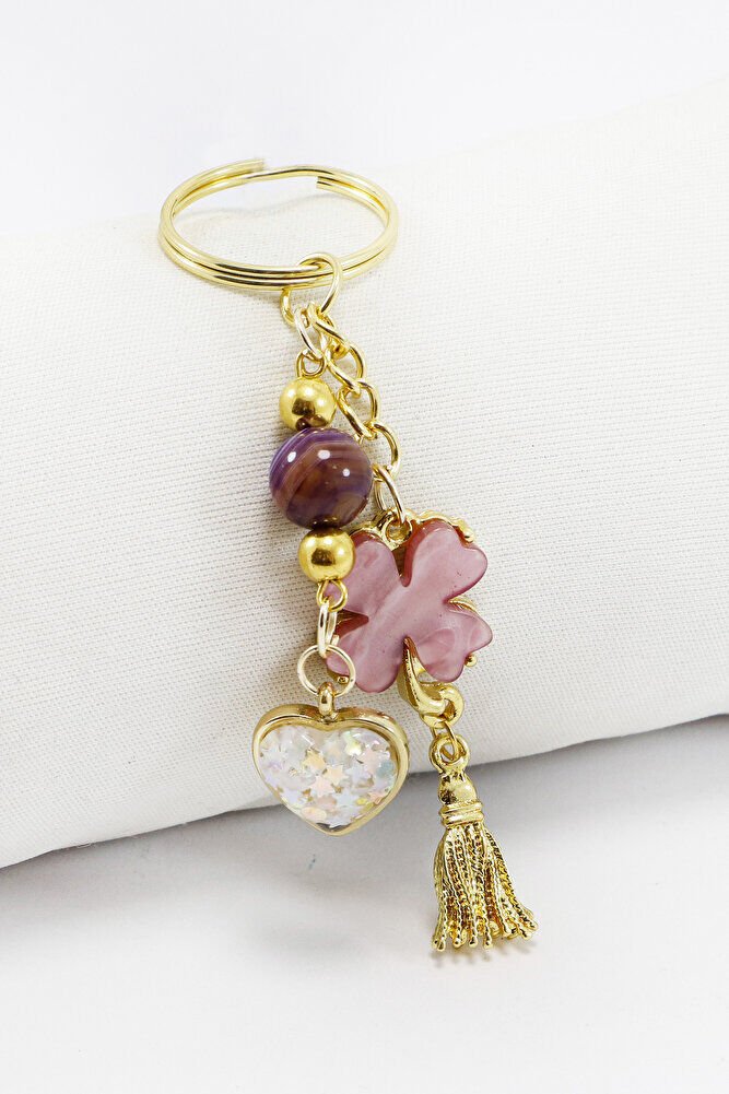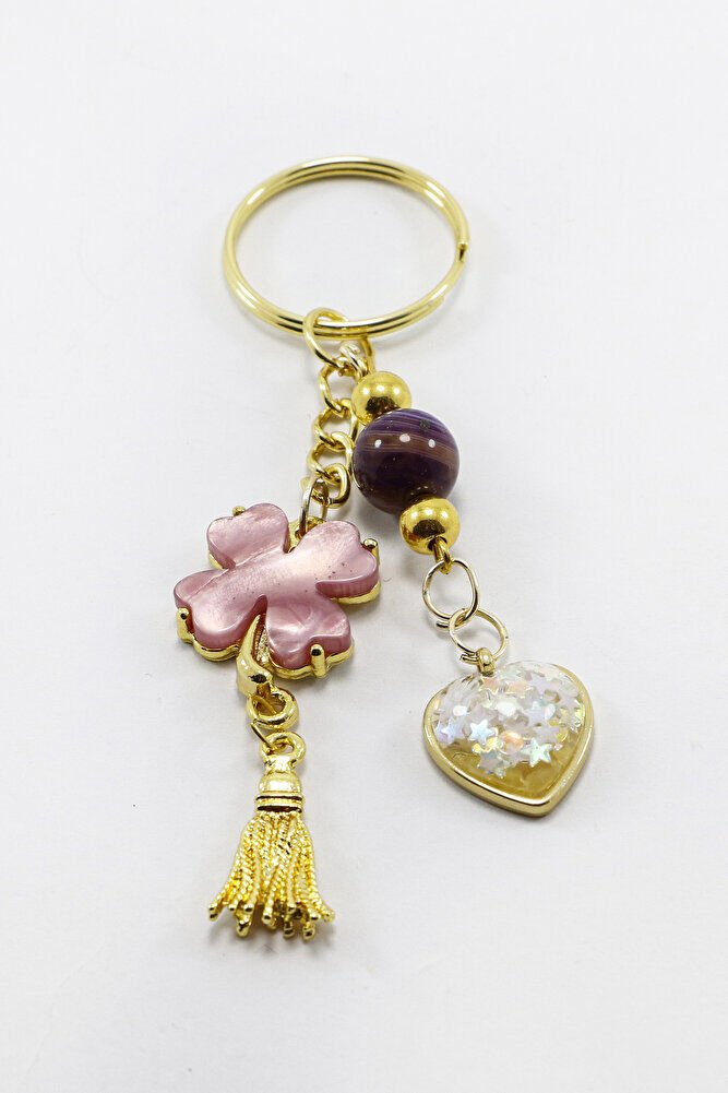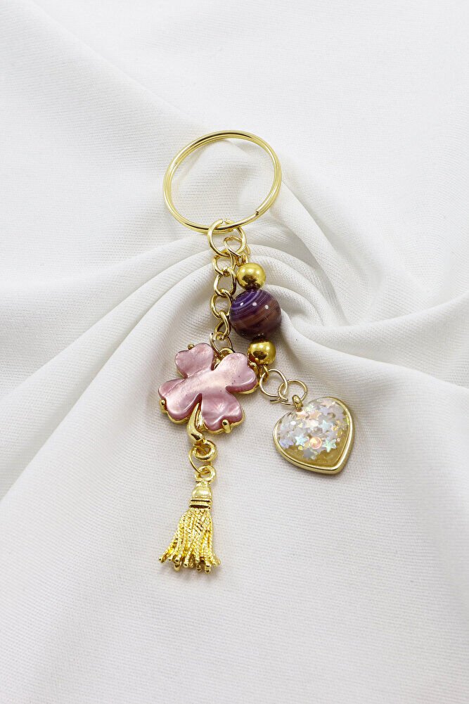Gold Halkalı Pembe Yoncalı Parlak Kalpli Salkım Anahtarlık, Hediyelik Çanta Süsü