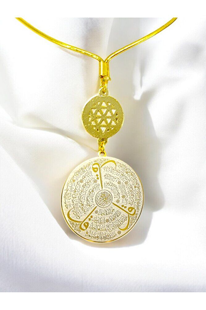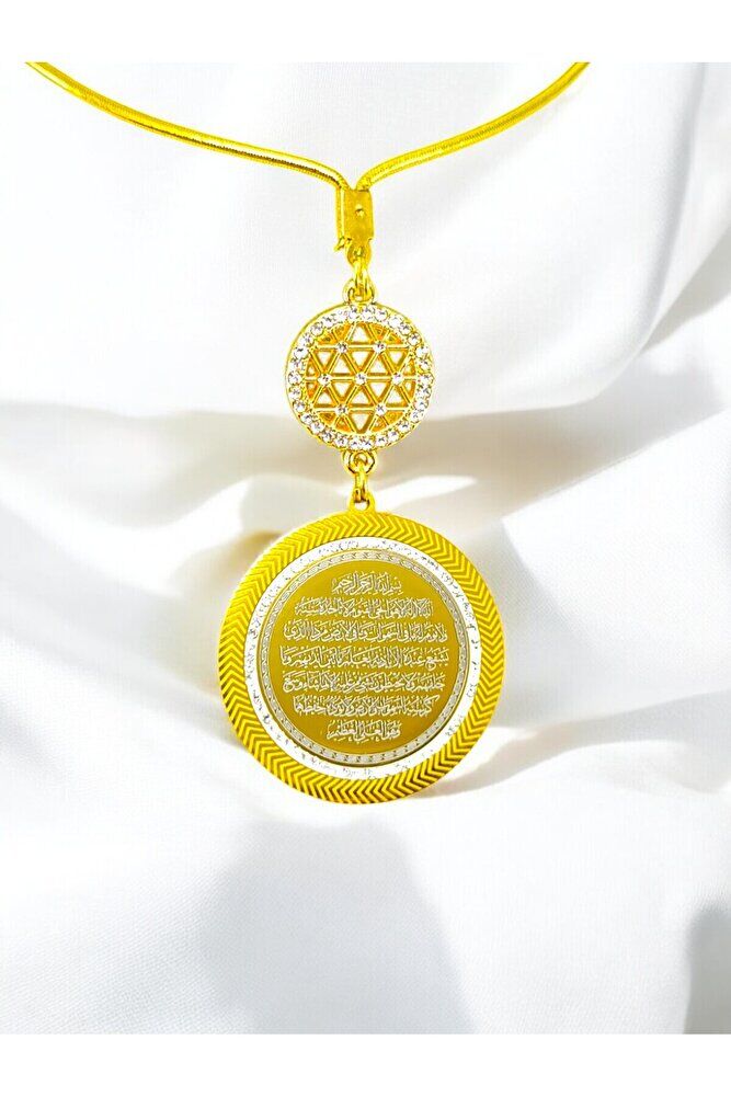 Dualar lazer kazıma tekniği ile kalıcı bir şekilde kazınmaktadır.; Ürün el yapımıdır el yapımı olduğu için ufak farklılık ve düzensizlikler olasıdır.; İp elastiktir.; Lastikli yapısı sayesinde her model araca rahatlıkla takılabilmektedir.; Parlak taşlı lotus çiçeği tek taraflı olup Ayetel Kürsi yazılı yüzünde taşlar bulunmaktadır.; Altın renkli çelik plaka 3,5 cm ölçülerindedir.; Plaka altın renkli paslanmaz çeliktir.; Bağlantı materyelleri dayanıklı altın kaplamadır.; Ürün çift taraflıdır.; Plakanın bir yüzünde Ayetel Kürsi diğer yüzünde ise Felak Nas İhlas bulunmaktadır.; Felak, Nas ve İhlas sureleri, İslam inancında korunma ve manevi güç sağlamak için okunan önemli dualardır.; İnanılır kabul edilir ki, Felak ve Nas sureleri, özellikle kötü gözlerden, nazardan ve şeytani etkilerden korunmak için okunur.; Felak suresi, karanlık güçlere karşı koruma sağlarken, Nas suresi de olumsuz düşünceler ve zararlı enerjilerden korunmayı sağlar.; İhlas suresi ise, Allah’ın birliğini ve sınırsız gücünü ifade eder, bu sureye inanılır ki, kişi manevi huzur ve Allah’ın koruması altında olur.; Bu sureler, sıkça güven ve huzur arayışında olanlar için okunur ve ruhsal dengeyi sağlamak isteyenlere büyük fayda sağladığına inanılır.; Ayetel Kürsi, İslam inancında en güçlü ve koruyucu dualardan biri olarak kabul edilir.; Ayetel Kürsi, Allah’ın büyüklüğünü ve egemenliğini ifade eden bir ayet olup, koruma ve manevi güç sağlamak amacıyla sıkça okunur.; Bu ayet, göklerde ve yerin her şeyinin Allah’a ait olduğunu vurgular ve şeytani etkilerden korunma sağlar.; Özellikle gece yatmadan önce okunmasının, güvende olma, zararlı enerjilerden korunma ve ruhsal huzur sağlama açısından büyük fayda verdiğine inanılır.; Aynı zamanda, Allah’ın her şeyi bildiği ve her şeyin O’na bağlı olduğu inancı ile kişiye manevi rahatlık ve güç verir.