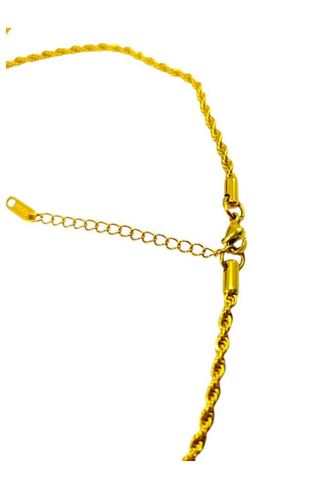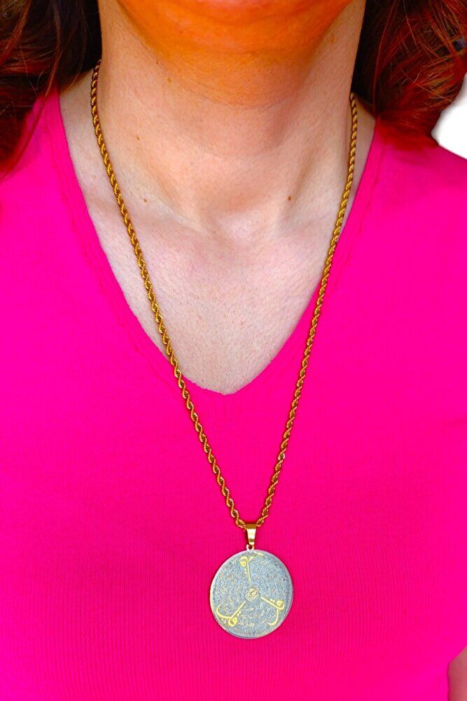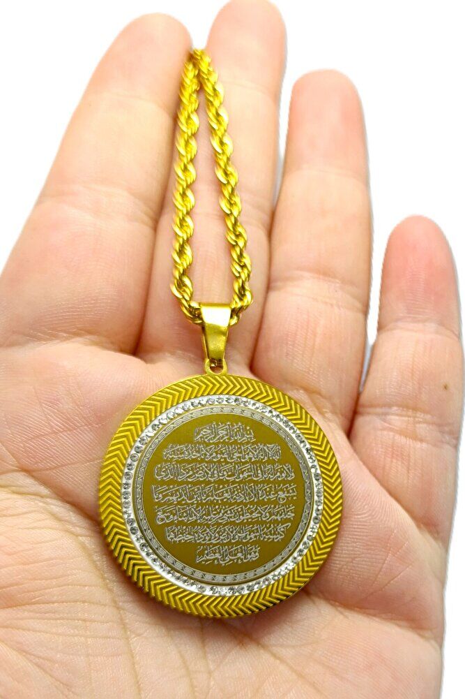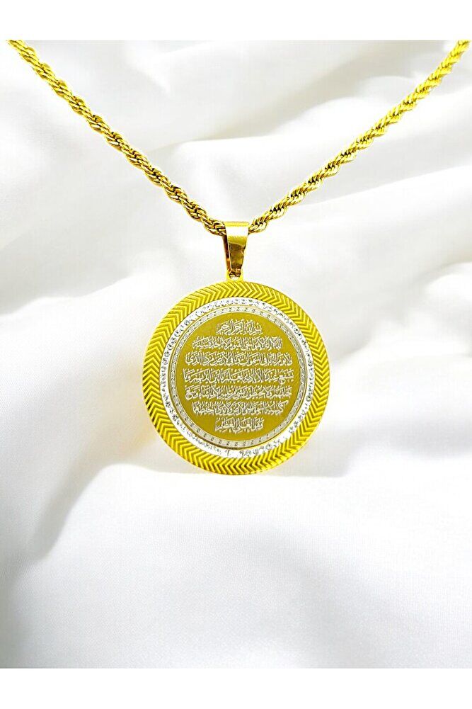 Gold Parlak Taş Çerçeveli Çelik Çift Taraflı Ayetel Kürsi/Felak Nas İhlas Burgu Zincirli Kolye