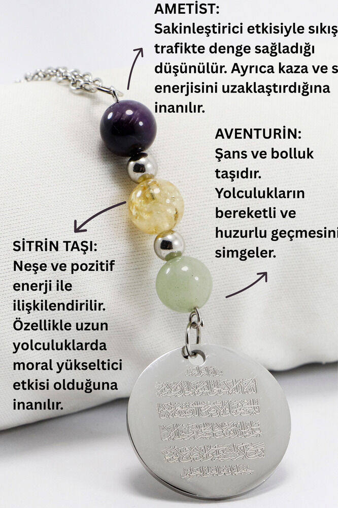 Gri renkli paslanmaz çelikten üretilmiş çift taraflı bu özel araba dikiz ayna süsü, ön yüzünde Ayetel Kürsi, arka yüzünde ise Fatiha suresiyle derin manevi anlamlar taşır.; Ayetel Kürsi; koruyucu özelliğiyle bilinirken, Fatiha suresi ise şifa ve bereket duası olarak sıkça okunur.; Ürün, enerjisi yüksek doğal taşlarla tamamlanmıştır: Ametist zihinsel dinginlik ve negatif enerjilerden arınma ile ilişkilendirilirken, Sitrin neşe, özgüven ve bolluk enerjisi yayar.; Aventurin ise kalp çakrasını dengelediği ve pozitif düşünceyi artırdığı düşünülen bir taştır.; Bu üçlü kombinasyon, özellikle seyahatlerde hem ruhsal hem zihinsel bir denge sunmayı amaçlar.; Yeni araçlar için anlamlı ve şık bir hediye alternatifi olan bu ürün, dekoratif olmasının yanı sıra taşıdığı dualar ve taşlar sayesinde kullanıcıya manevi destek sunar.; Doğal taşlar sebebiyle her ürün kendine has doku ve renklere sahiptir; bu nedenle görseller temsili olup ürünler arasında küçük farklılıklar olabilir.; TÜM ÜRÜN FOTOĞRAFLARI ENNEA ART FİRMASINA AİTTİR VE ÖZGÜN ÇALIŞMALARDIR.; İZİNSİZ KULLANIM, KOPYALAMA VEYA DAĞITIM KESİNLİKLE YASAKTIR.; GEREKLİ DURUMLARDA YASAL İŞLEM BAŞLATILACAKTIR.