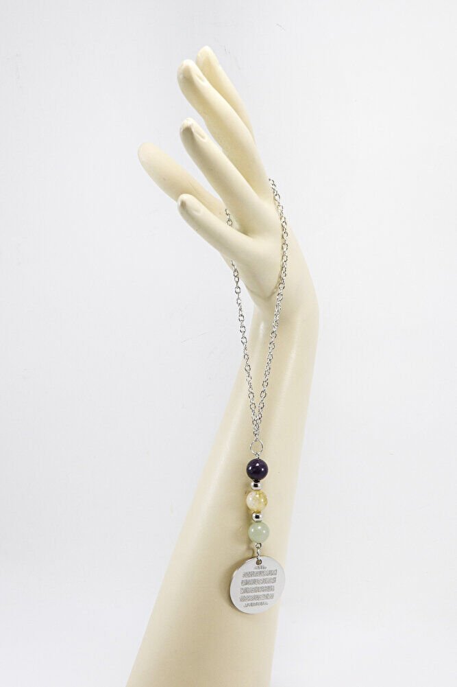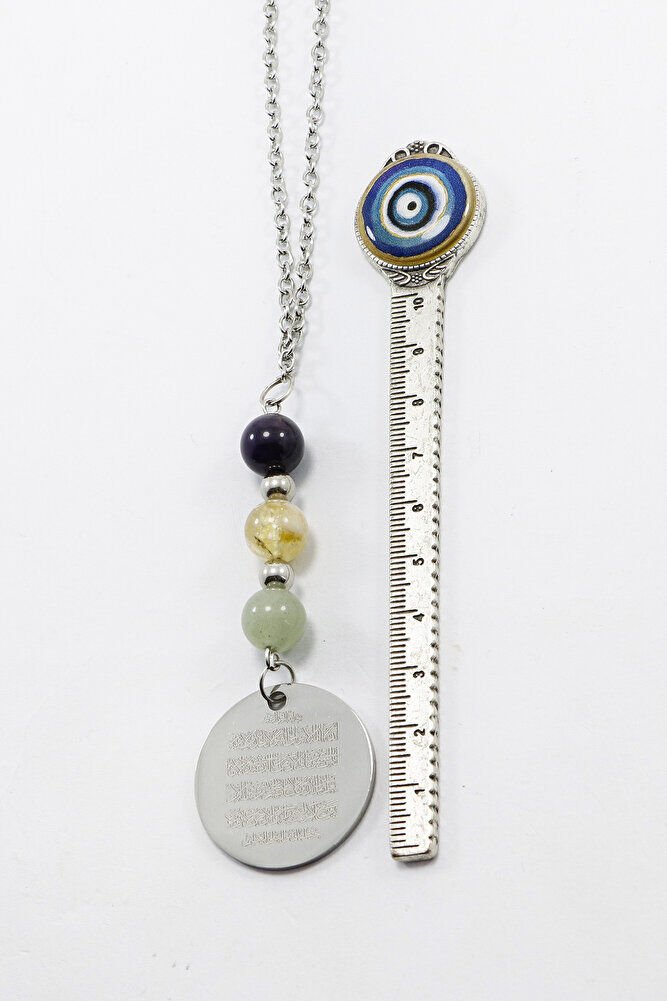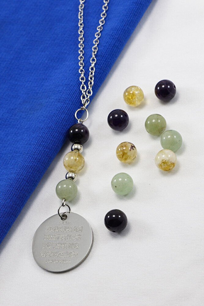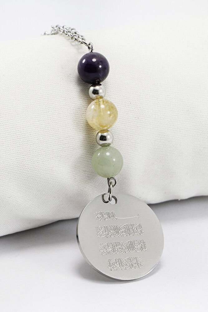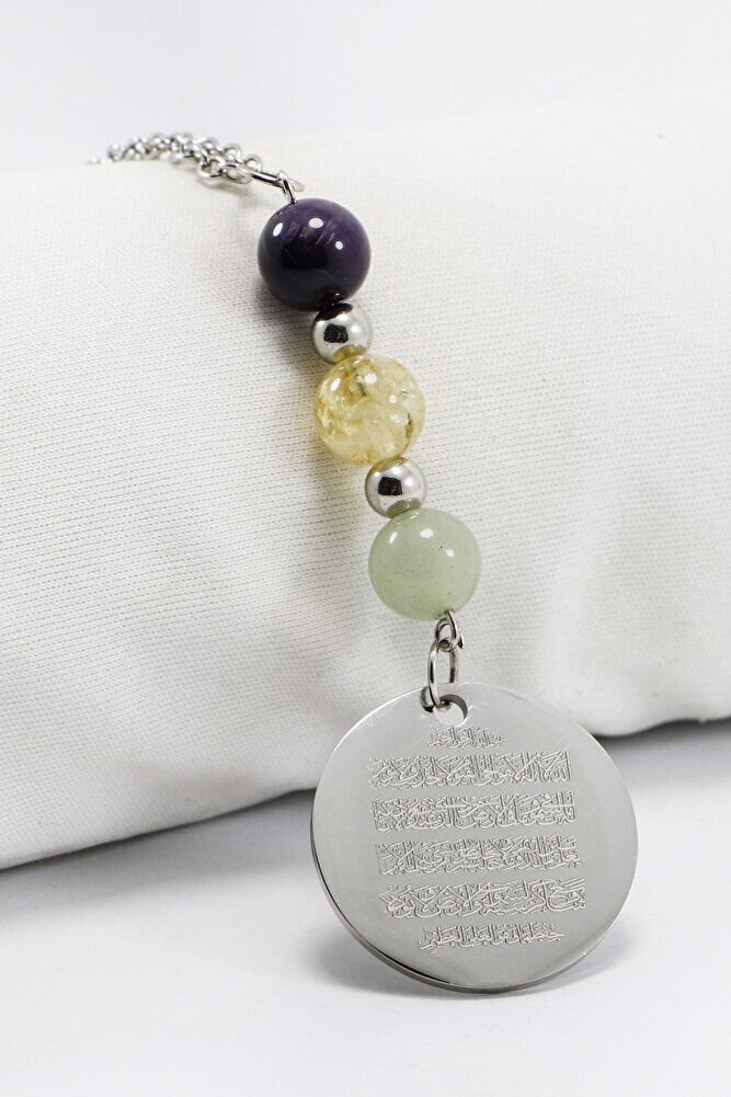 Gri Çelik Ayetel Kürsi Fatiha Dualı Araba Dikiz Ayna Süsü, Doğal Taşlar: Ametist, Sitrin, Aventurin