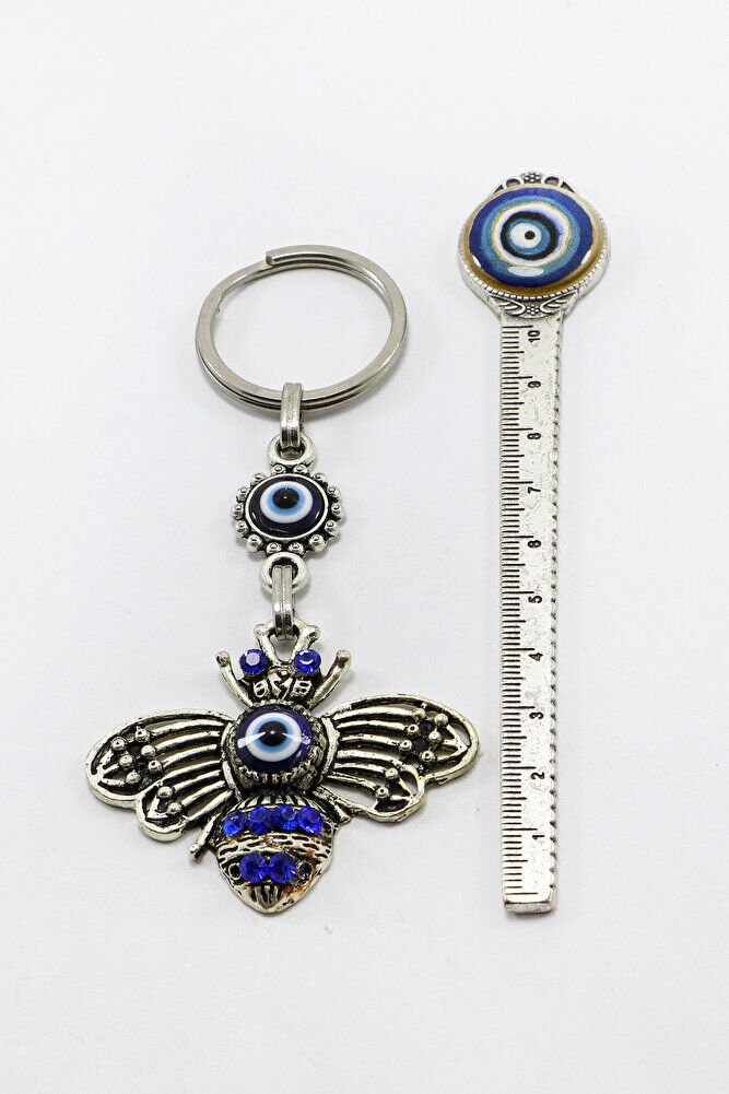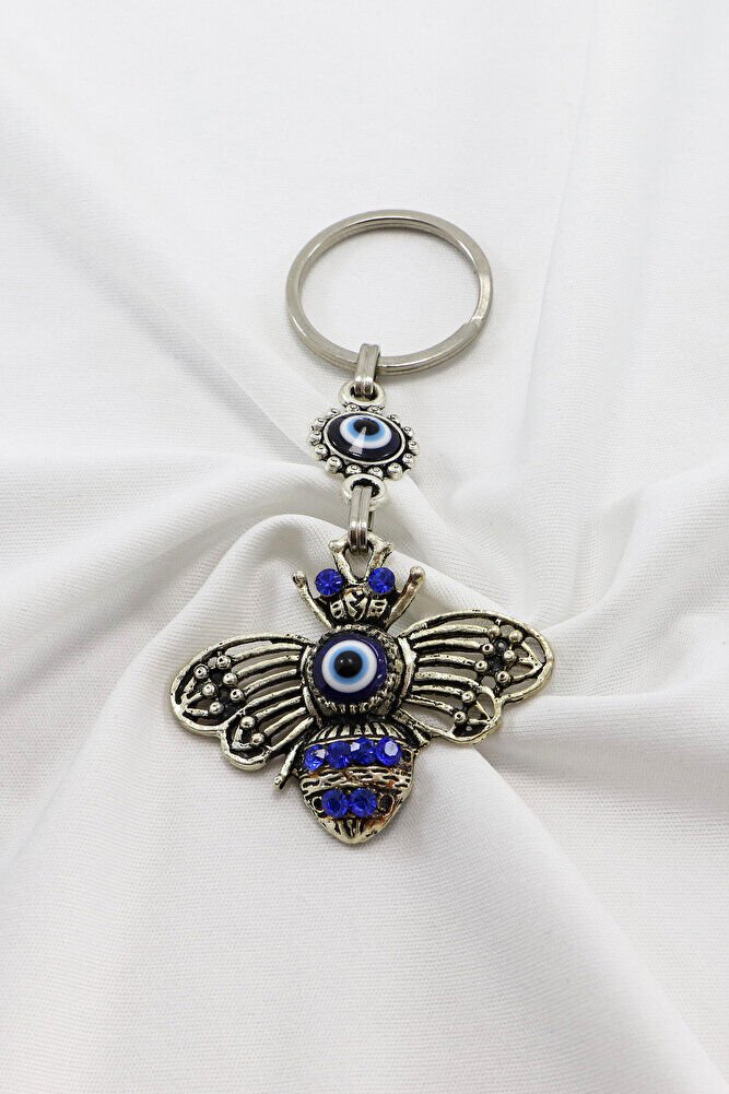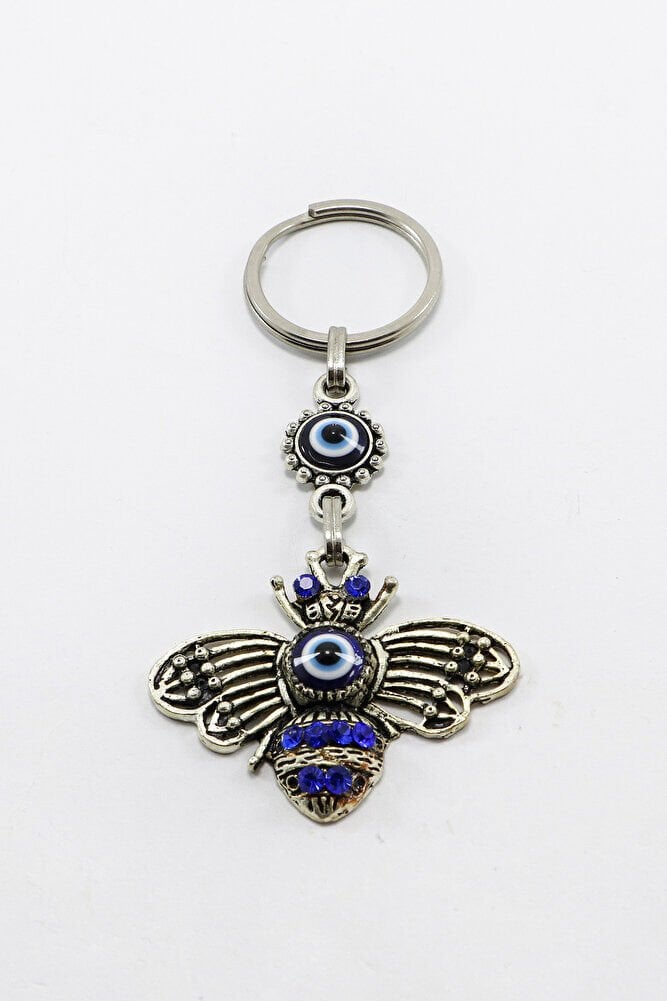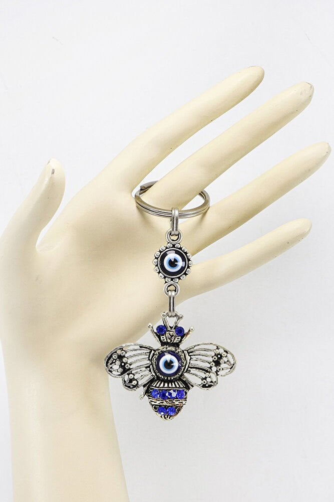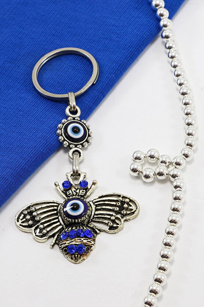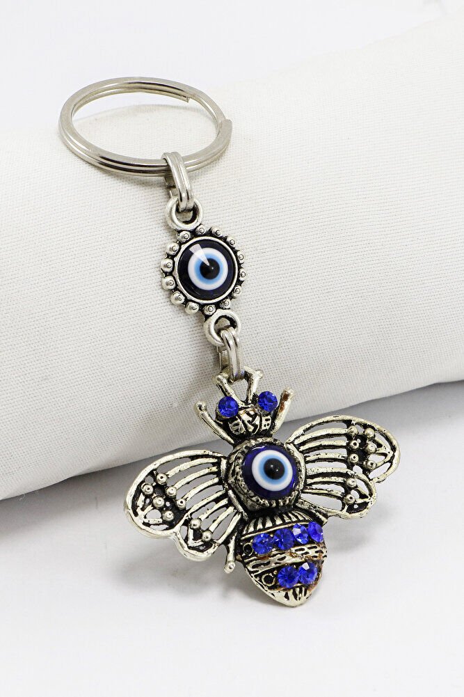 Gri Halkalı Lacivert Parlak Taşlı Metal Arılı Anahtarlık, Hediyelik Çanta Süsü