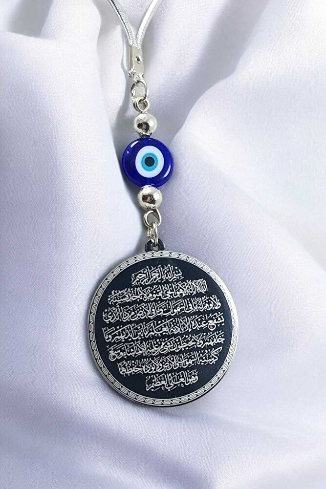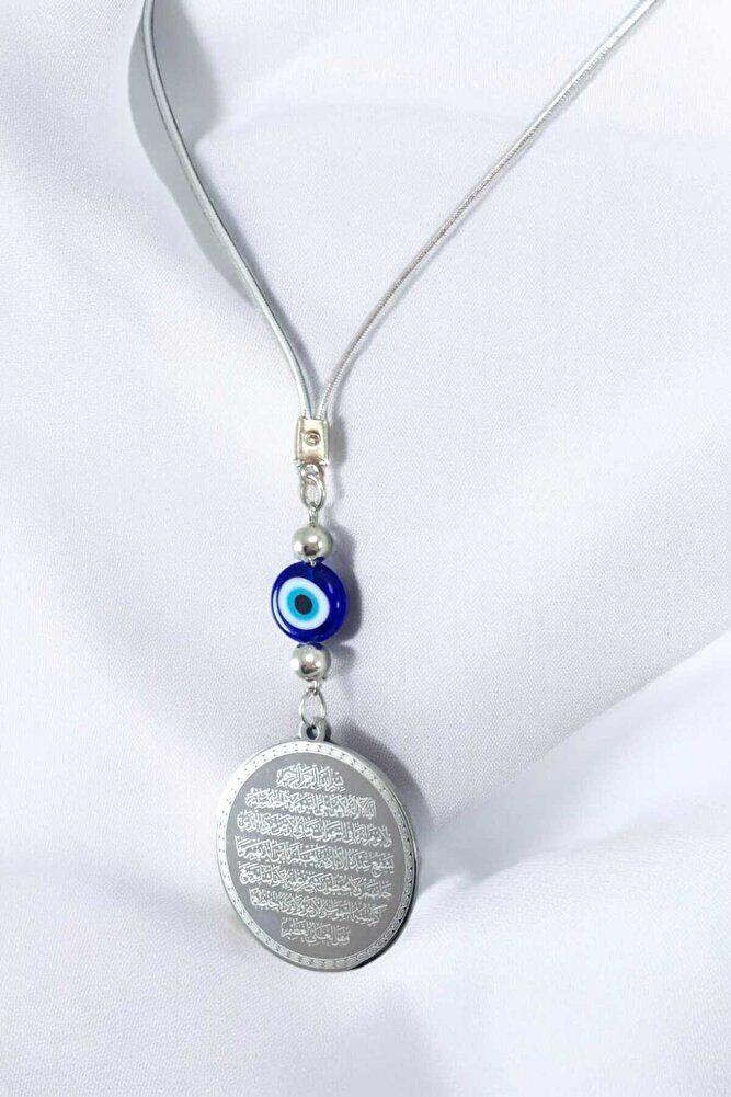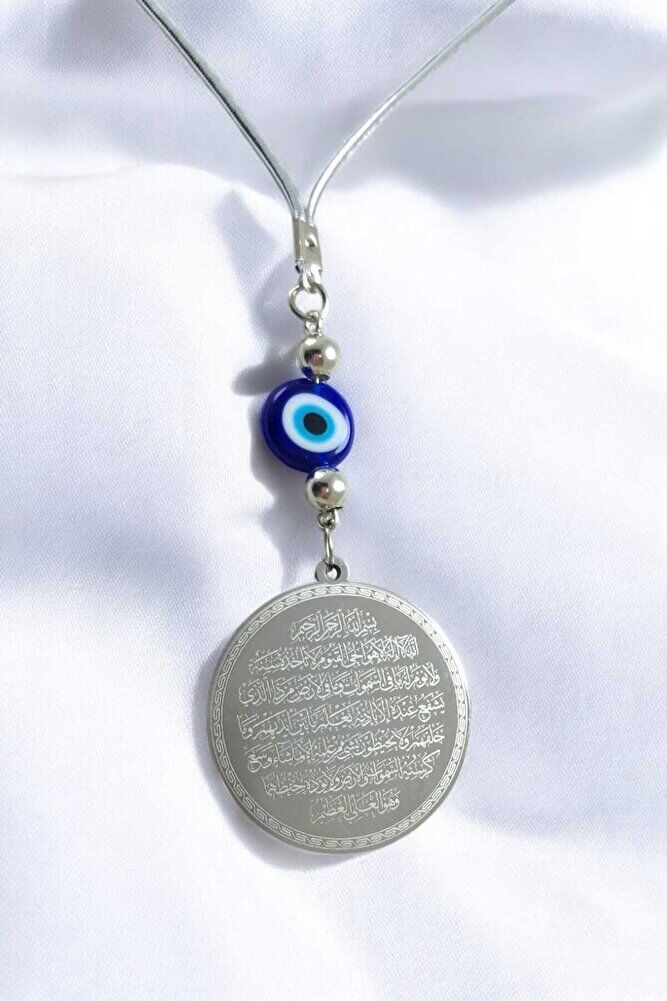 Gümüş Çelik Çift Taraflı Ayetel Kürsi Hilye-i Şerif Araba Dikiz Ayna Süsü, Nazar Boncuklu