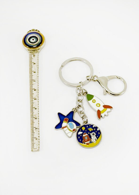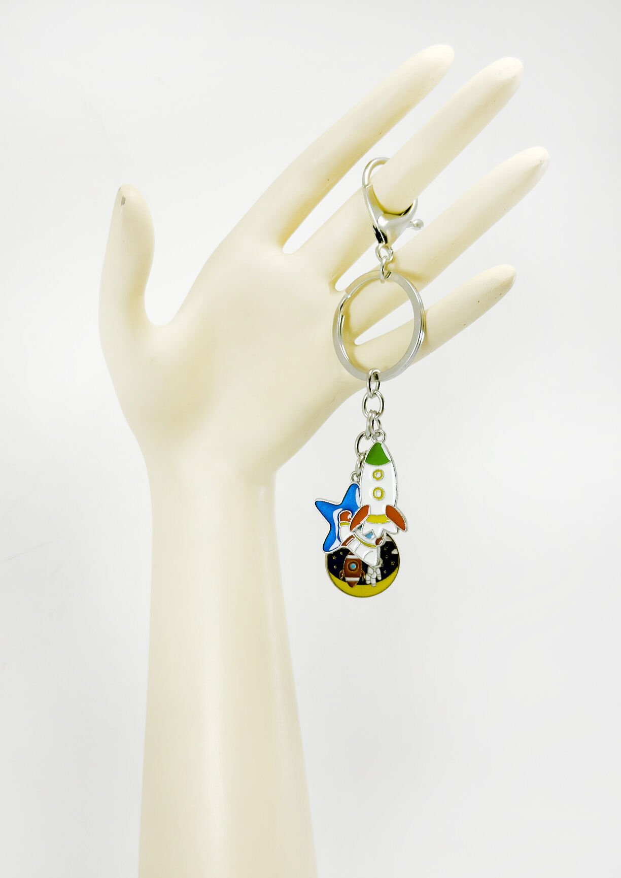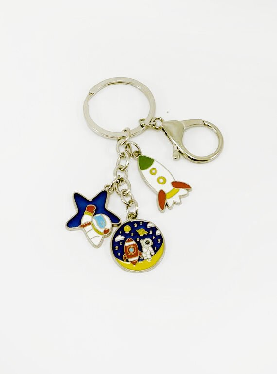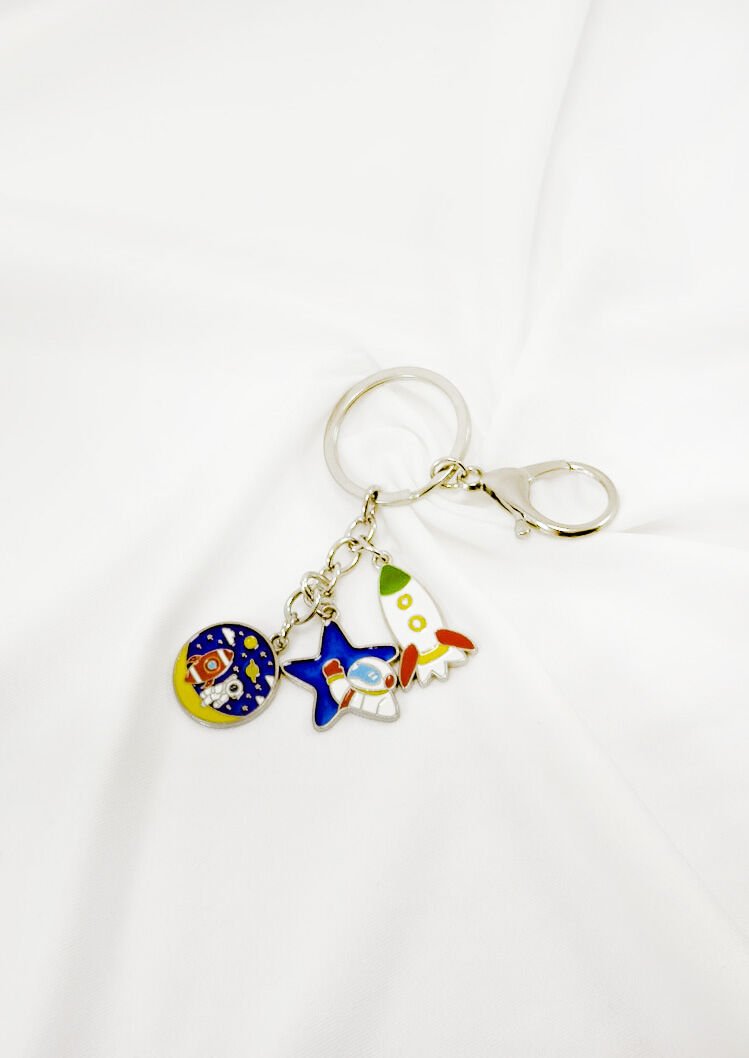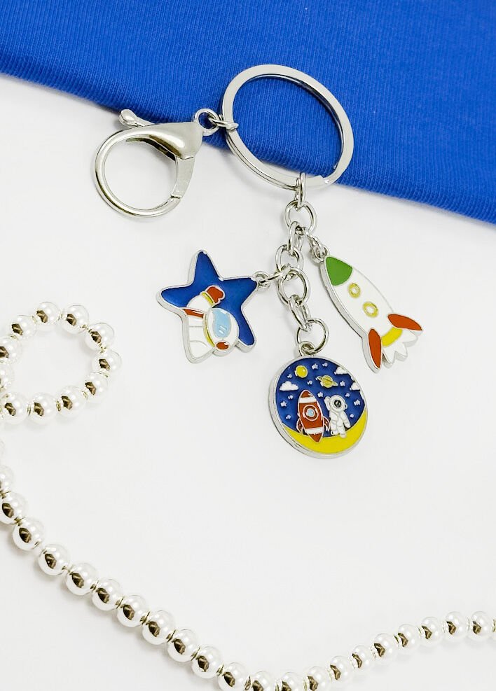 Gümüş renk halkalı minyatür roket ve astronot figürlü anahtarlık, uzay temalı şirin detaylarıyla dikkat çeken eğlenceli bir hediyelik çanta süsüdür.