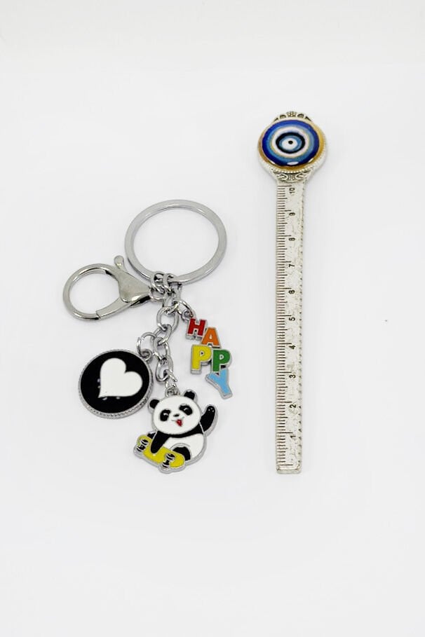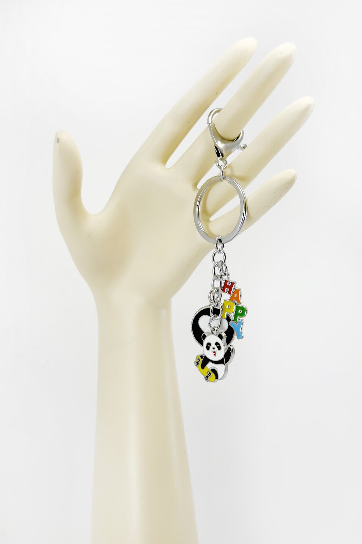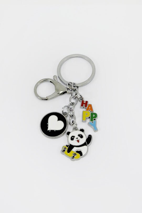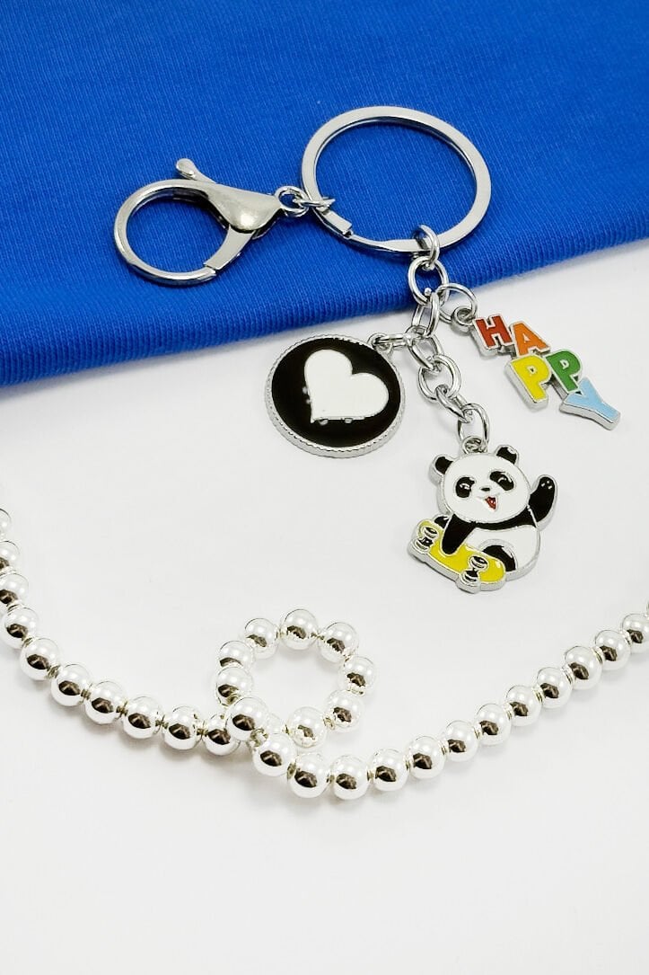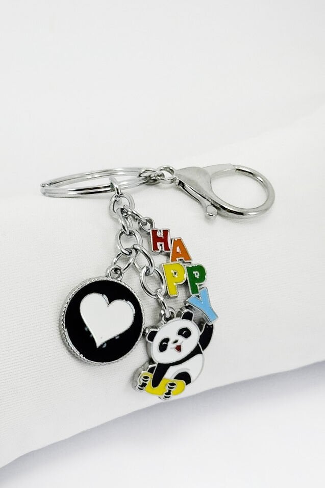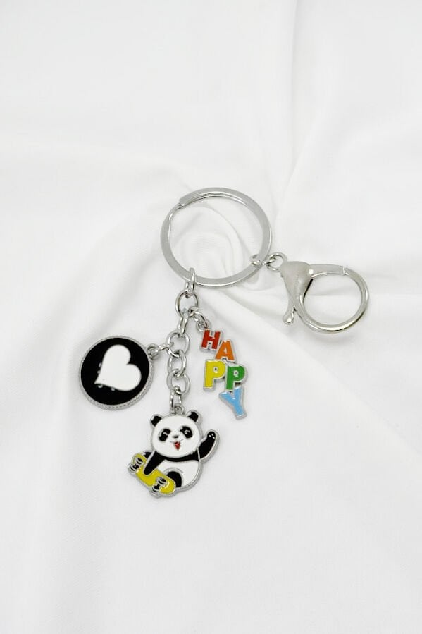Gümüş Renkli Minyatür Pandalı Kalp ve “Happy” Figürlü Anahtarlık, sevimliliğiyle dikkat çeken özel bir çanta süsüdür.