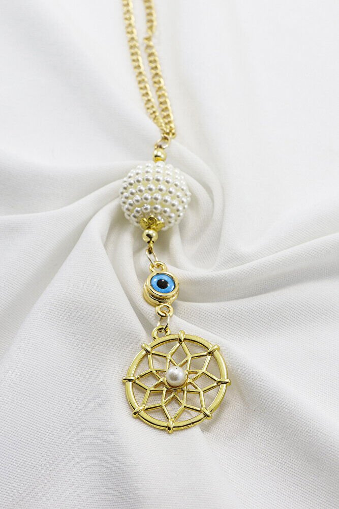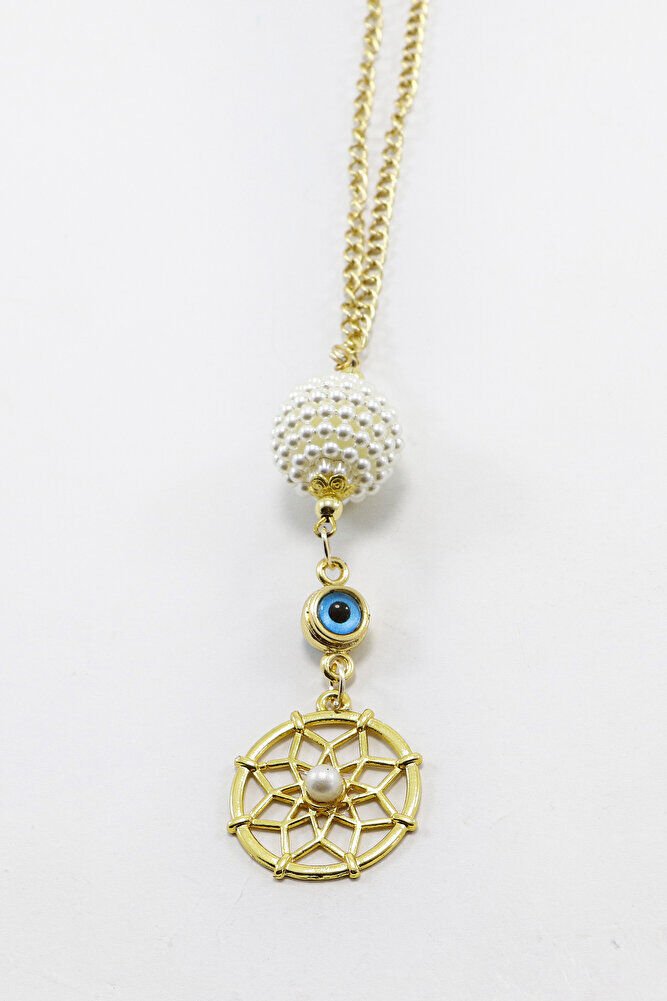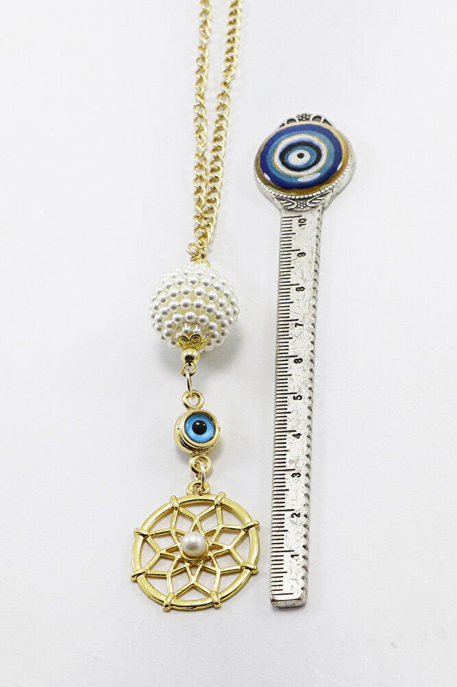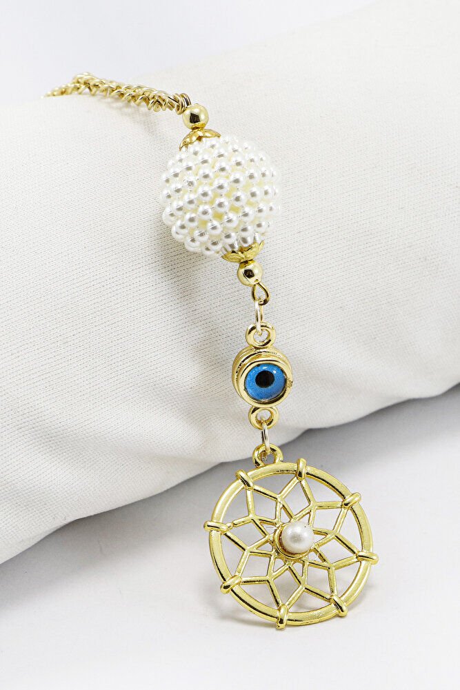 İnci detaylı top boncuğu, nazar boncuğu ve inci merkezli düş kapanı figürüyle tasarlanmış bu gold renkli dikiz ayna süsü, zarafeti ve anlamı bir arada sunar.; Nazar boncuğu kötü enerjilere karşı koruyucu kabul edilirken, rüya kapanı negatif düşünceleri filtrelediğine inanılan güçlü bir semboldür.; Aracınıza hem estetik hem de sembolik bir dokunuş kazandırır.; Yeni araç hediyesi, doğum günü veya özel günler için şık ve anlamlı bir seçenektir.; Görsel temsili olup, ürünlerde el işçiliğine bağlı olarak ufak farklılıklar görülebilir.