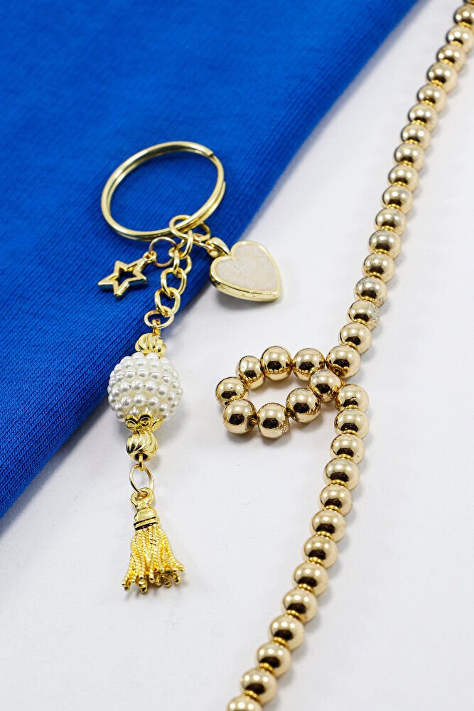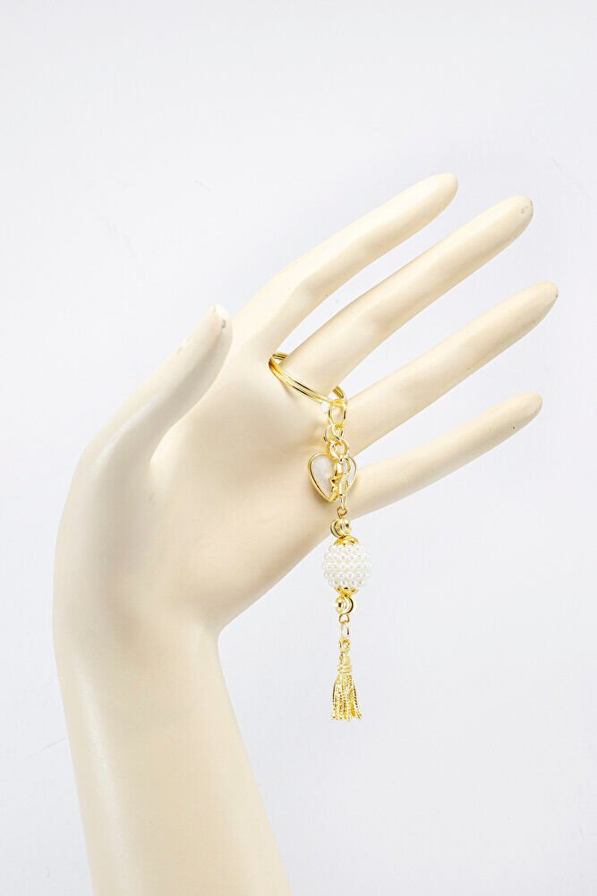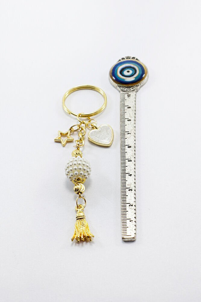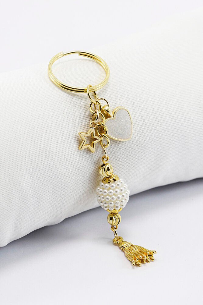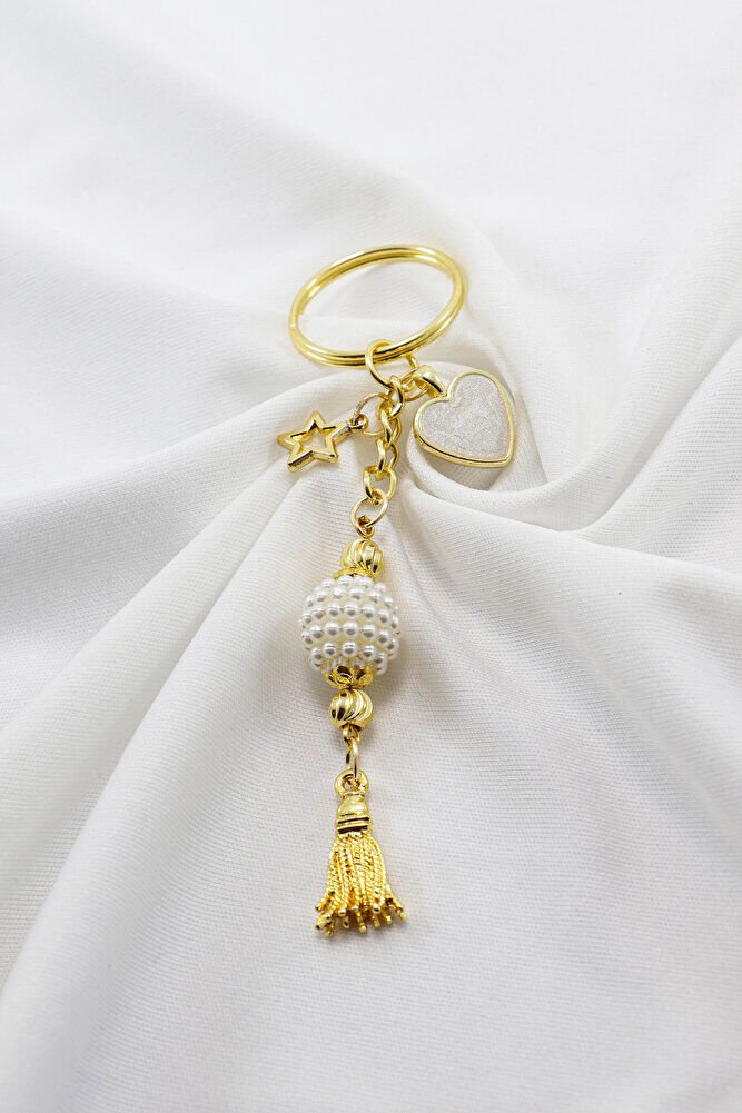 Kalpli Yıldızlı İncili Püsküllü Küçük Anahtarlık, Hediyelik Çanta Süsü
