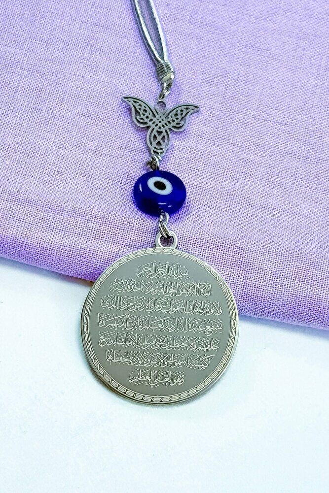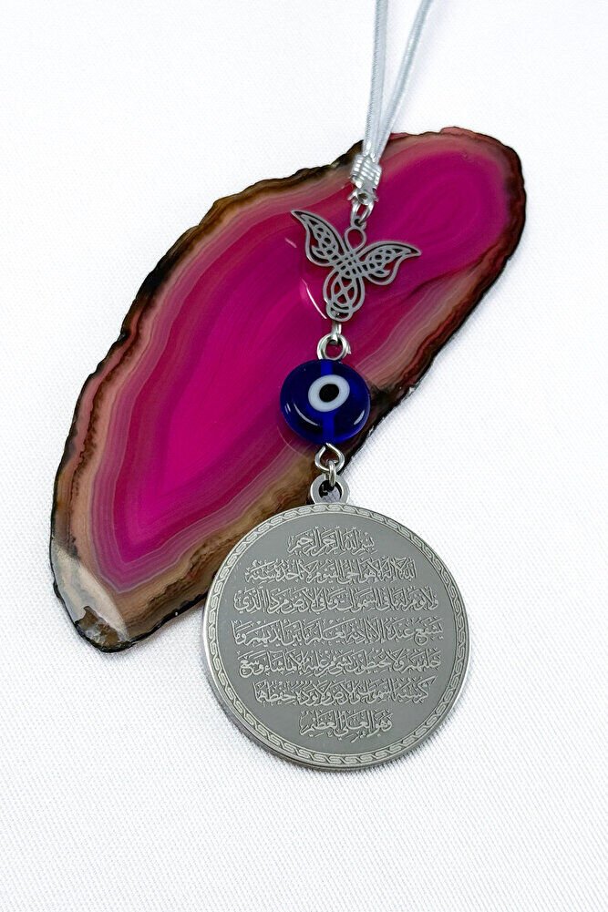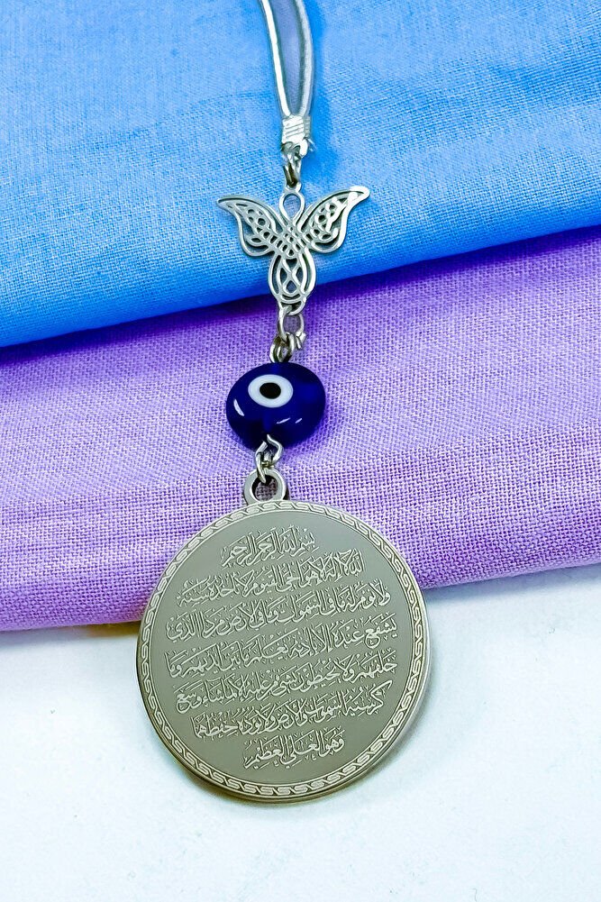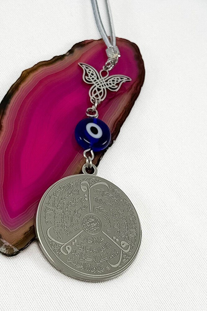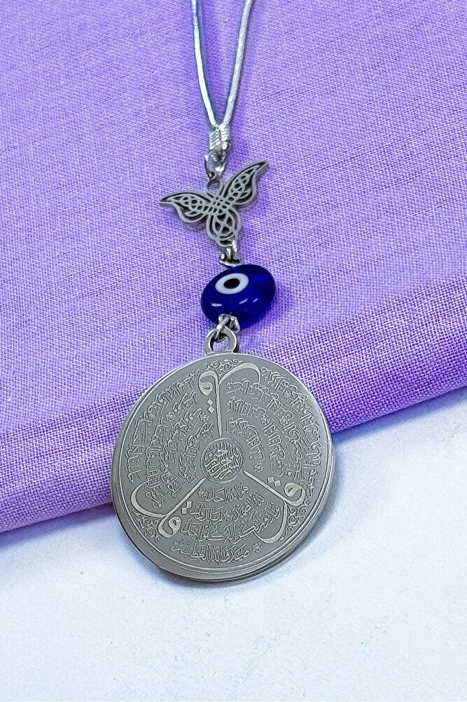 Dualar lazer kazıma tekniği ile kalıcı bir şekilde kazınmaktadır.; Kanatlı melek çeliktir ve çift taraflıdır.; Yassı nazar boncuğu el yapımıdır bundan kaynaklı ufak farklılık ve düzensizlikler olasıdır.; İp elastiktir.; Elastik olduğu için her modele rahatlıkla takılabilmektedir.; Plaka gümüş renkli paslanmaz çeliktir.; Ürün üzerinde bulunan metaller komple paslanmaz çeliktir.; Çelik plaka 3,5 cm ölçülerindedir.; Plaka çift taraflıdır.; Bir yüzünde Ayetel Kürsi diğer yüzünde ise Felak Nas İhlas bulunmaktadır.; Felak, Nas ve İhlas sureleri, İslam inancında korunma ve manevi güç sağlamak için okunan önemli dualardır.; İnanılır kabul edilir ki, Felak ve Nas sureleri, özellikle kötü gözlerden, nazardan ve şeytani etkilerden korunmak için okunur.; Felak suresi, karanlık güçlere karşı koruma sağlarken, Nas suresi de olumsuz düşünceler ve zararlı enerjilerden korunmayı sağlar.; İhlas suresi ise, Allah ın birliğini ve sınırsız gücünü ifade eder, bu sureye inanılır ki, kişi manevi huzur ve Allah ın koruması altında olur.; Bu sureler, sıkça güven ve huzur arayışında olanlar için okunur ve ruhsal dengeyi sağlamak isteyenlere büyük fayda sağladığına inanılır.; Ayetel Kürsi, İslam inancında en güçlü ve koruyucu dualardan biri olarak kabul edilir.; Ayetel Kürsi, Allah ın büyüklüğünü ve egemenliğini ifade eden bir ayet olup, koruma ve manevi güç sağlamak amacıyla sıkça okunur.; Bu ayet, göklerde ve yerin her şeyinin Allah a ait olduğunu vurgular ve şeytani etkilerden korunma sağlar.; Özellikle gece yatmadan önce okunmasının, güvende olma, zararlı enerjilerden korunma ve ruhsal huzur sağlama açısından büyük fayda verdiğine inanılır.; Aynı zamanda, Allah ın her şeyi bildiği ve her şeyin O na bağlı olduğu inancı ile kişiye manevi rahatlık ve güç verir.