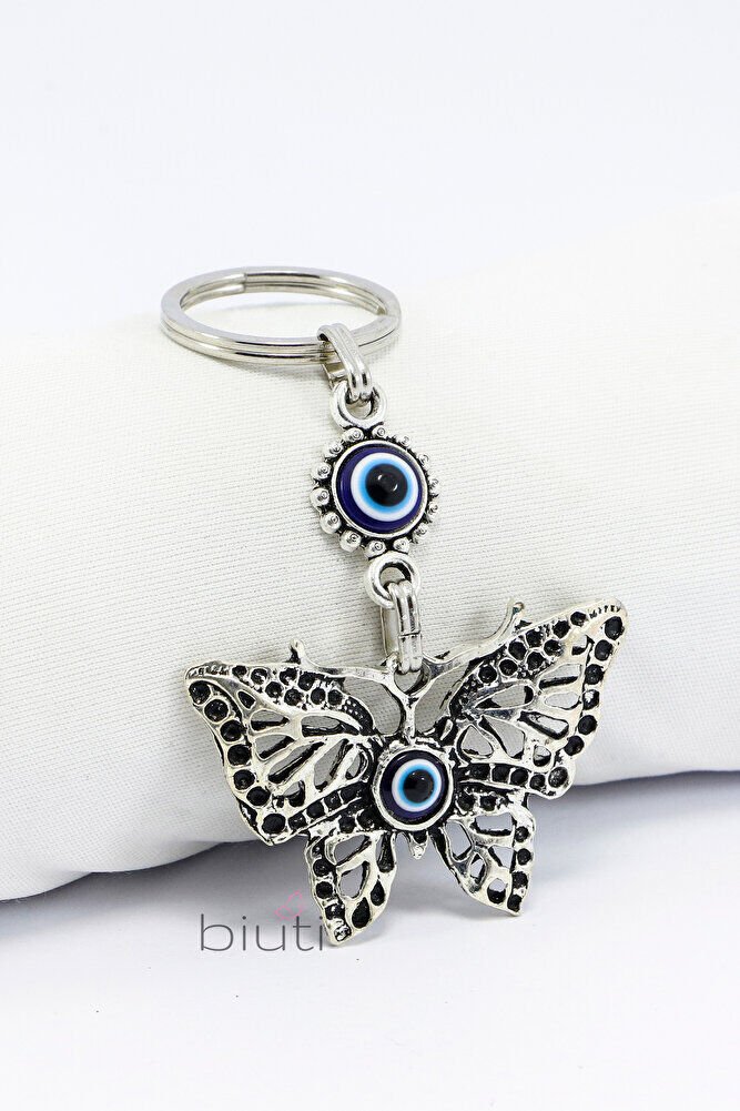Kelebek ve Nazar Boncuklu Metal Anahtarlık, Hediyelik Küçük Çanta Süsü