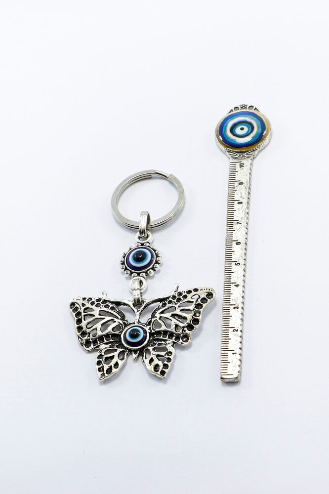 Zarif kelebek formu ve nazar boncuğu detaylarıyla tasarlanan bu metal anahtarlık, estetik görünümü ve anlamlı sembolleri bir araya getirir. İnce işçilikle hazırlanmış kelebek figürü, özgürlüğü ve dönüşümü simgelerken; üzerindeki nazar boncukları geleneksel kültürde kötü enerjilere karşı koruyucu bir sembol olarak kabul edilir.