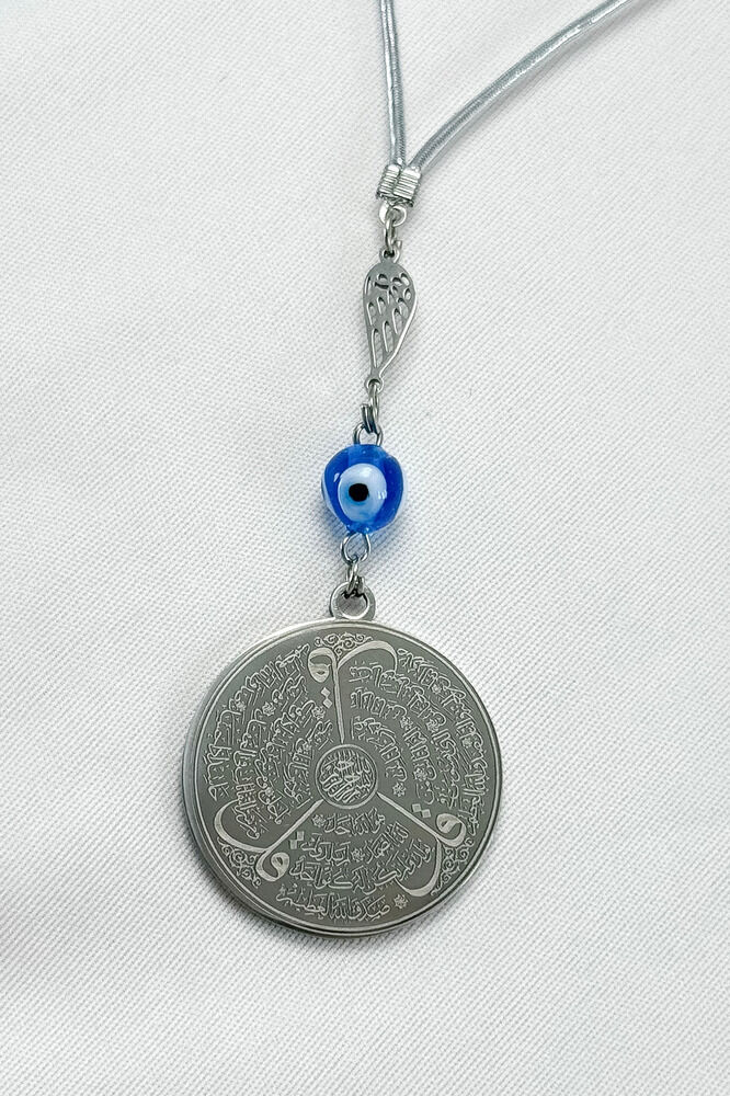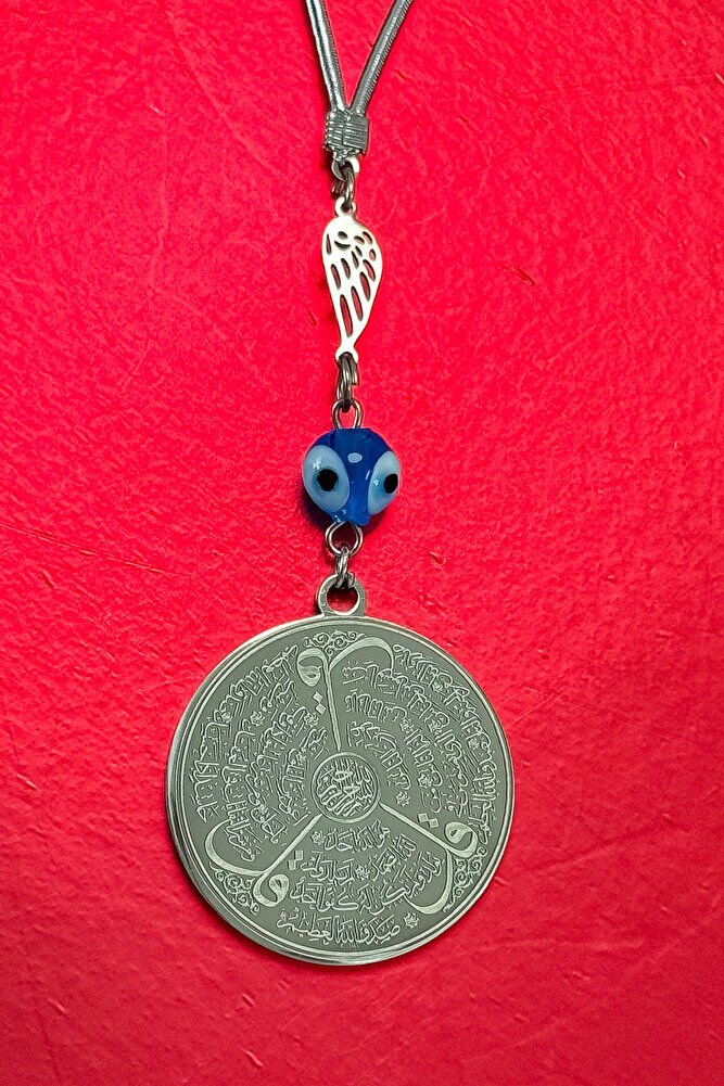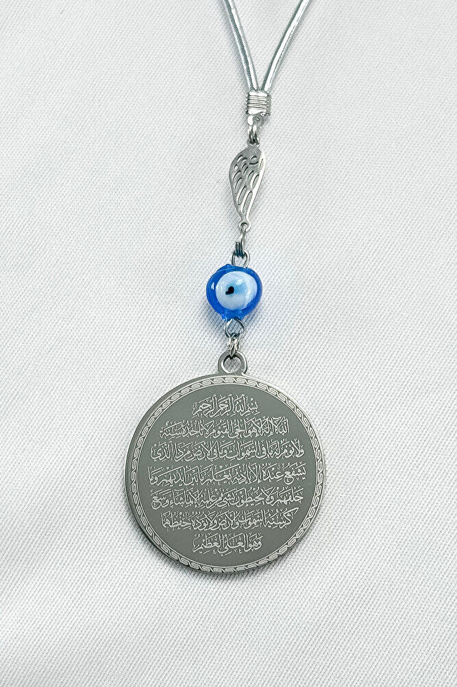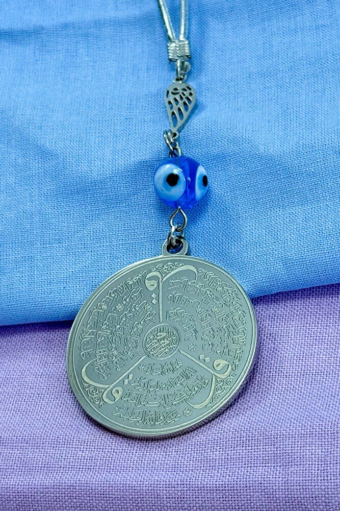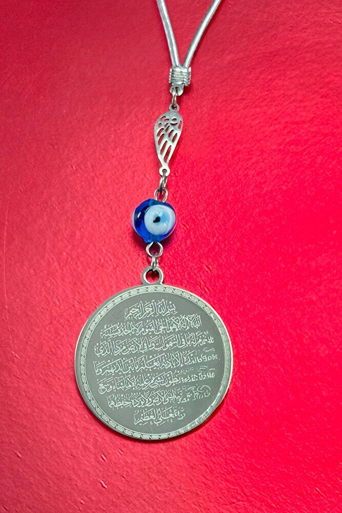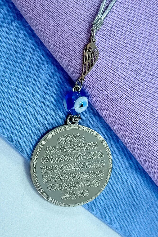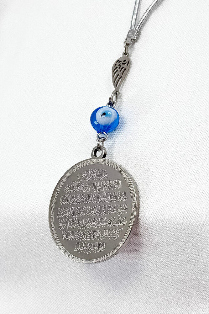 Dualar lazer kazıma tekniği ile kalıcı bir şekilde kazınmaktadır.; Küçük melek kanadı paslanmaz çeliktir ve çift taraflıdır.; Cam nazar boncuğu el yapımıdır bundan kaynaklı ufak farklılık ve düzensizlikler olasıdır.; İp elastiktir.; Elastik olduğu için her modele rahatlıkla takılabilmektedir.; Plaka gümüş renkli paslanmaz çeliktir.; Ürün üzerinde bulunan metaller komple paslanmaz çeliktir.; Çelik plaka 3,5 cm ölçülerindedir.; Plaka çift taraflıdır.; Bir yüzünde Ayetel Kürsi diğer yüzünde ise Felak Nas İhlas bulunmaktadır.; Felak, Nas ve İhlas sureleri, İslam inancında korunma ve manevi güç sağlamak için okunan önemli dualardır.; İnanılır kabul edilir ki, Felak ve Nas sureleri, özellikle kötü gözlerden, nazardan ve şeytani etkilerden korunmak için okunur.; Felak suresi, karanlık güçlere karşı koruma sağlarken, Nas suresi de olumsuz düşünceler ve zararlı enerjilerden korunmayı sağlar.; İhlas suresi ise, Allah ın birliğini ve sınırsız gücünü ifade eder, bu sureye inanılır ki, kişi manevi huzur ve Allah ın koruması altında olur.; Bu sureler, sıkça güven ve huzur arayışında olanlar için okunur ve ruhsal dengeyi sağlamak isteyenlere büyük fayda sağladığına inanılır.; Ayetel Kürsi, İslam inancında en güçlü ve koruyucu dualardan biri olarak kabul edilir.; Ayetel Kürsi, Allah ın büyüklüğünü ve egemenliğini ifade eden bir ayet olup, koruma ve manevi güç sağlamak amacıyla sıkça okunur.; Bu ayet, göklerde ve yerin her şeyinin Allah a ait olduğunu vurgular ve şeytani etkilerden korunma sağlar.; Özellikle gece yatmadan önce okunmasının, güvende olma, zararlı enerjilerden korunma ve ruhsal huzur sağlama açısından büyük fayda verdiğine inanılır.; Aynı zamanda, Allah ın her şeyi bildiği ve her şeyin O na bağlı olduğu inancı ile kişiye manevi rahatlık ve güç verir.;