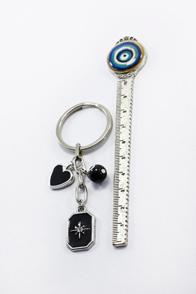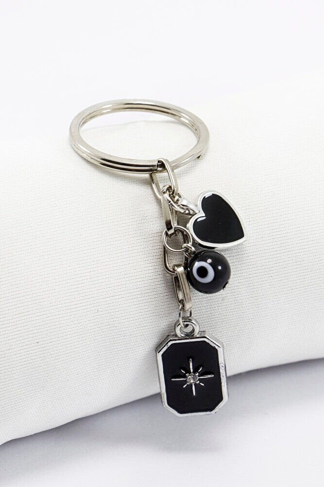 Küçük Siyah Kuzey Yıldızı Kalp Cam Nazar Boncuğu Anahtarlık, Hediyelik Çanta Süsü