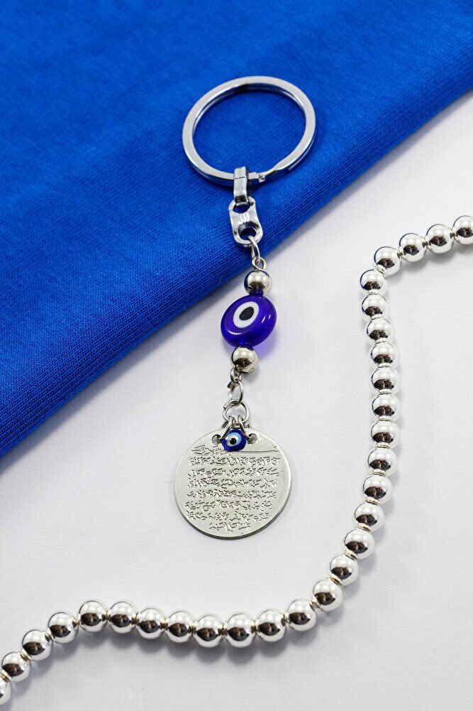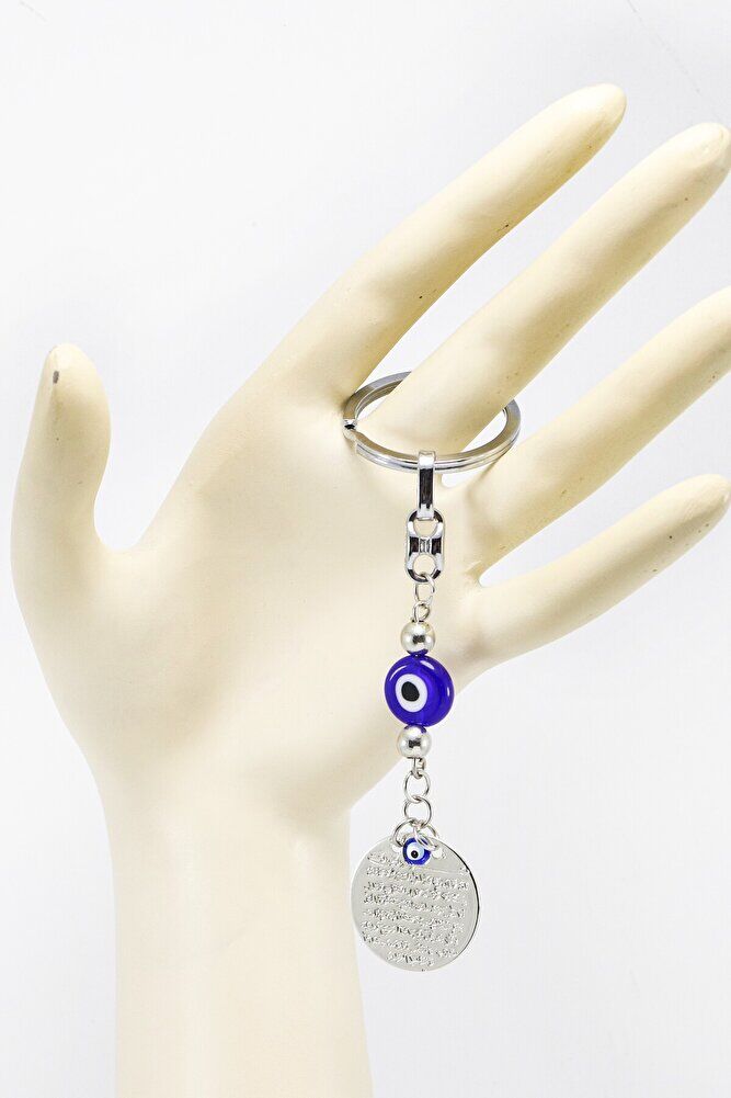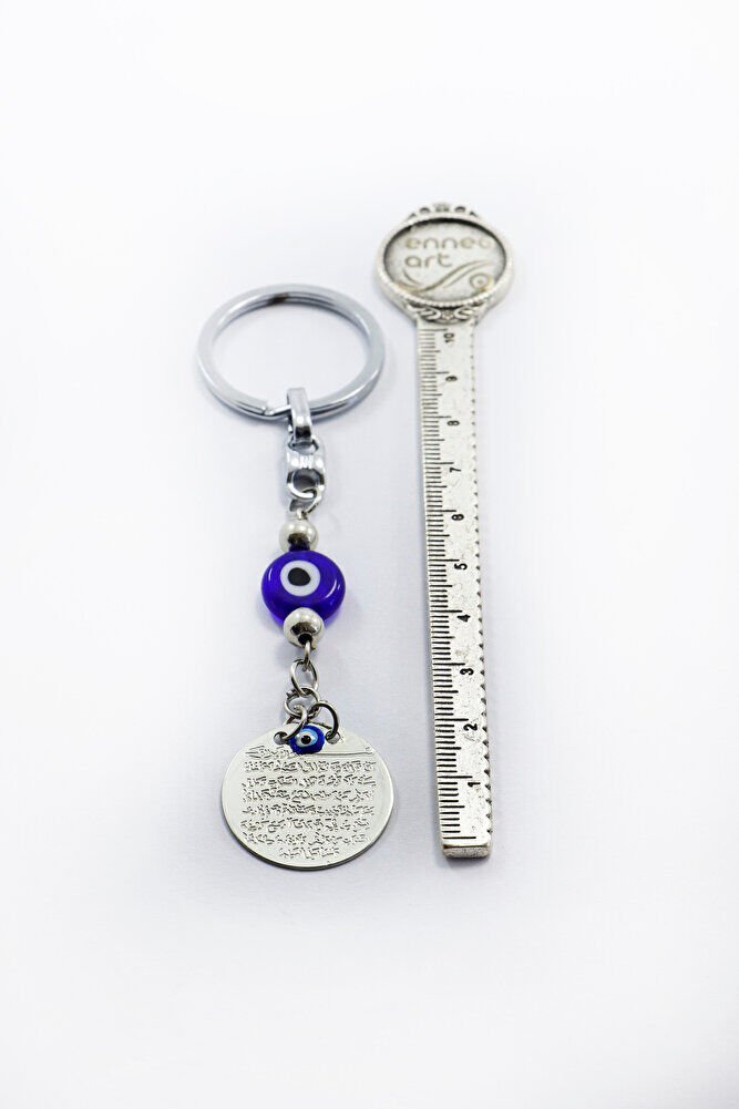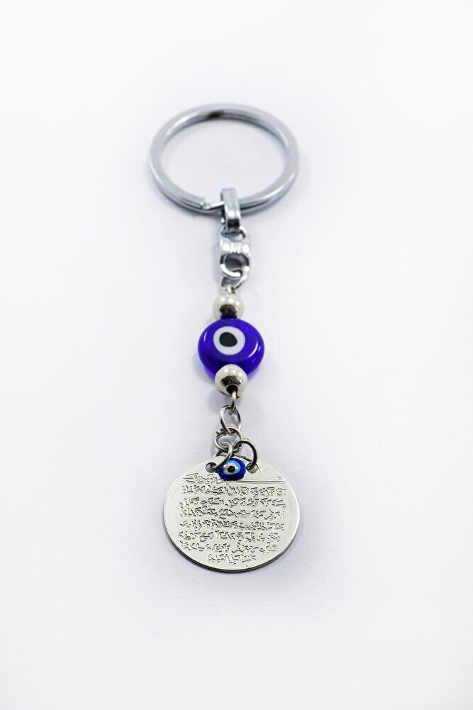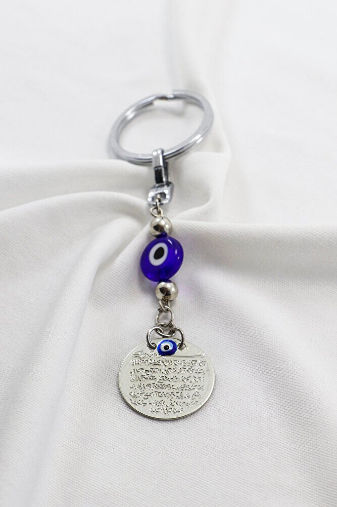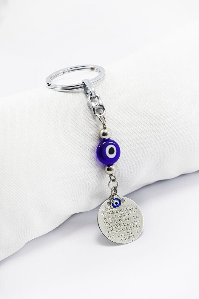 Lacivert Cam Nazar Boncuklu Metal Ayet'el Kürsi Metal Anahtarlık, Hediyelik Nazarlı Anahtarlık