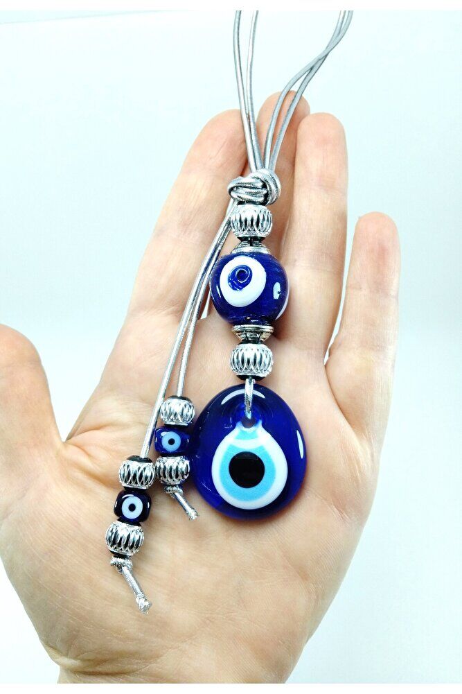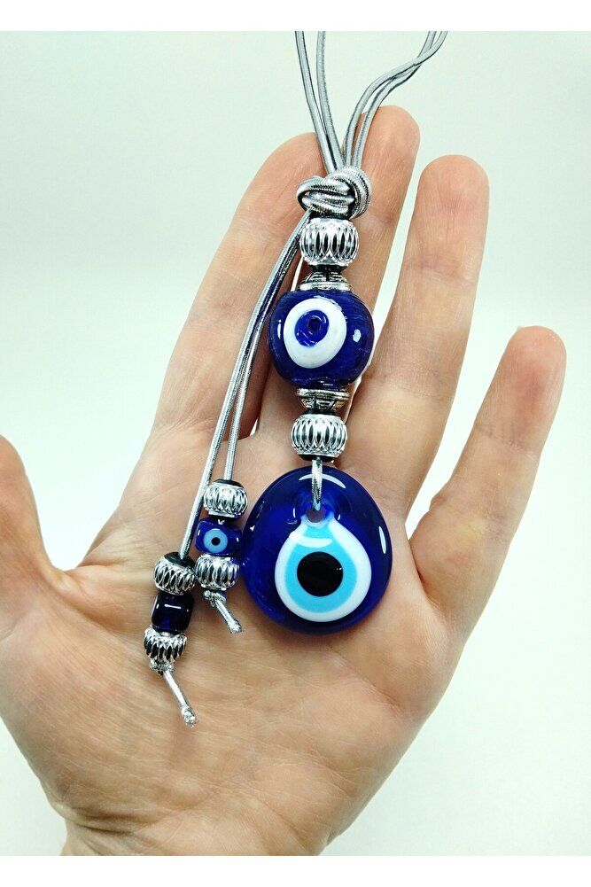 Ürün el yapımıdır. ; Özel tasarım lüks araba süsüdür. ; Duvar dekoru olarak da kullanılabilir. ; Cam boncuk 3-3,5 cm boyutundadır. ; Gümüş renkli ip esnektir. ; Cam boncuklar el yapımı oldukları için ufak farklılık ve düzensizlikler olasıdır. ; Türk kültüründe geleneksel olarak"nazar boncuğu" olarak bilinen bu güçlü sembolün kötülükleri savuşturduğuna ve iyi şans getirdiğine inanılır. ; Her cam boncuk yetenekli zanaatkarlar tarafından titizlikle işlenir ve bu her parçayı benzersiz kılar. ; Nazar boncuğunu, müşterilerimize duvar süsü, anahtarlık, araba aksesuarı, kapı süsü, magnet gibi farklı formatlarda sunuyoruz. ; Nazar tılsımının dünyadaki çeşitli kültürlerde farklı isimleri vardır. ; Arapça'da "aynal-hasud" veya "haset gözü", Yunanca'da "mati"veya "????" olarak bilinir. ; Adı ne olursa olsun, nazar boncuğunun gücüne olan inanç evrenseldir.;