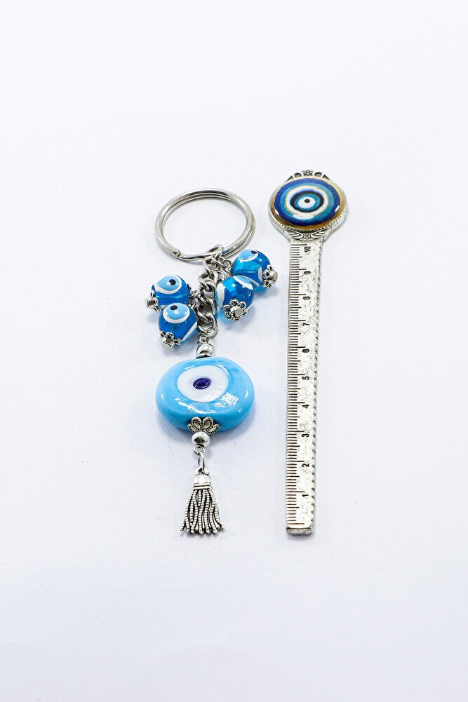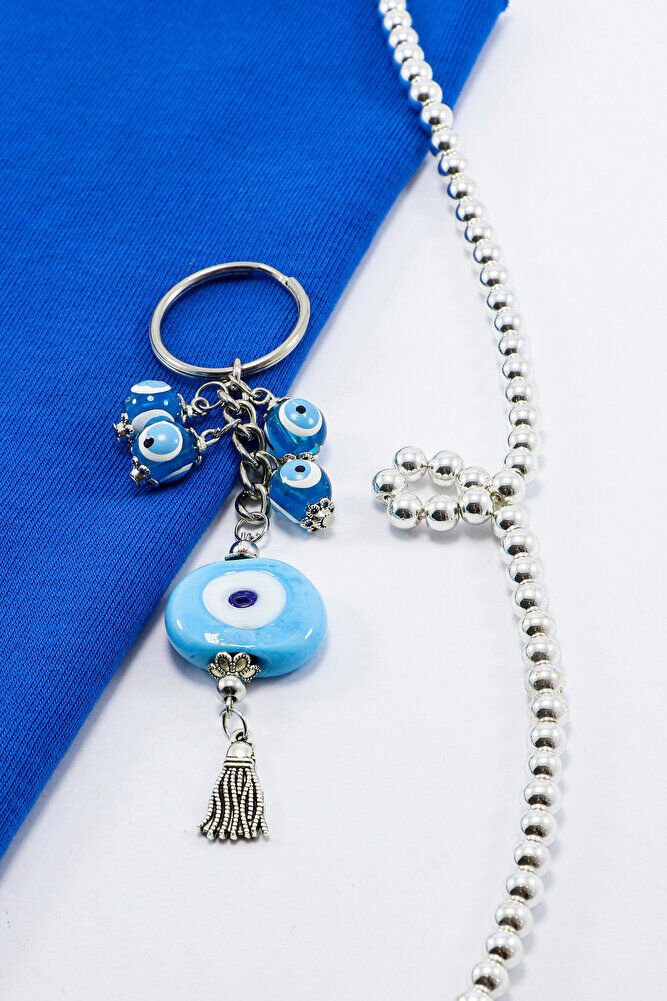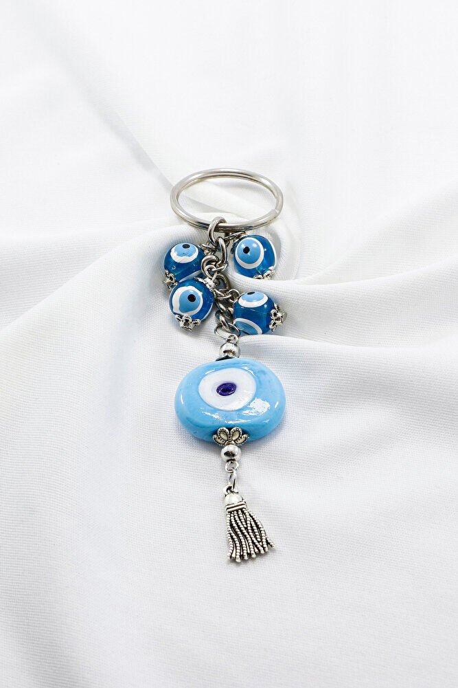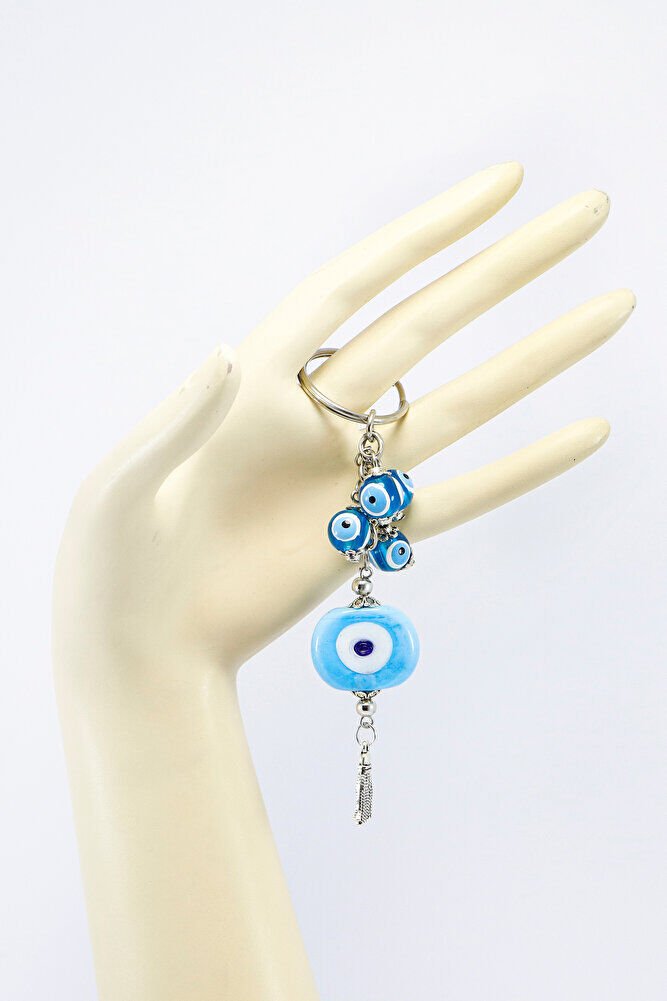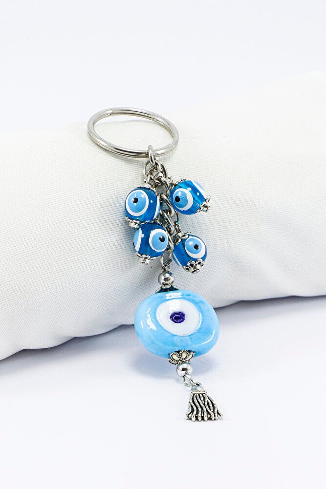 Mavi Danagözü Nazar Boncuğu Metal Püsküllü Anahtarlık, Turkuaz Nazar Salkımlı Küçük Çanta Süsü