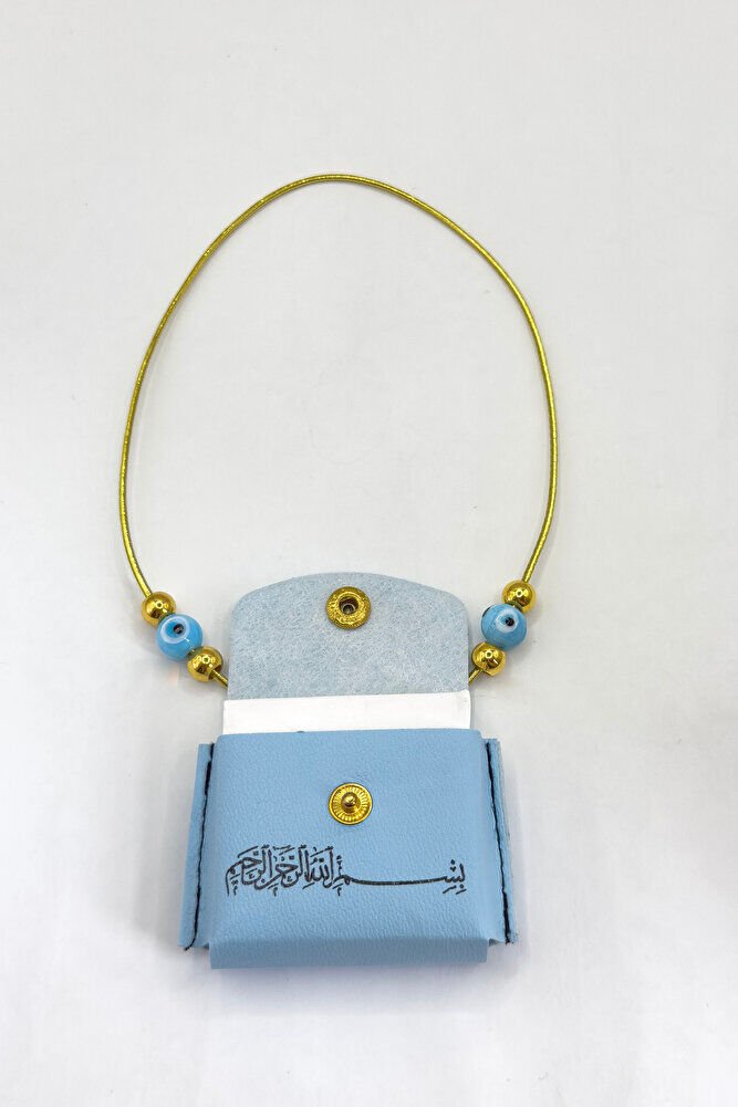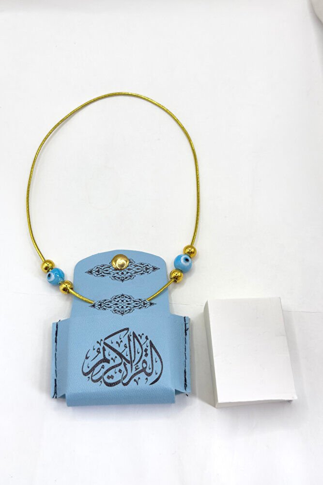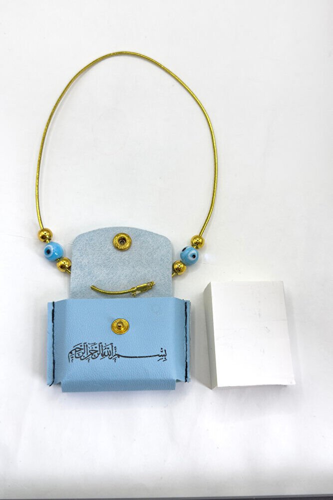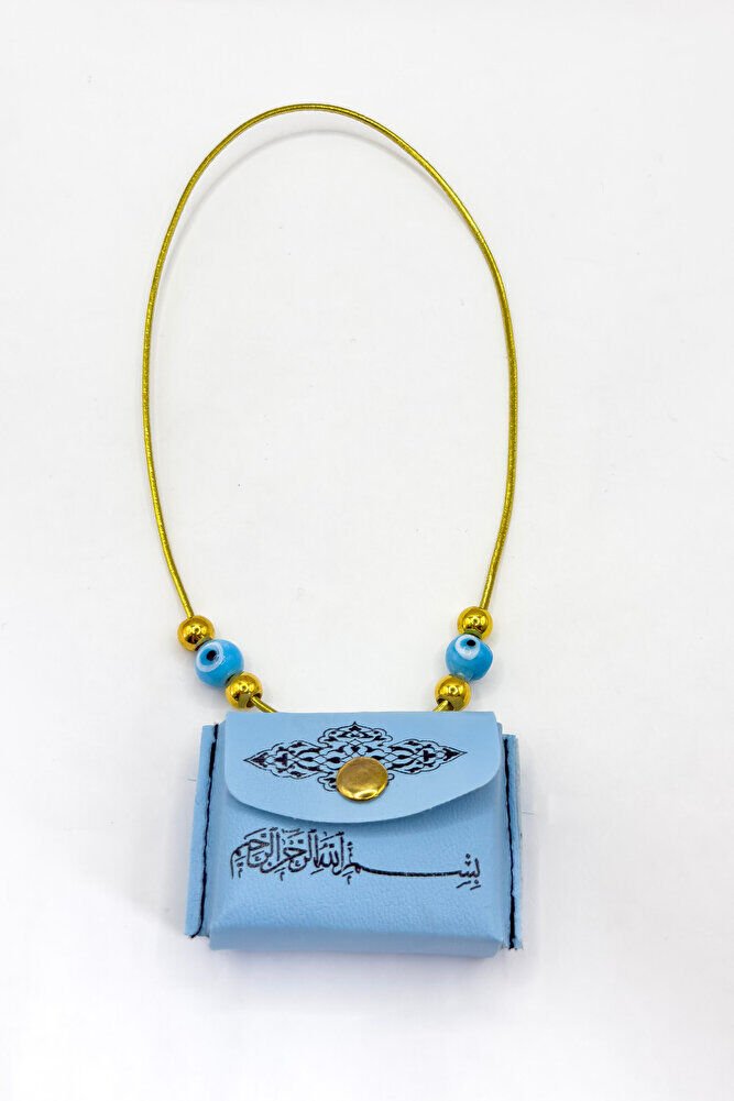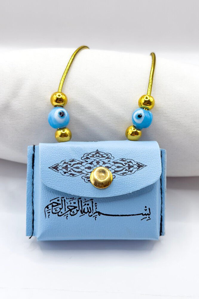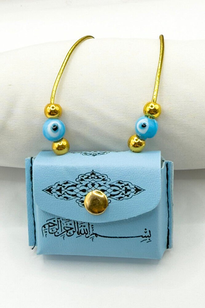 Mavi Nazar Boncuklu Deri Çantalı Mini Kur'an-ı Kerim Lastikli Araba Dikiz Ayna Süsü, Araba Hediyesi