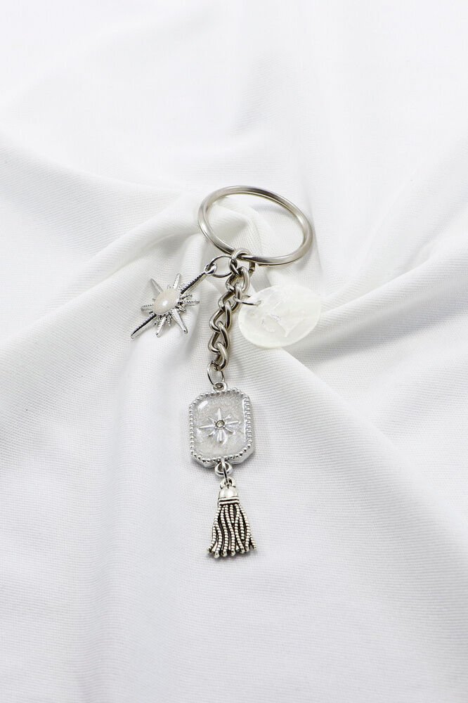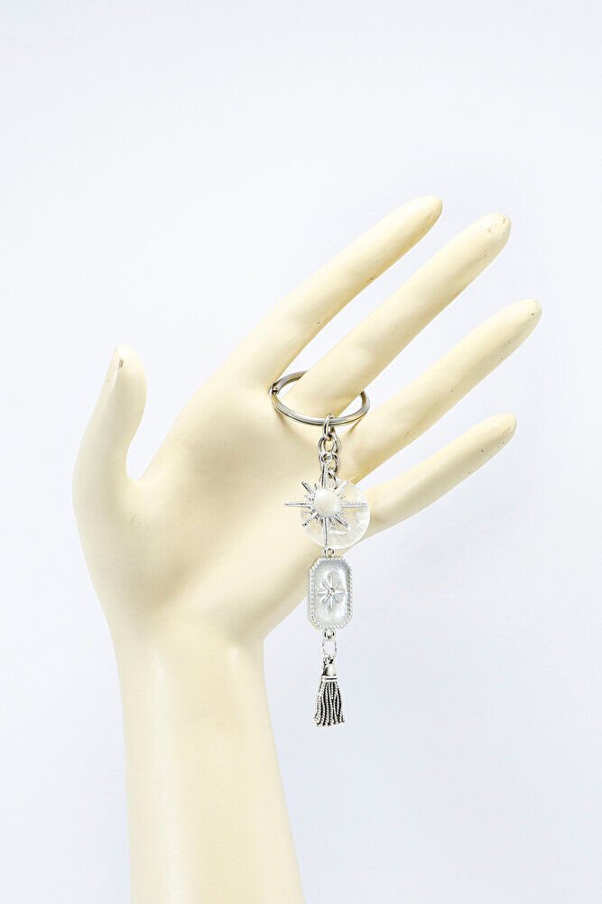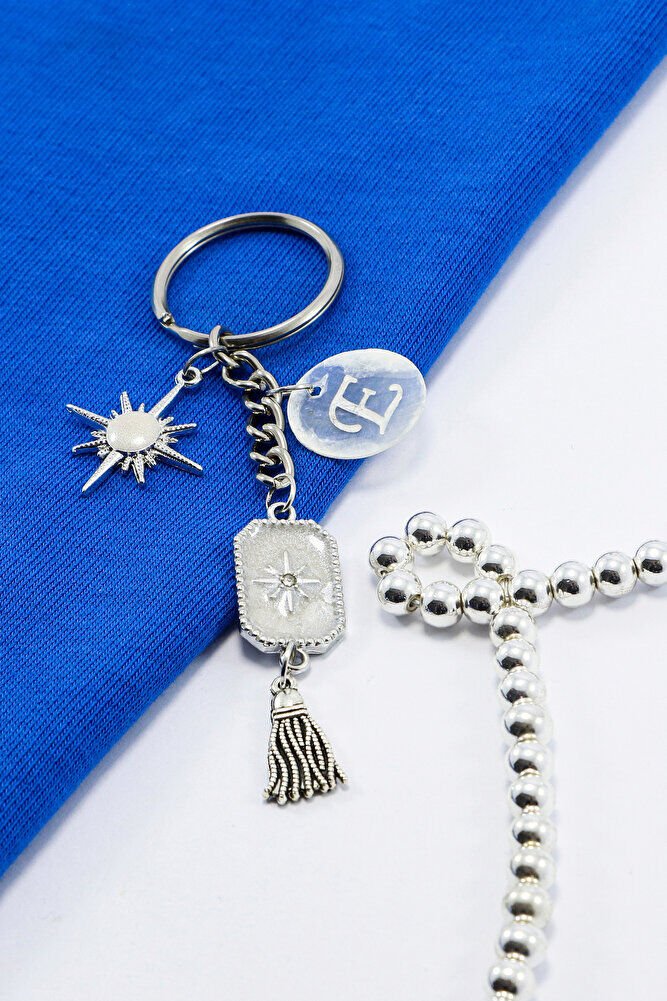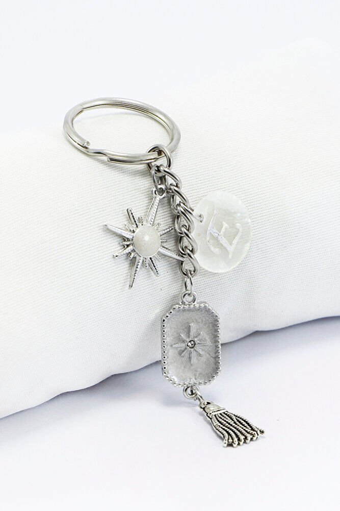 Zarif metal detaylarla tasarlanan bu anahtarlık, güneş figürü, E harfli plaka ve inci görünümlü yüzeyiyle tamamlanmıştır. Zincir ucundaki metal püskül detayı tasarıma hareketli ve şık bir görünüm kazandırır.