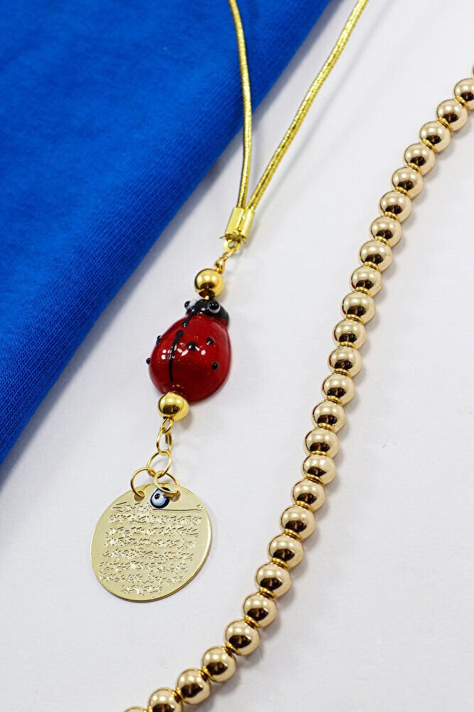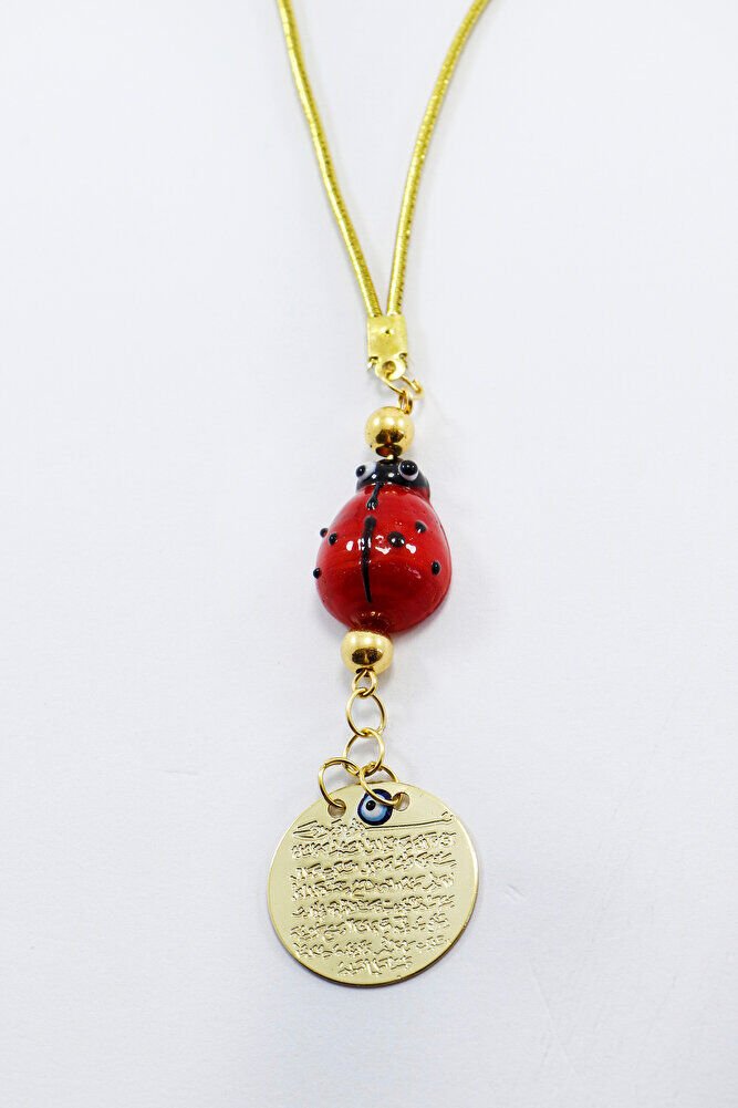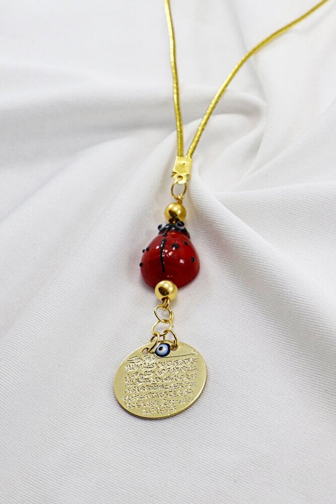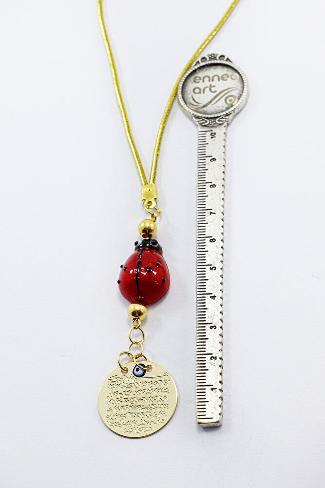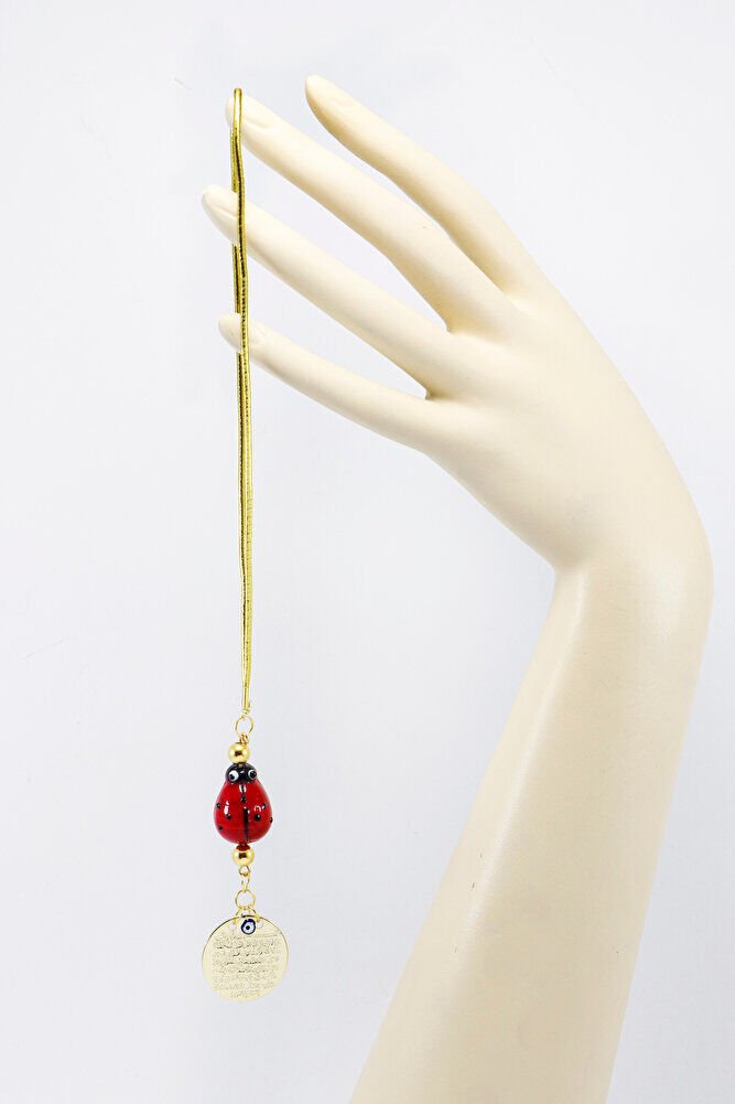 Ürün metaldir.; ; Uğur böceği el yapımı camdır.; Gold renkli metalik ip elastiktir.; ; Nazar boncuğu el yapımı mine olduğu için ufak farklılık ve düzensizlikler olasıdır.; ; Türk kültüründe geleneksel olarak"nazar boncuğu" olarak bilinen bu güçlü sembolün kötülükleri savuşturduğuna ve iyi şans getirdiğine inanılır.; ; Her cam boncuk yetenekli zanaatkarlar tarafından titizlikle işlenir ve bu her parçayı benzersiz kılar.; ; Nazar boncuğunu, müşterilerimize duvar süsü, anahtarlık, araba aksesuarı, kapı süsü, magnet gibi farklı formatlarda sunuyoruz.; ; Nazar tılsımının dünyadaki çeşitli kültürlerde farklı isimleri vardır.; ; Arapça'da "aynal-hasud" veya "haset gözü", Yunanca'da "mati" olarak bilinir.; ; Adı ne olursa olsun, nazar boncuğunun gücüne olan inanç evrenseldir.;
