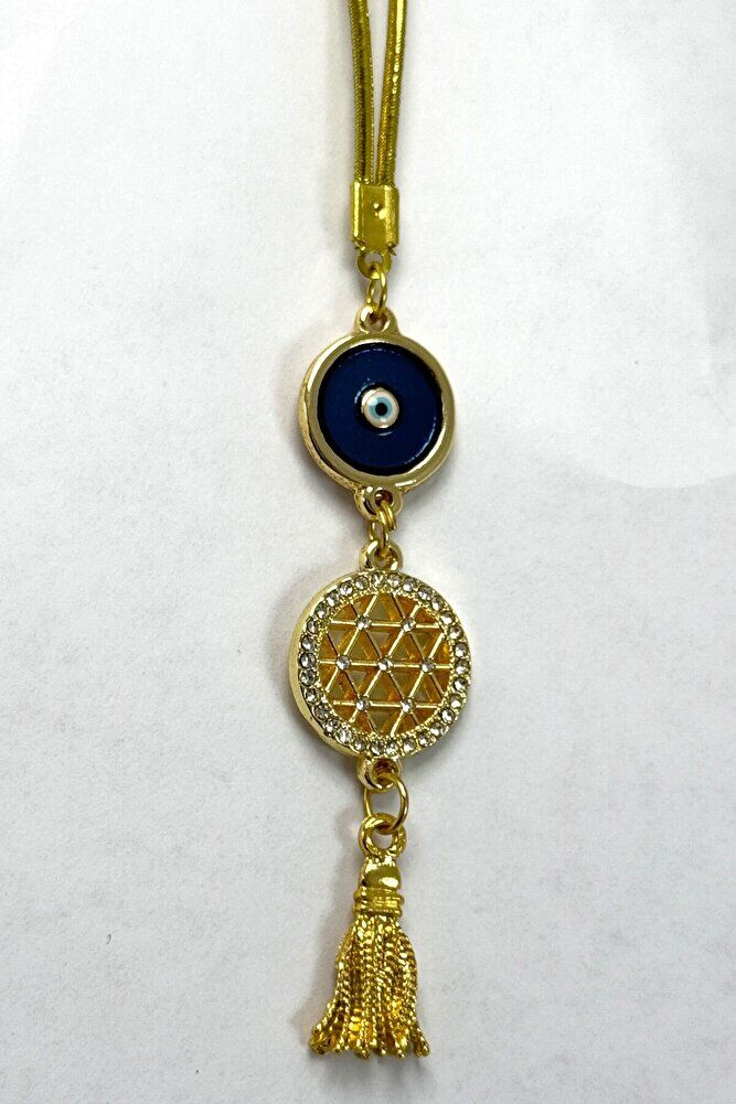 Mineli Nazar Püskül Detaylı Parlak Taşlı Gold Yaşam Çiçeği Araba Dikiz Ayna Süsü, Araba Hediyesi