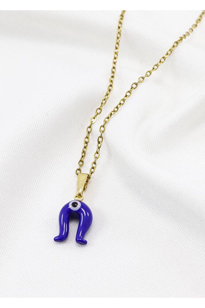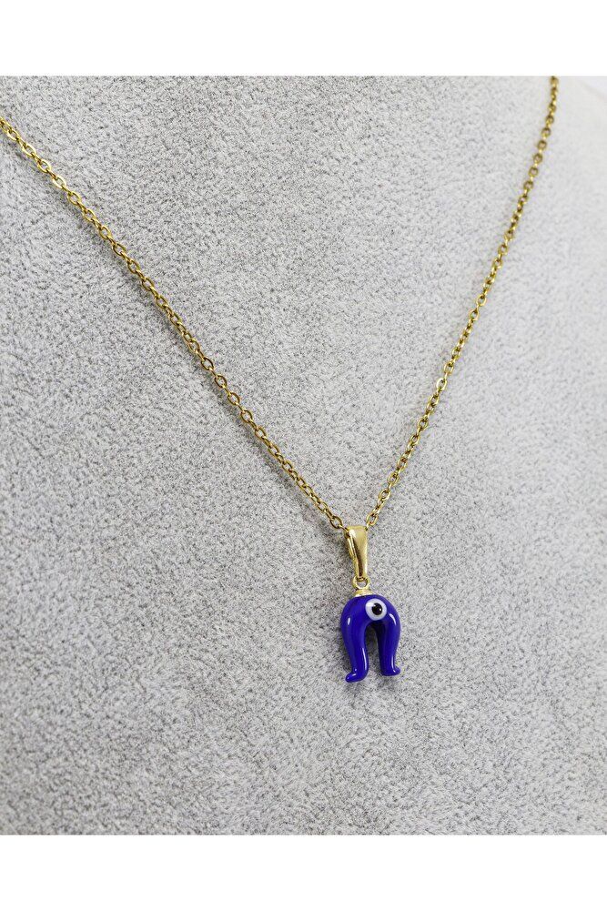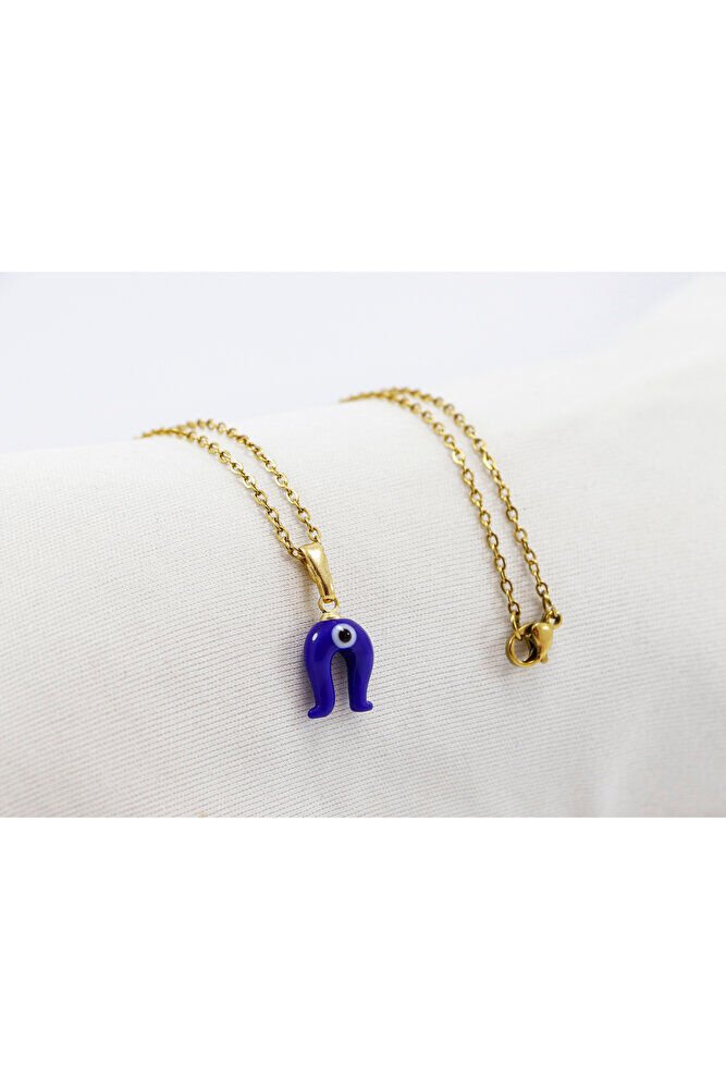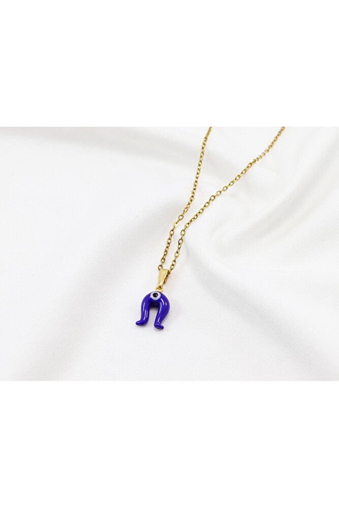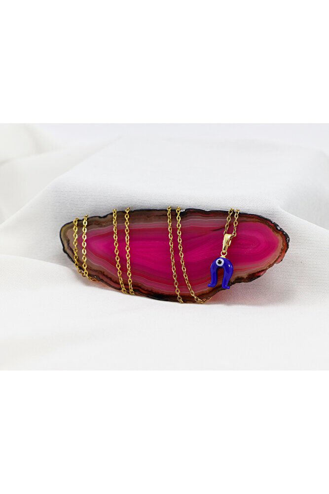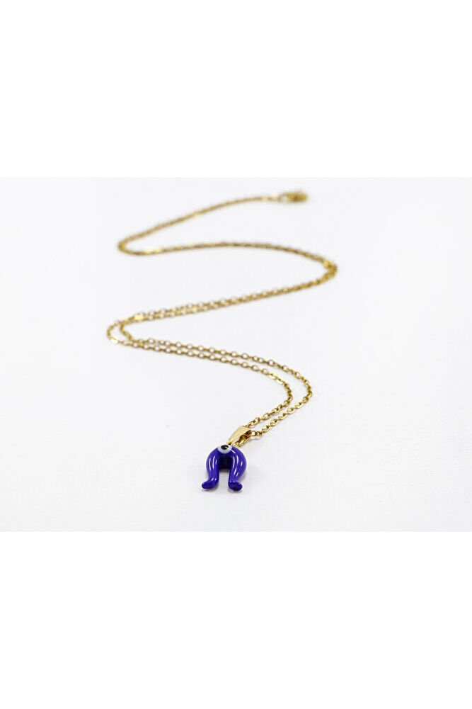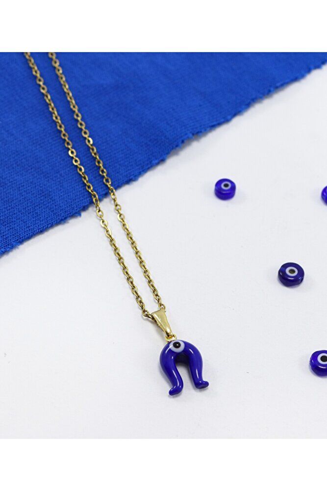 Lacivert nazar boncuklu nal figürü camdır.; Gold Zincir 60 cm dir ve paslanmaz çeliktir.;