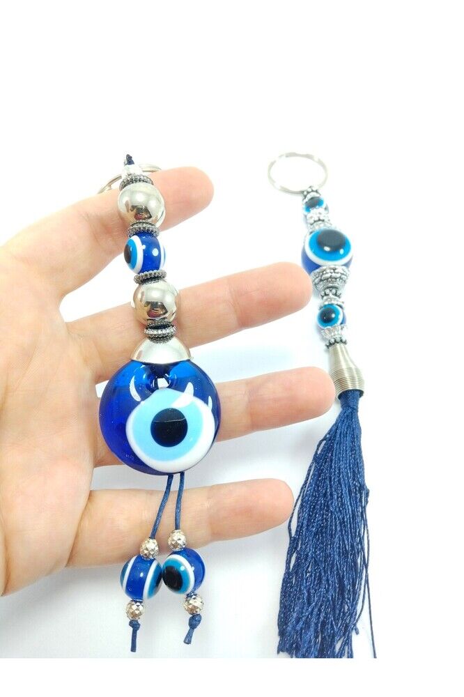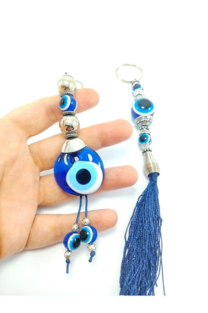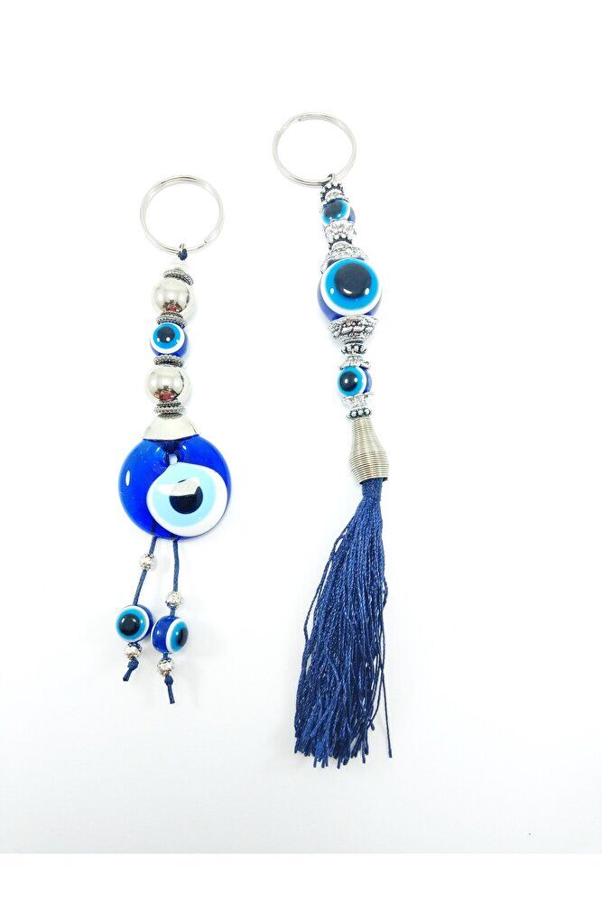 Nazar Boncuğu Anahtarlık / Dikiz Ayna Süsü Metalik Boncuklu Cam Hediyelik Aksesuar Ikili Set