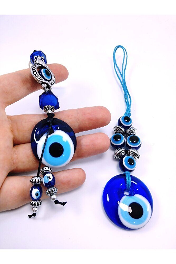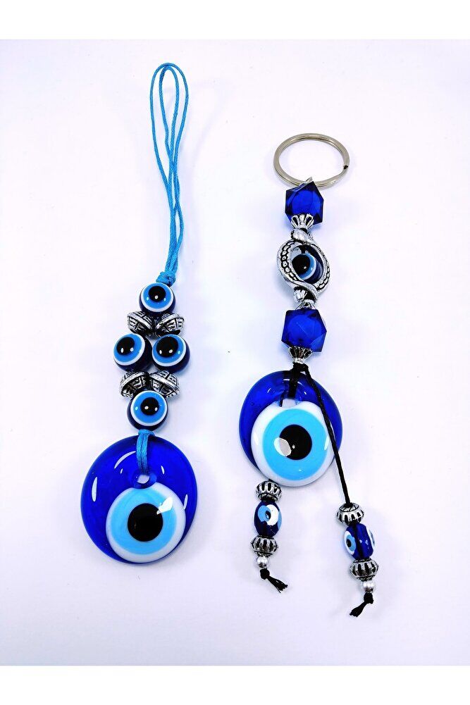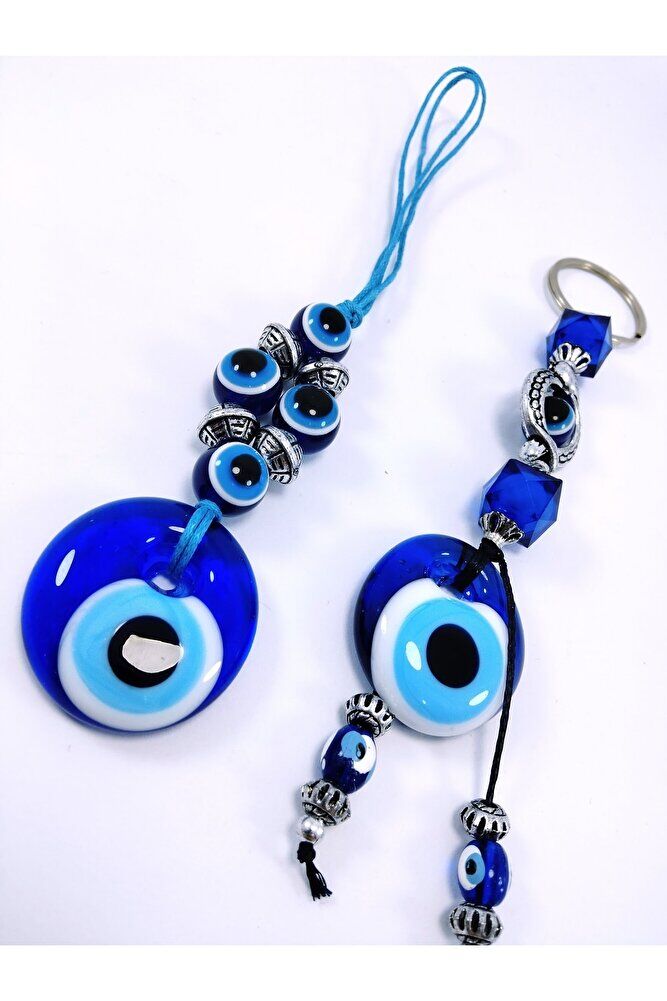 Nazar Boncuğu Araba Dikiz Ayna Süsü + Anahtarlık Ikili Set El Yapımı Cam Hediyelik Eşya Seti