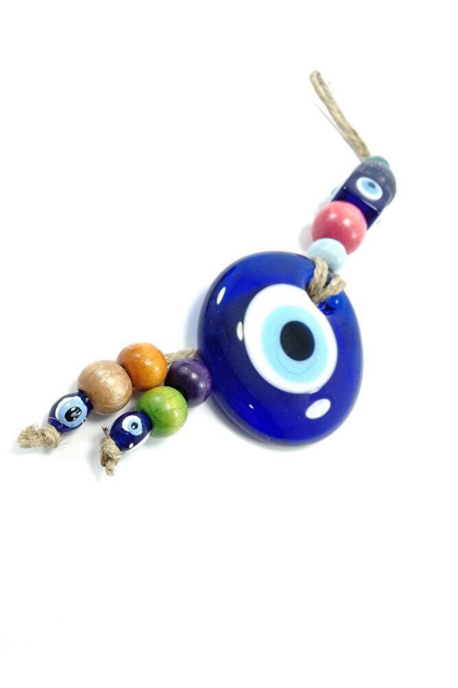 Büyük cam boncuk 5 cm boyutundadır. ; Küçük boncukların rengi farklı olabilir .El yapımı olduğu için ufak farklılık ve düzensizlikler olasıdır. ; Nazar boncuğu, Türk kültüründe ve diğer bazı Orta Doğu ülkelerinde kullanılan bir tür koruyucu nesnedir. ; Genellikle mavi ve beyaz renklerde tasarlanan küçük bir boncuktur ve içinde siyah bir nokta veya göz şekli bulunur.Nazar boncuğunun amacı, kişinin üzerindeki kötü şansı, kıskançlığı veya nazarı (bakışları) uzaklaştırmak ve korumak için kullanılır. ; Bu nedenle, evlerde, arabalarda, iş yerlerinde, takılarda ve hatta bebeklerin kıyafetlerinde kullanılabilir.;