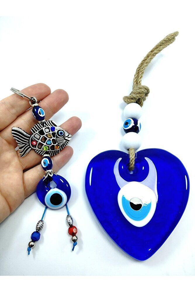 Nazar Boncuğu Seti Kalp Duvar Dekoru Balıklı Anahtarlık El Yapımı Cam Hediyelik Ikili Set