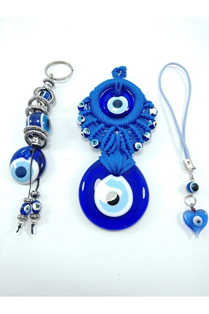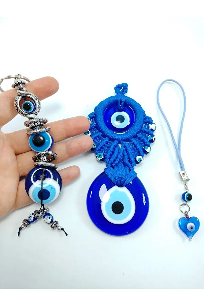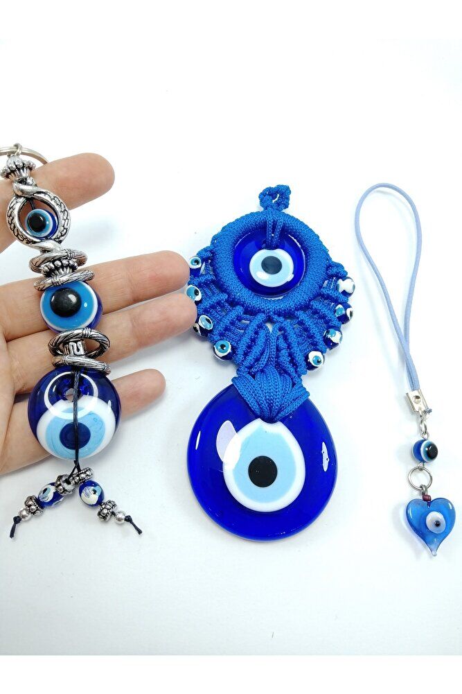 Nazar Boncuğu Üçlü Set Makrome Duvar Dekoru Anahtarlık Ve Kalp Araba Süsü