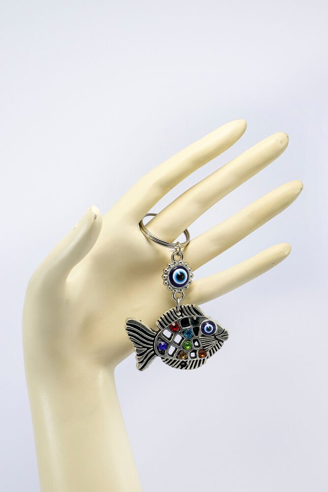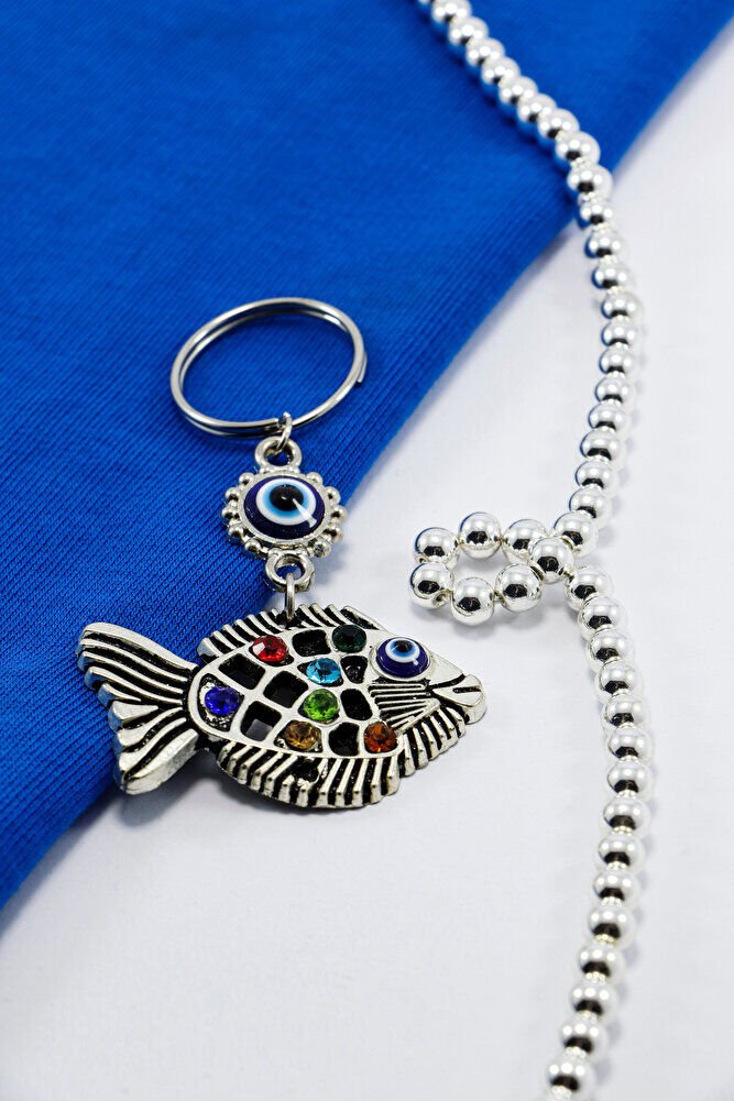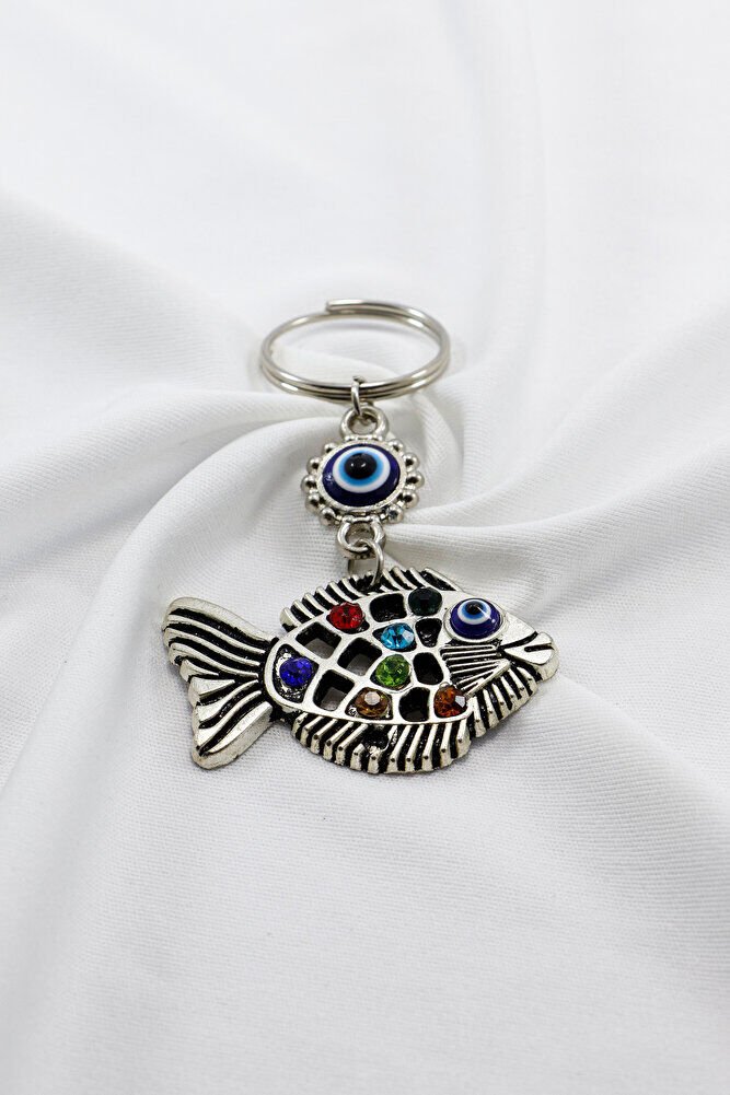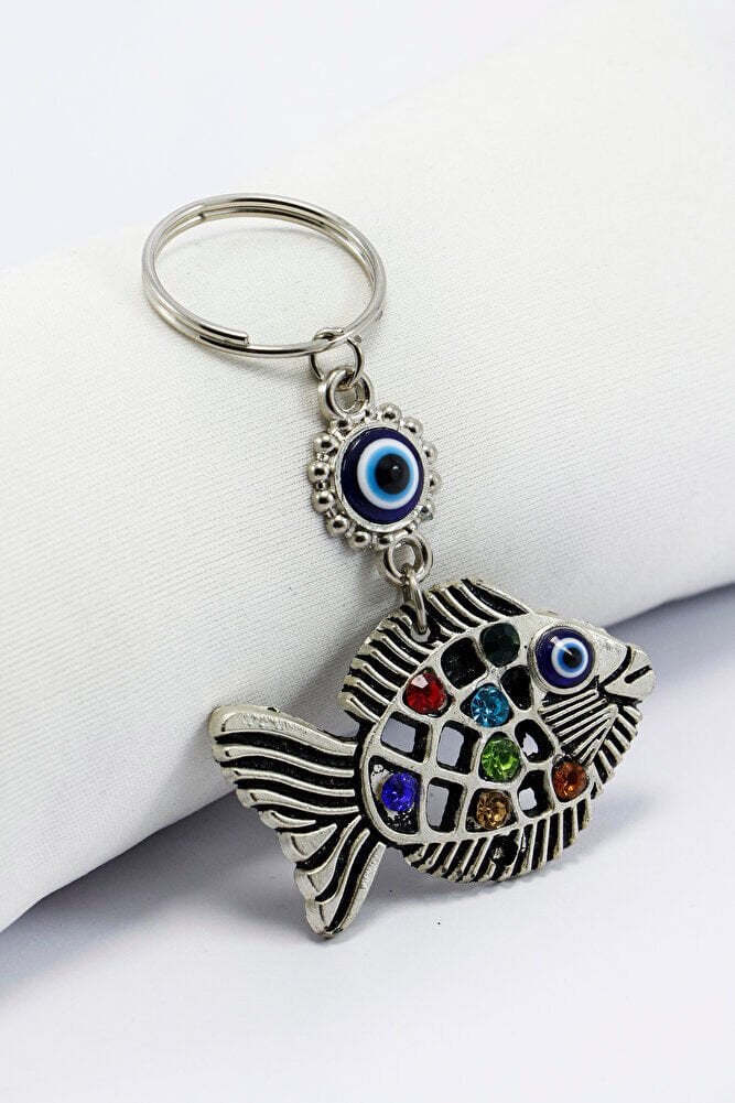 Nazar Boncuklu Parlak Taşlı Metal Balık Anahtarlık, Çanta Süsü
