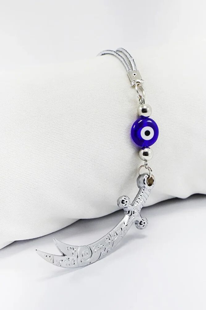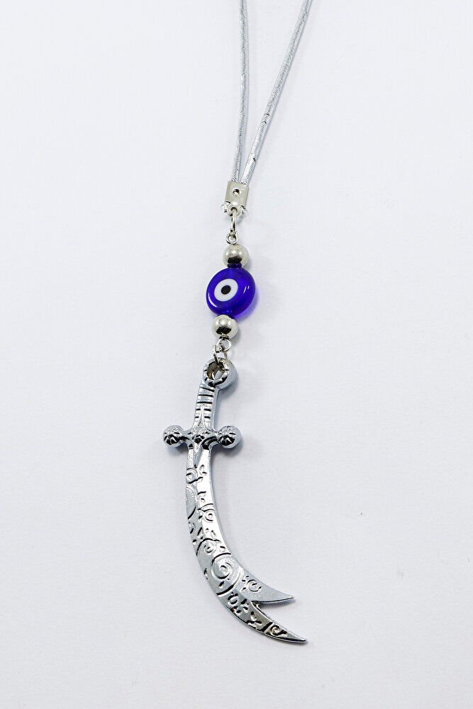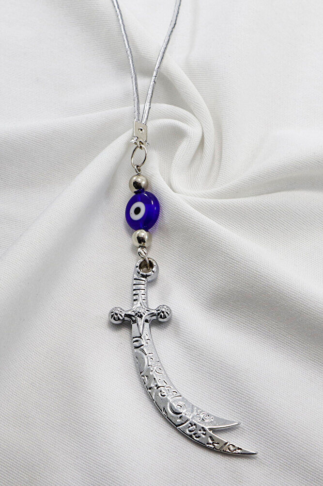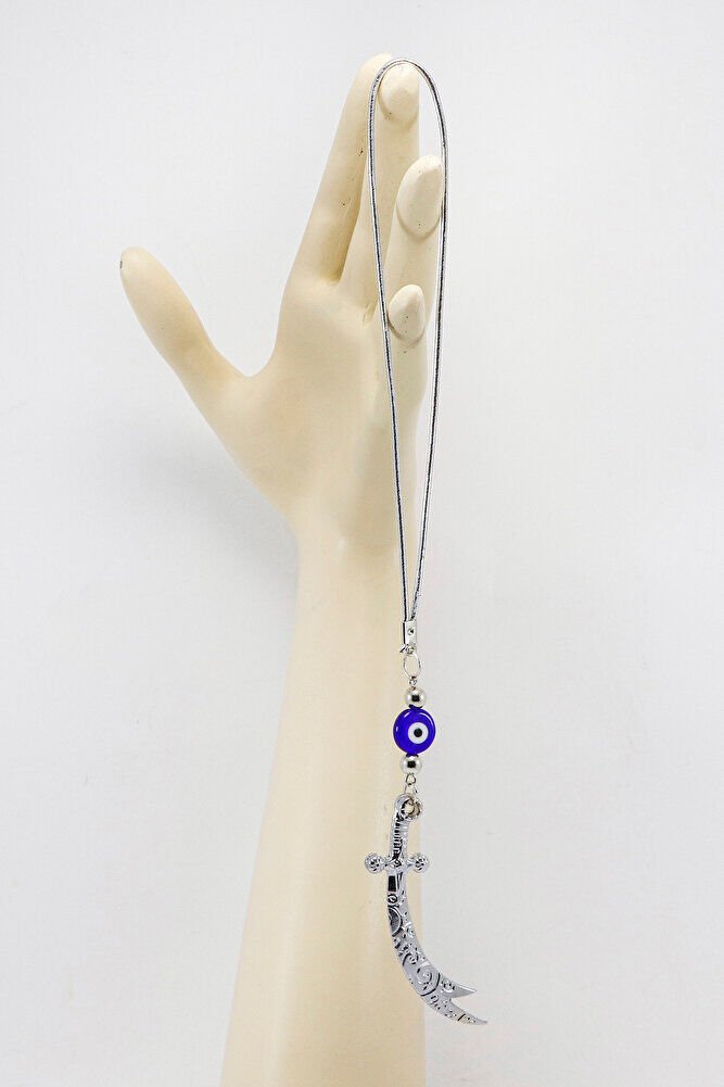 Parlak Lacivert Cam Yassı Nazar Boncuklu Zülfikar Kılıcı Araba Dikiz Ayna Süsü