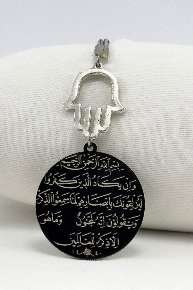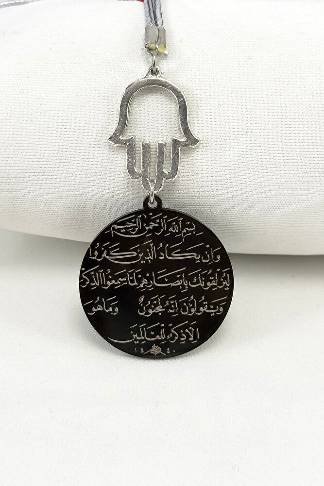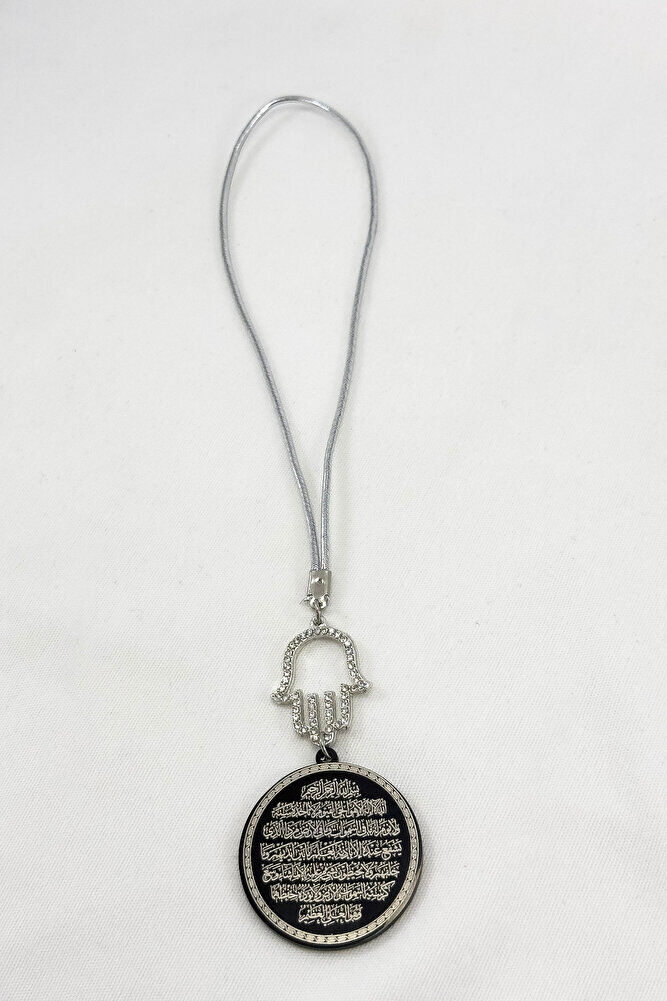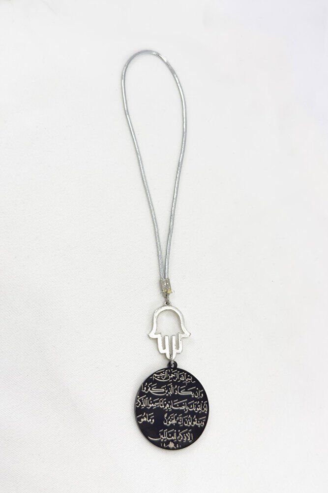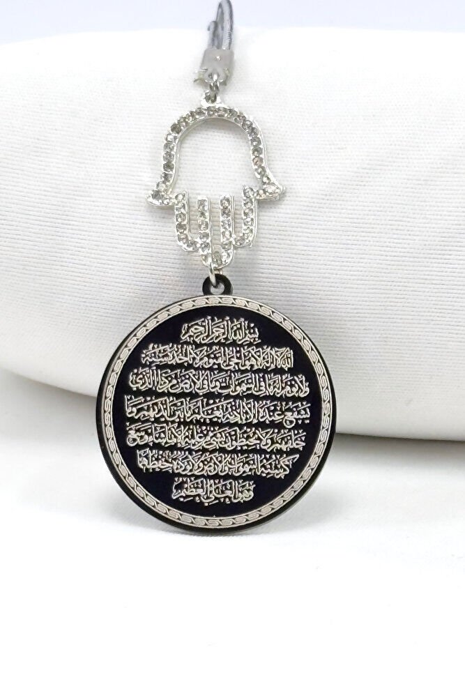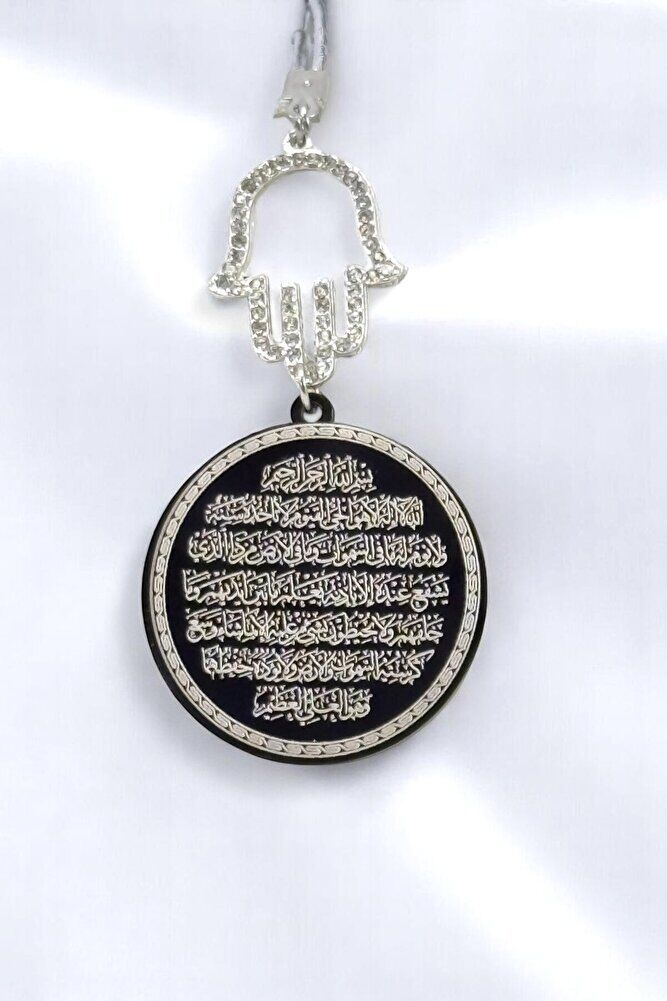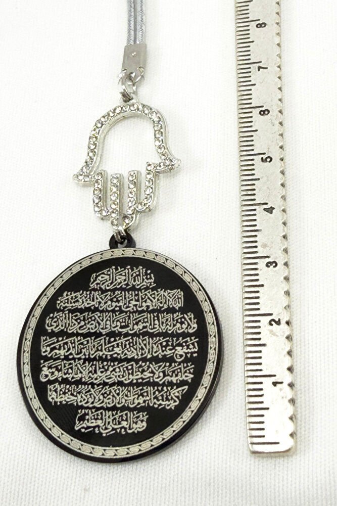 Parlak Taşlı Hamse Siyah Çelik Çift Taraflı Ayetel Kürsi /Nazar Ayeti Araba Dikiz Ayna Süsü