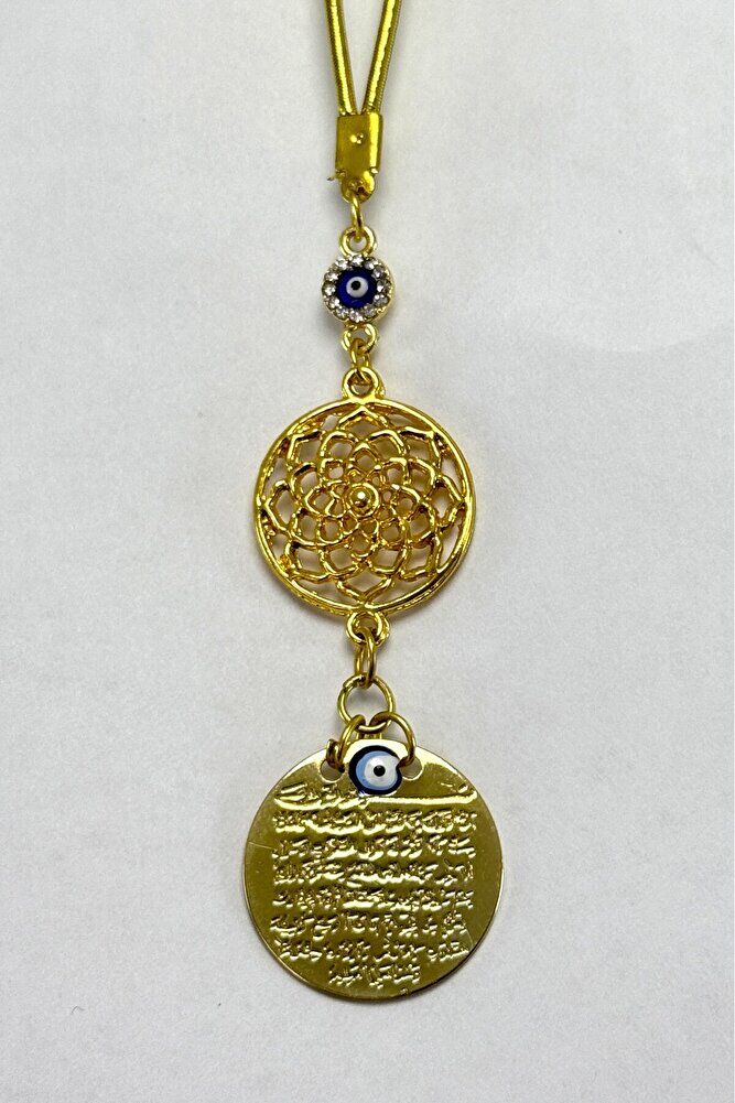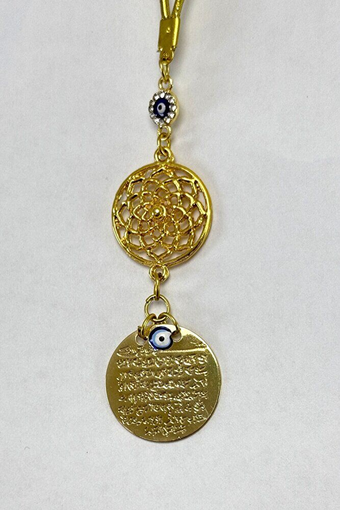Parlak Taşlı Küçük Nazar ve Lotus Çiçeği Detaylı Metal Ayetel Kürsi Araba Dikiz Ayna Süsü