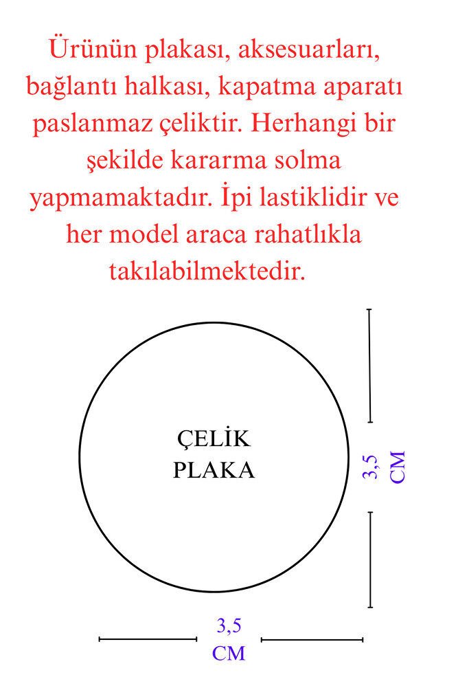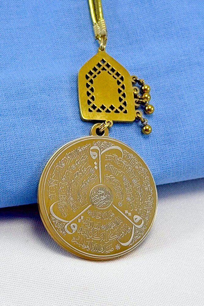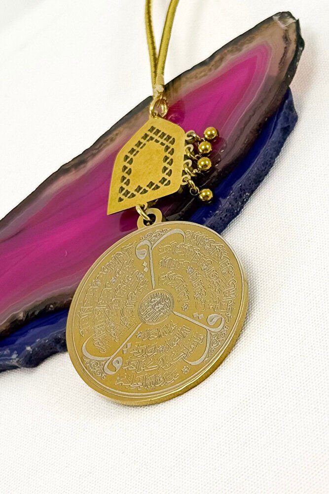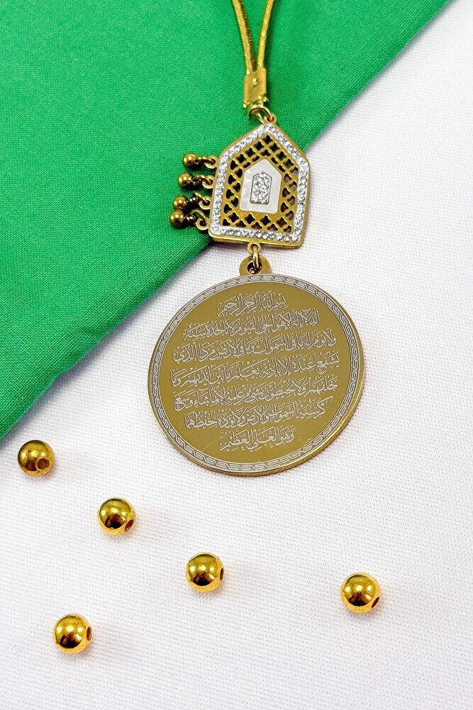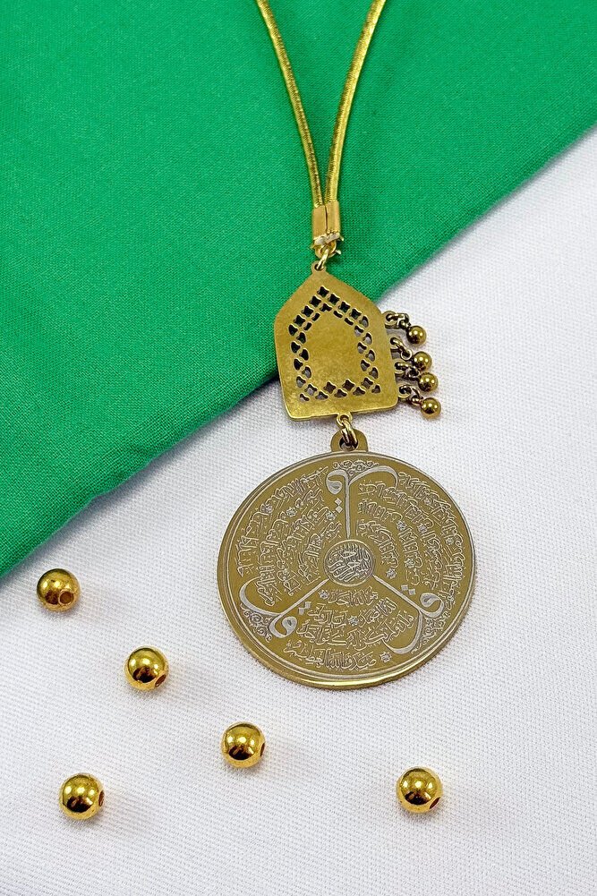 Dualar lazer kazıma tekniği ile kalıcı bir şekilde kazınmaktadır.; Parlak Taşlı Salkım Topçuklu kare figürü paslanmaz çeliktir ve tek taraflıdır.; Ayetel kürsi yazılı yüzünde bulunmaktadır.; Ürün el yapımıdır el yapımı olduğu için ufak farklılık ve düzensizlikler olasıdır.; İp elastiktir.; Elastik olduğu için her modele rahatlıkla takılabilmektedir.; Plaka altın renkli paslanmaz çeliktir.; Ürün üzerinde bulunan metaller komple paslanmaz çeliktir.; Çelik plaka 3,5 cm ölçülerindedir.; Plaka çift taraflıdır.; Bir yüzünde Ayetel Kürsi diğer yüzünde ise Felak Nas İhlas bulunmaktadır.; Felak, Nas ve İhlas sureleri, İslam inancında korunma ve manevi güç sağlamak için okunan önemli dualardır.; İnanılır kabul edilir ki, Felak ve Nas sureleri, özellikle kötü gözlerden, nazardan ve şeytani etkilerden korunmak için okunur.; Felak suresi, karanlık güçlere karşı koruma sağlarken, Nas suresi de olumsuz düşünceler ve zararlı enerjilerden korunmayı sağlar.; İhlas suresi ise, Allah ın birliğini ve sınırsız gücünü ifade eder, bu sureye inanılır ki, kişi manevi huzur ve Allah ın koruması altında olur.; Bu sureler, sıkça güven ve huzur arayışında olanlar için okunur ve ruhsal dengeyi sağlamak isteyenlere büyük fayda sağladığına inanılır.; Ayetel Kürsi, İslam inancında en güçlü ve koruyucu dualardan biri olarak kabul edilir.; Ayetel Kürsi, Allah ın büyüklüğünü ve egemenliğini ifade eden bir ayet olup, koruma ve manevi güç sağlamak amacıyla sıkça okunur.; Bu ayet, göklerde ve yerin her şeyinin Allah a ait olduğunu vurgular ve şeytani etkilerden korunma sağlar.; Özellikle gece yatmadan önce okunmasının, güvende olma, zararlı enerjilerden korunma ve ruhsal huzur sağlama açısından büyük fayda verdiğine inanılır.; Aynı zamanda, Allah ın her şeyi bildiği ve her şeyin O na bağlı olduğu inancı ile kişiye manevi rahatlık ve güç verir.;