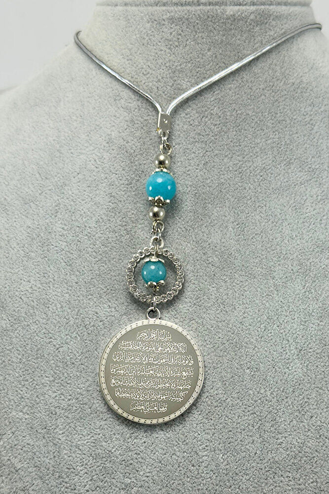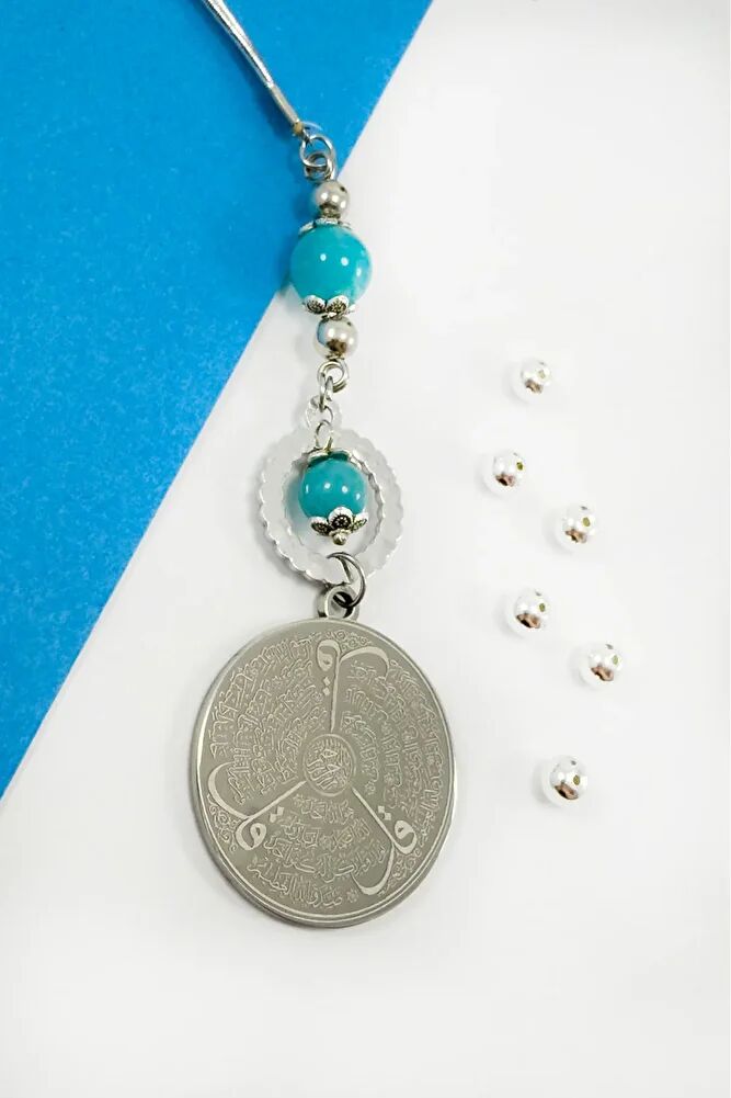 Parlak Taşlı Turkuaz Boncuklu Paslanmaz Çelik Ayetel Kürsi Felak Nas İhlas Araba Dikiz Ayna Süsü