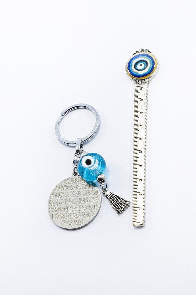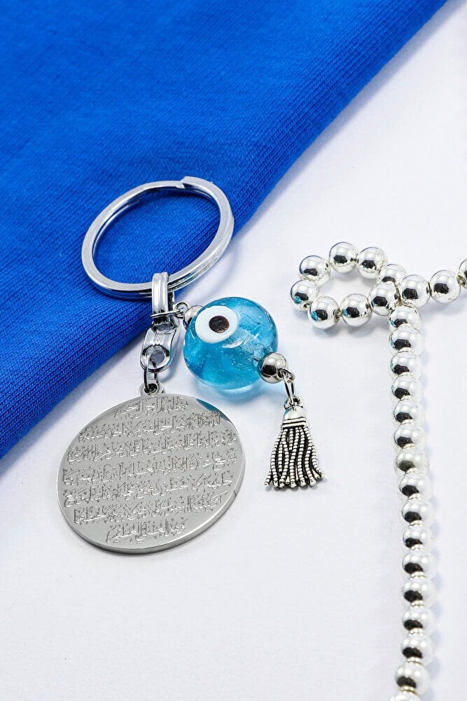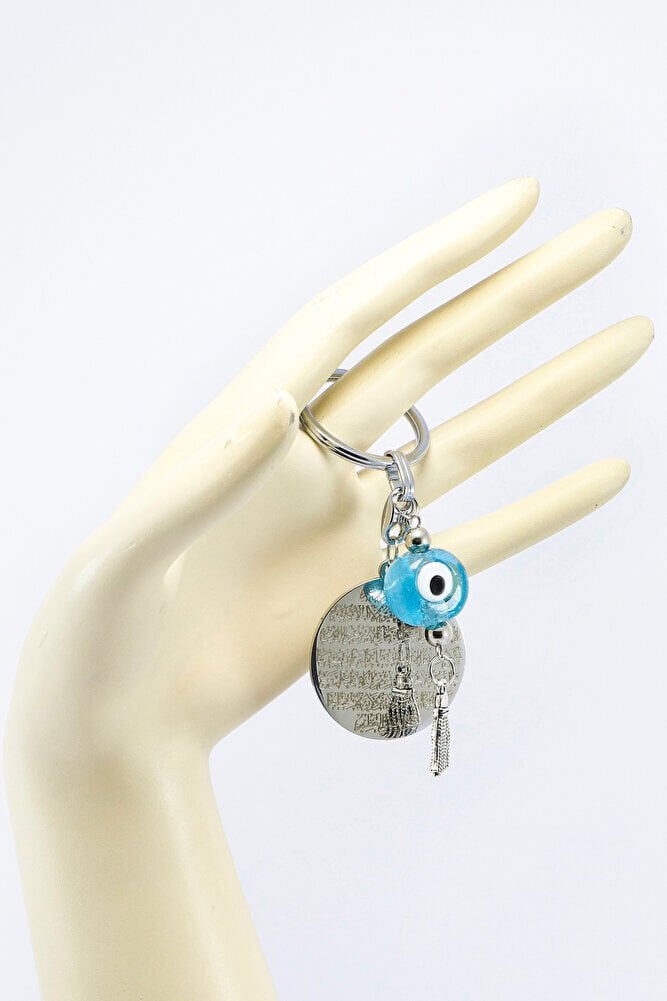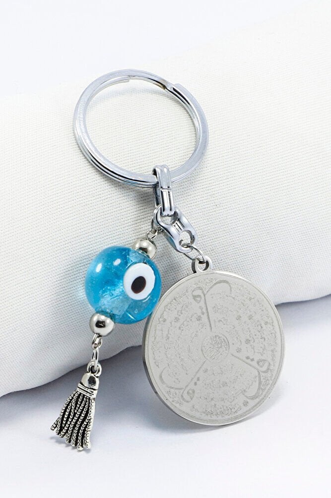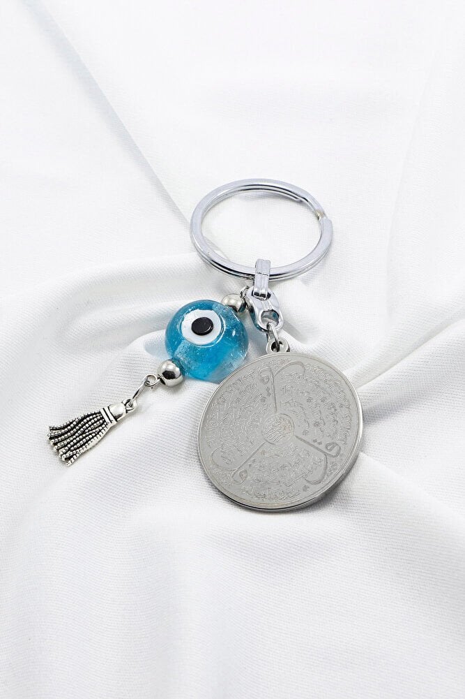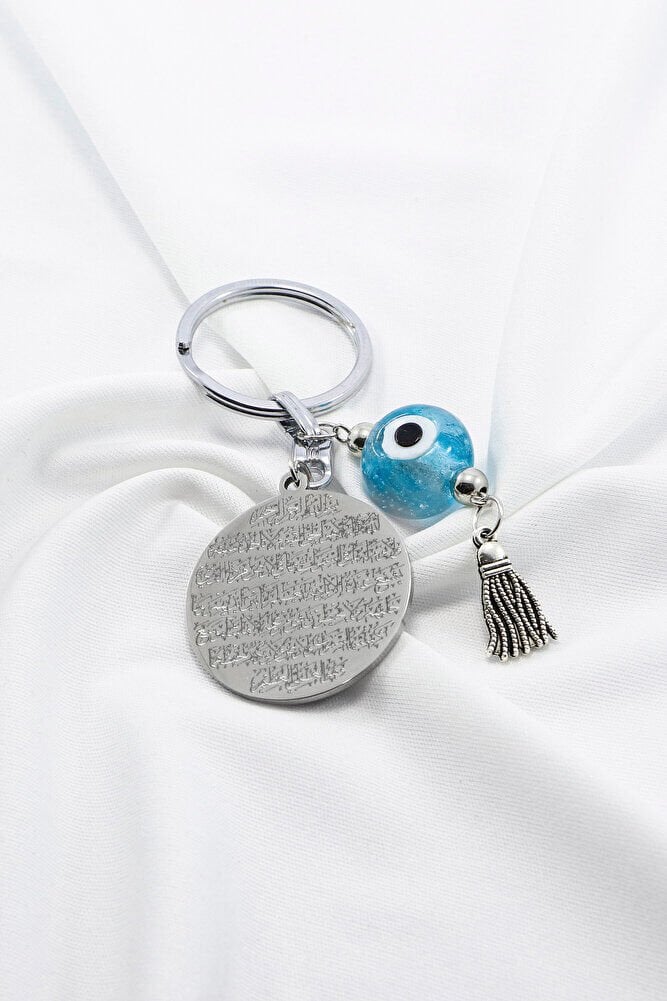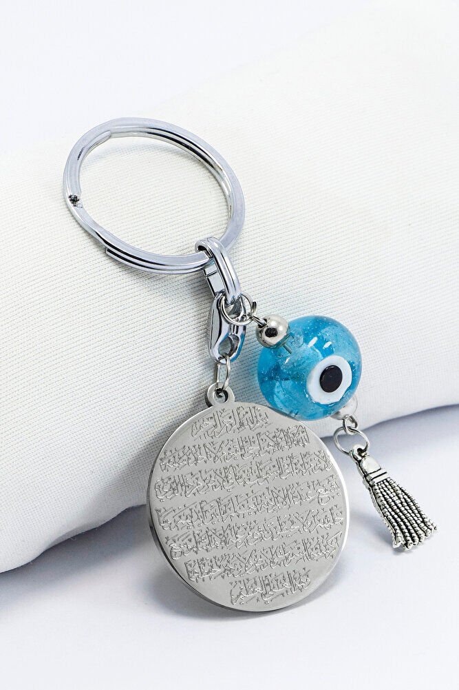 Paslanmaz Çelik Plaka Çift Taraflı Ayetel Kürsi Felak Nas İhlas Anahtarlık Turkuaz Nazar Boncuğu