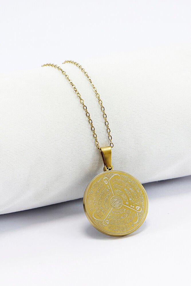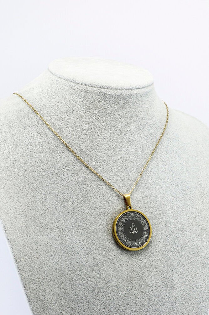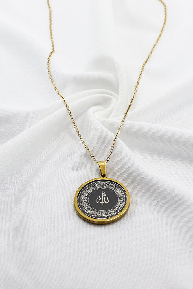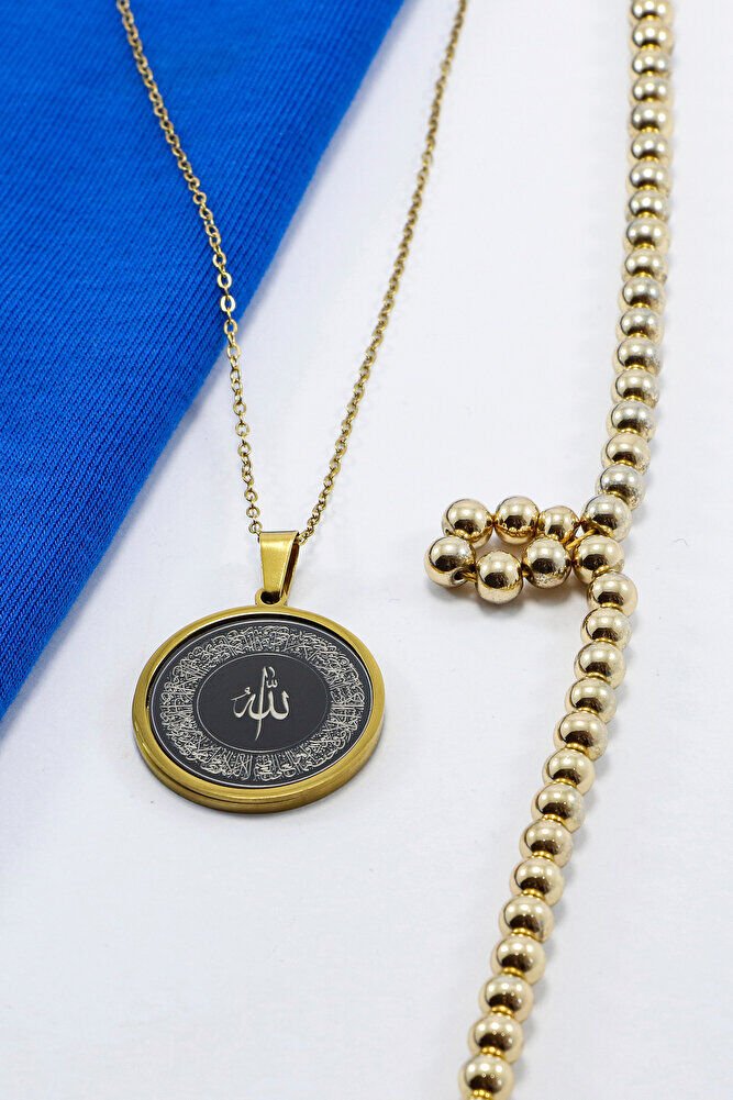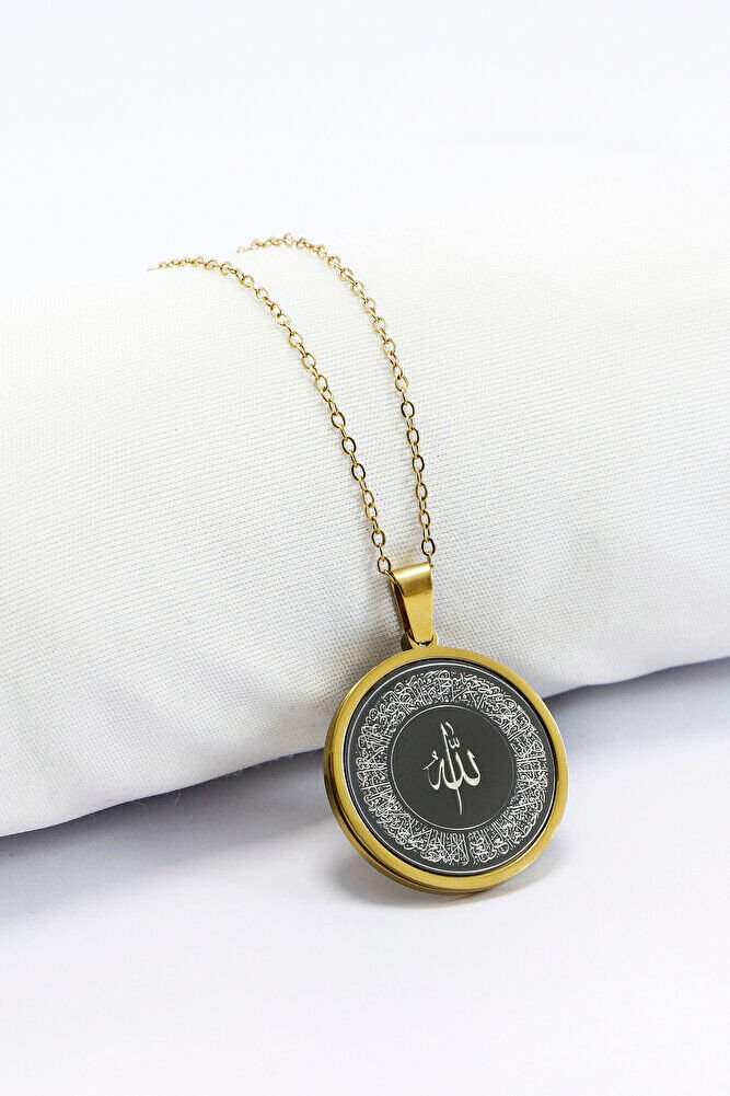 Paslanmaz Çelik Siyah Gold Çelik Kolye Lazer Kazıma Allah Lafzı Ayetel Kürsi Arkada Felak Nas İhlas