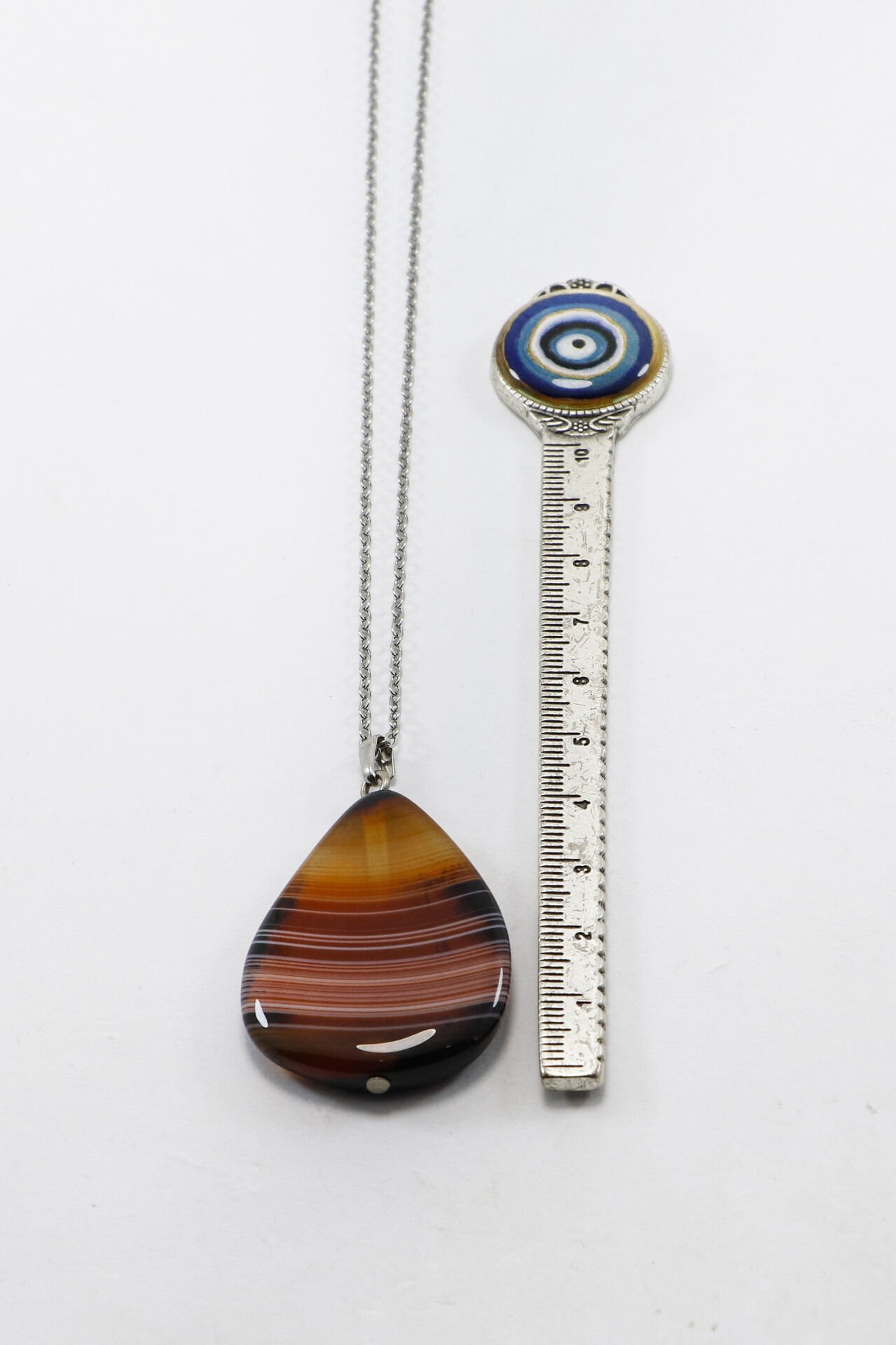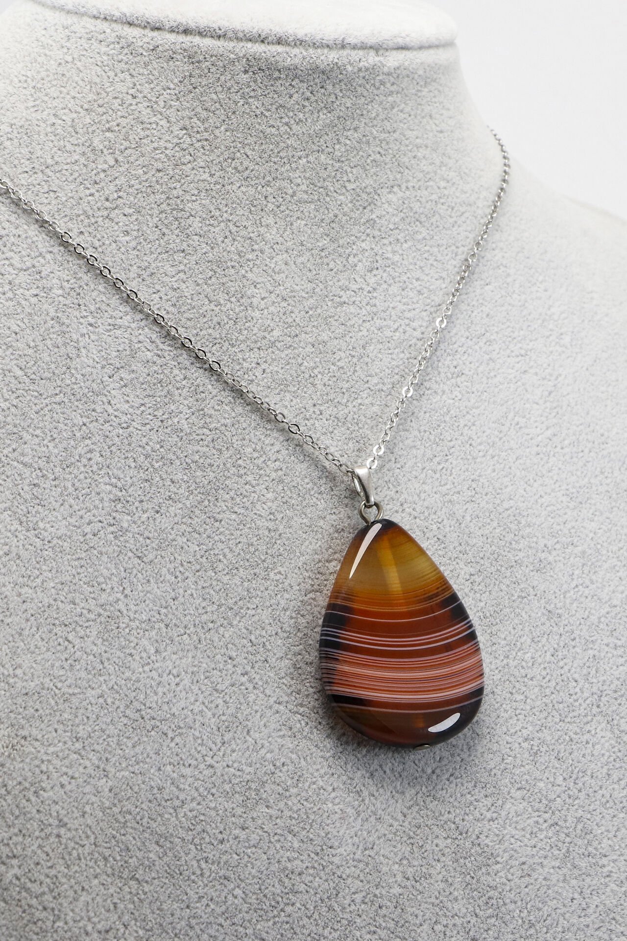 Paslanmaz çelik zincirli, 60 cm uzunluğundaki bu şık kolye, doğal kahverengi akik taşıyla tasarlanmıştır.
