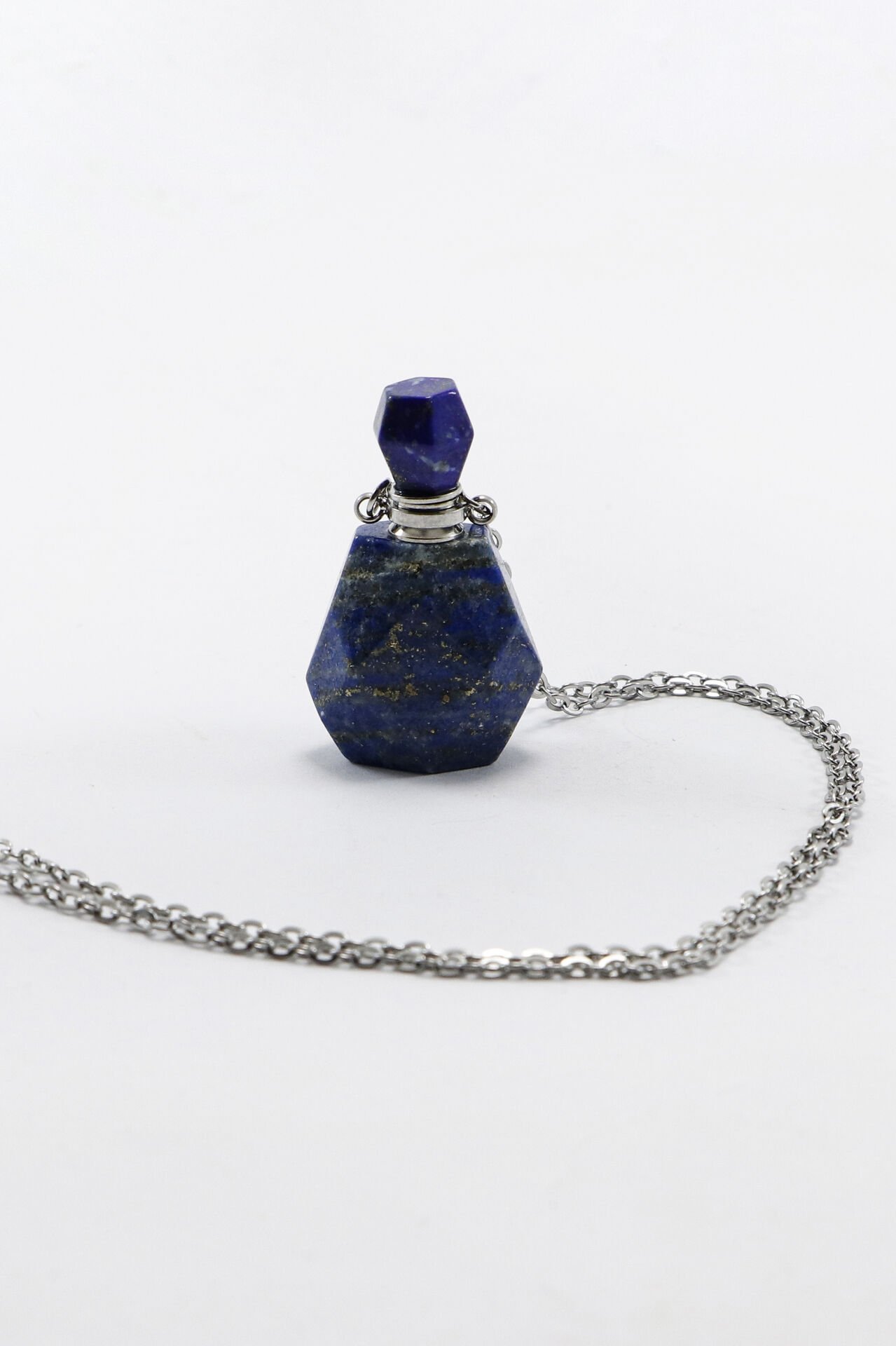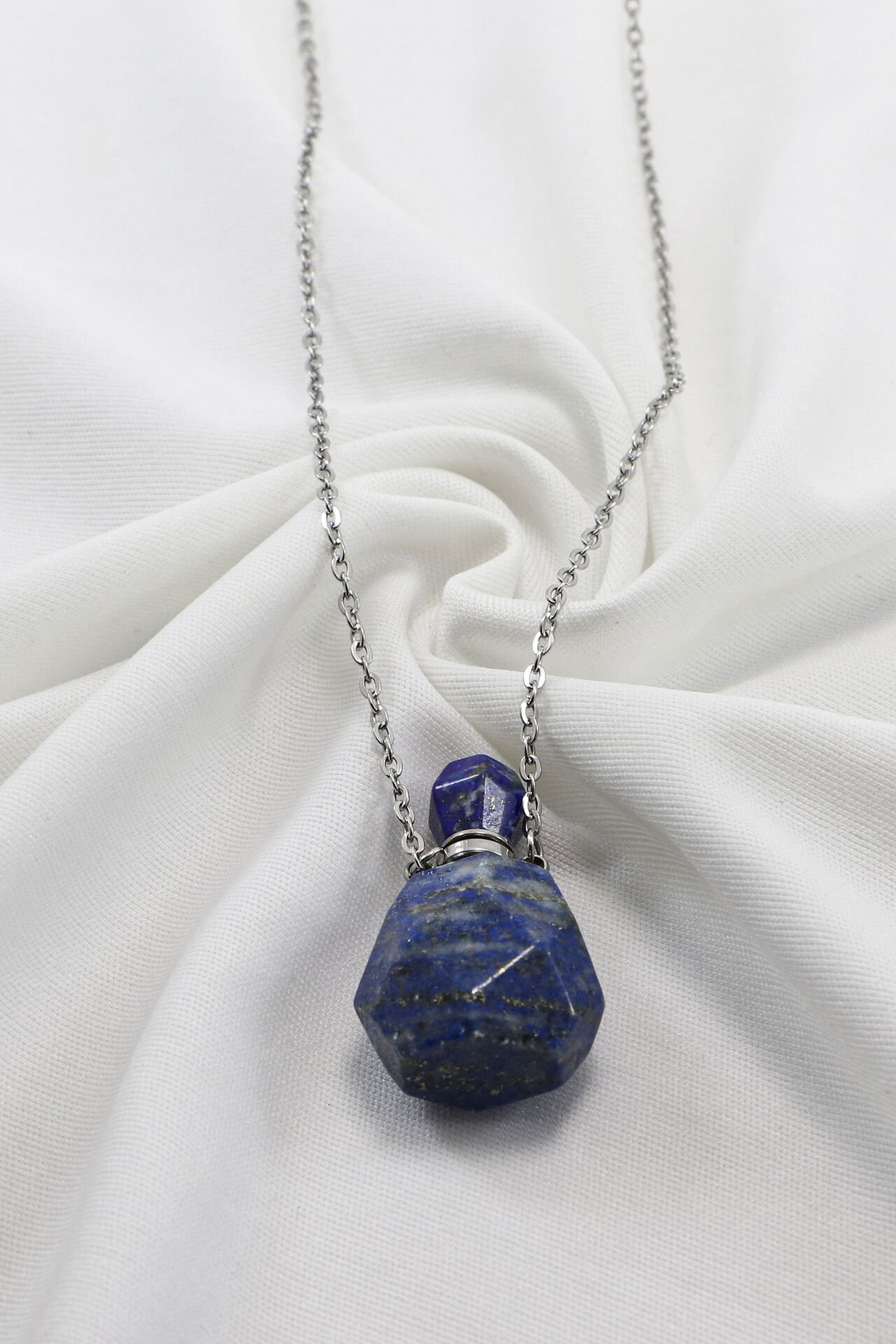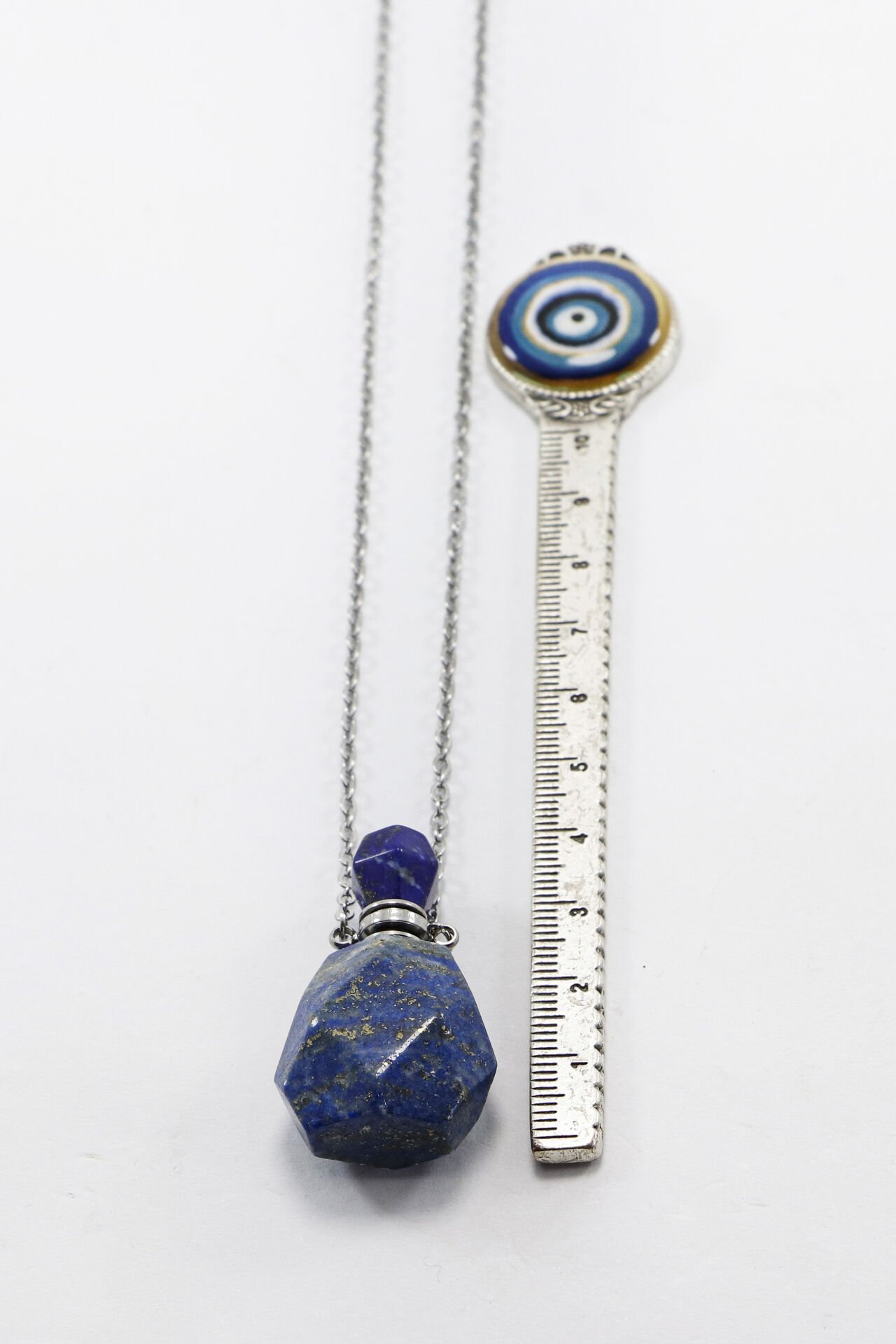 60 cm uzunluğundaki paslanmaz çelik zinciriyle tasarlanmış bu özel kolye, Lapis Lazuli doğal taşından yapılmış mini parfüm şişesi formuyla dikkat çeker.
