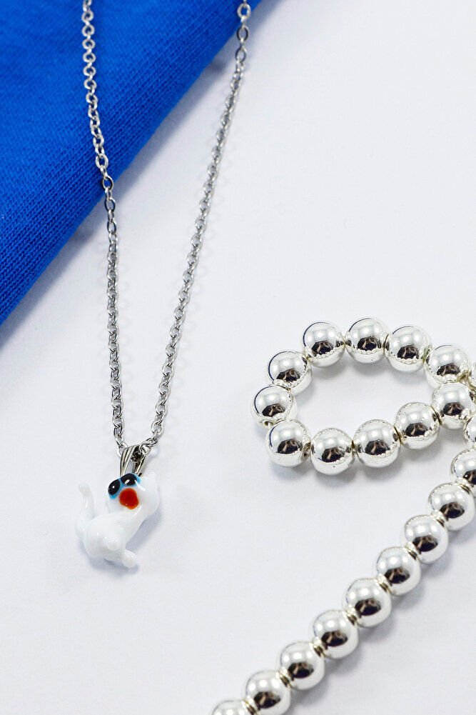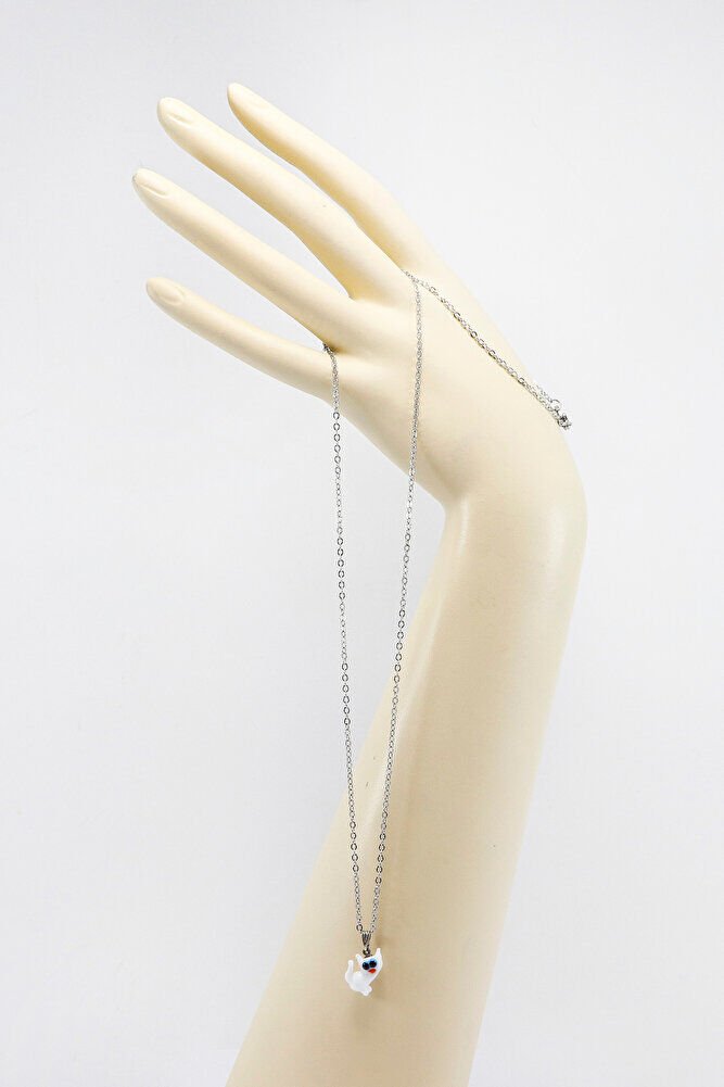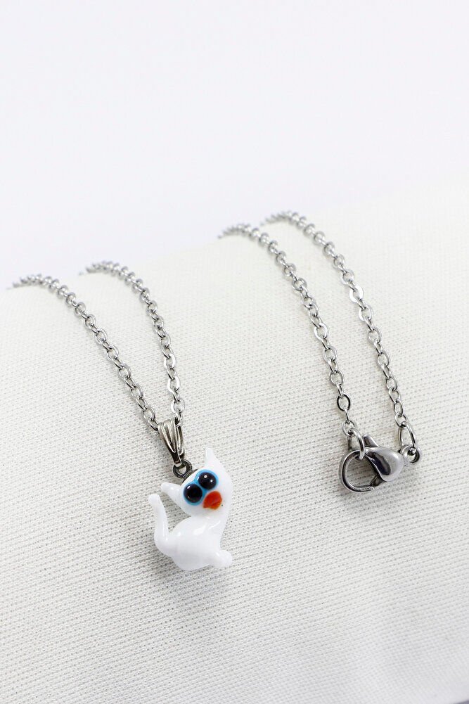 Paslanmaz Çelik Zincirli Nazarlı Cam Minik Sevimli Beyaz Kedicik Bijuteri Kolye, Hediyelik Kolye