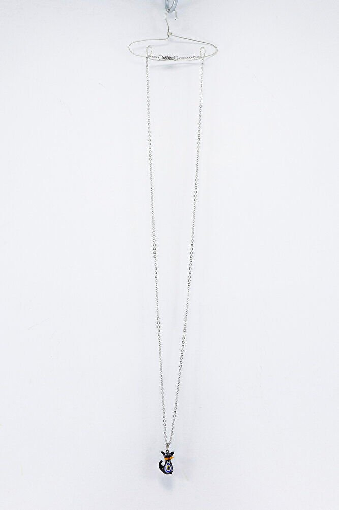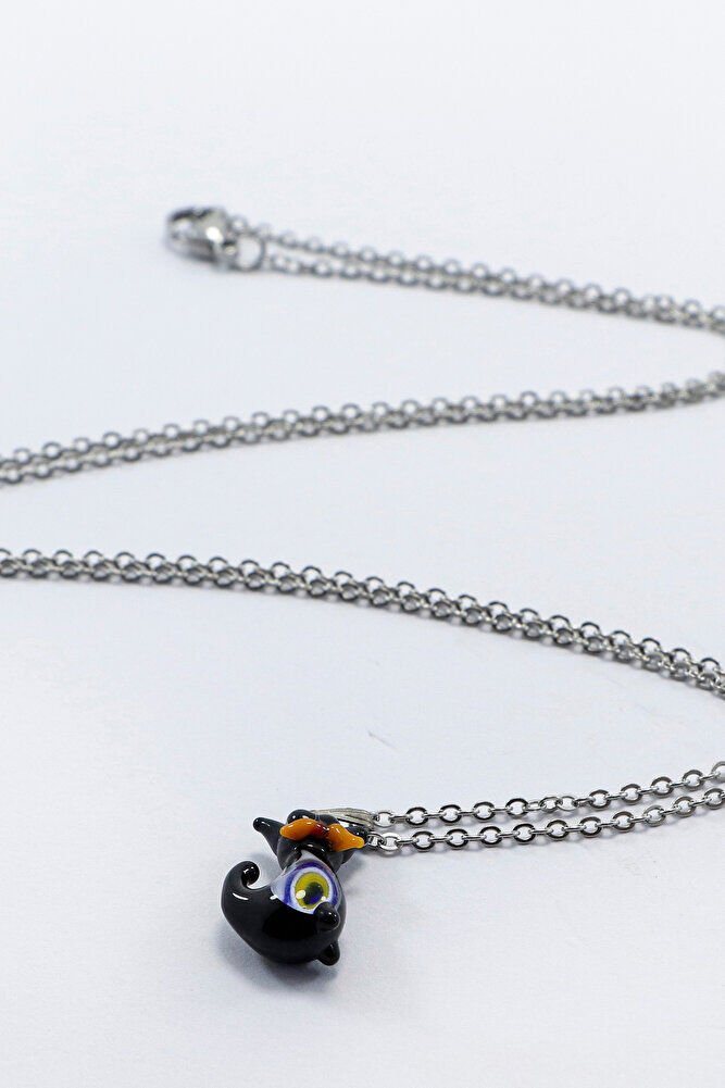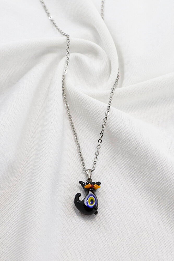 Paslanmaz Çelik Zincirli Nazarlı Cam Minik Sevimli Siyah Kedicik Bijuteri Kolye, Hediyelik Kolye