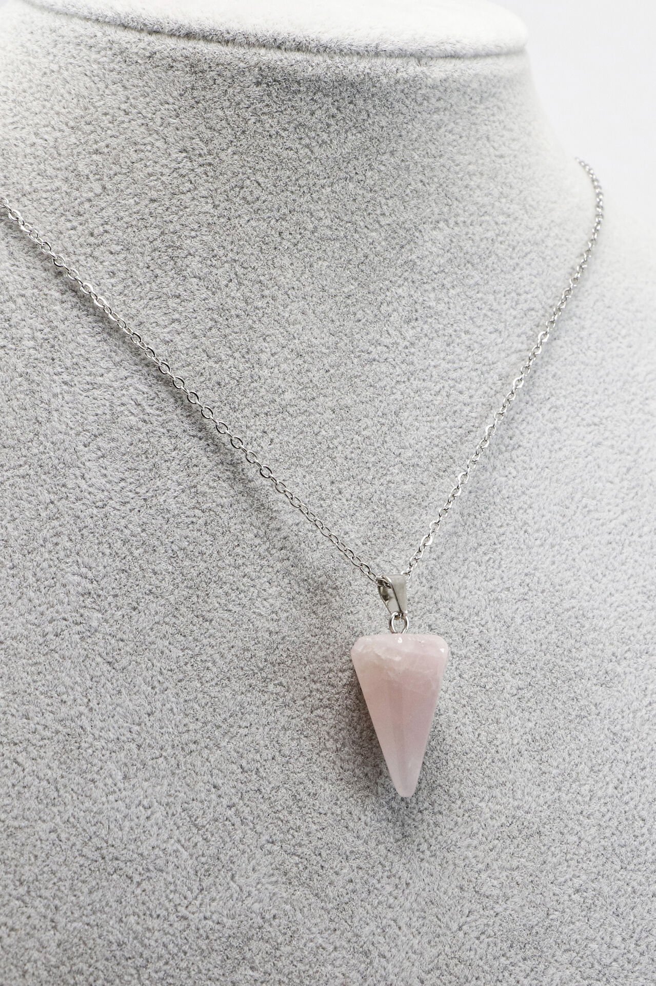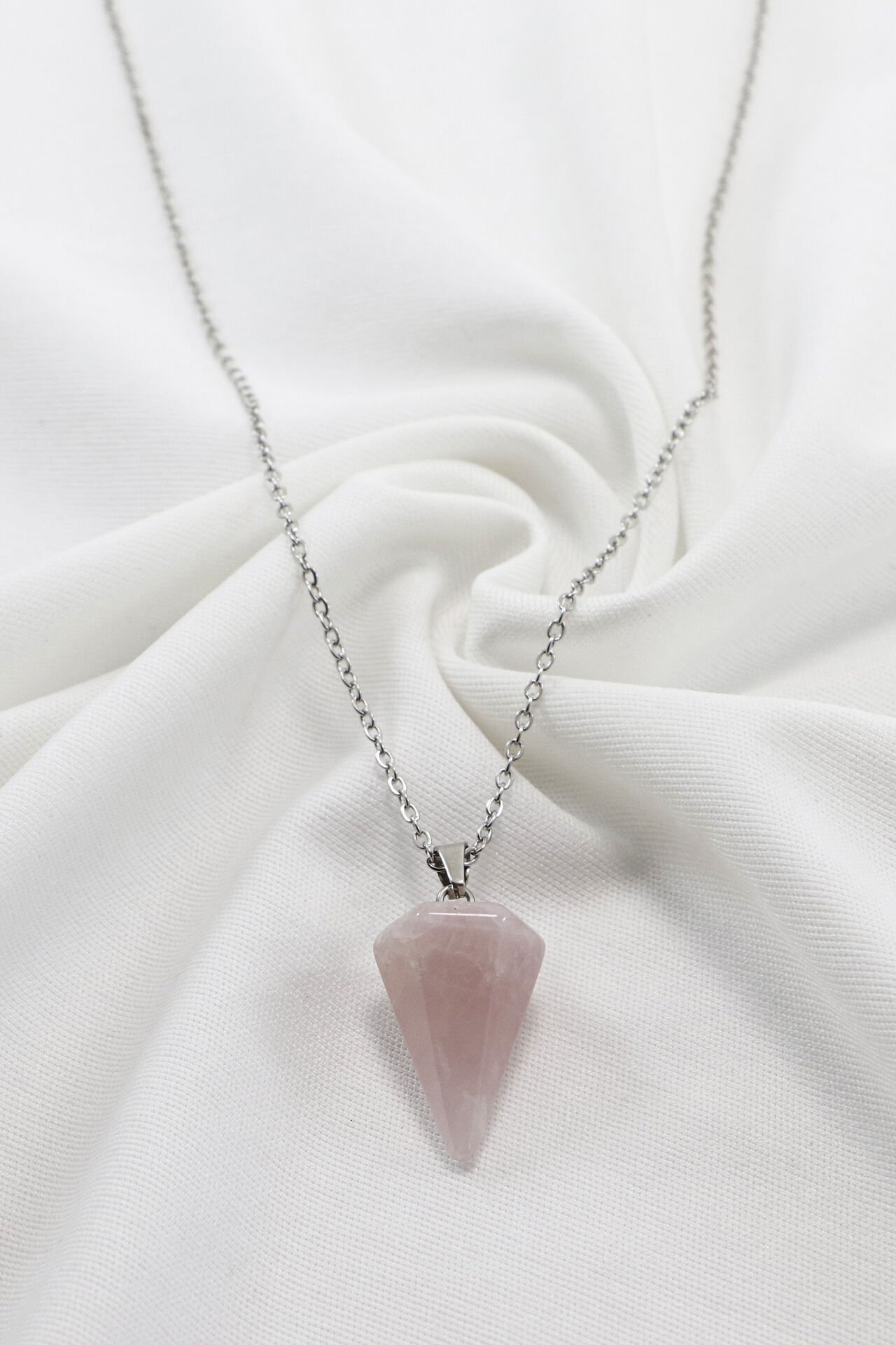60 cm uzunluğundaki paslanmaz çelik zinciriyle tamamlanan bu zarif kolye, kalp formundaki Pembe Kuvars (Rose Quartz) doğal taşıyla tasarlanmıştır.