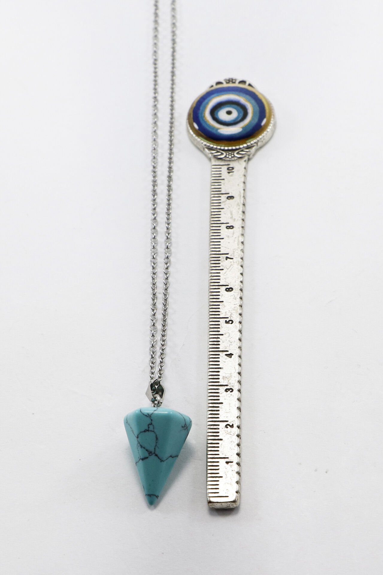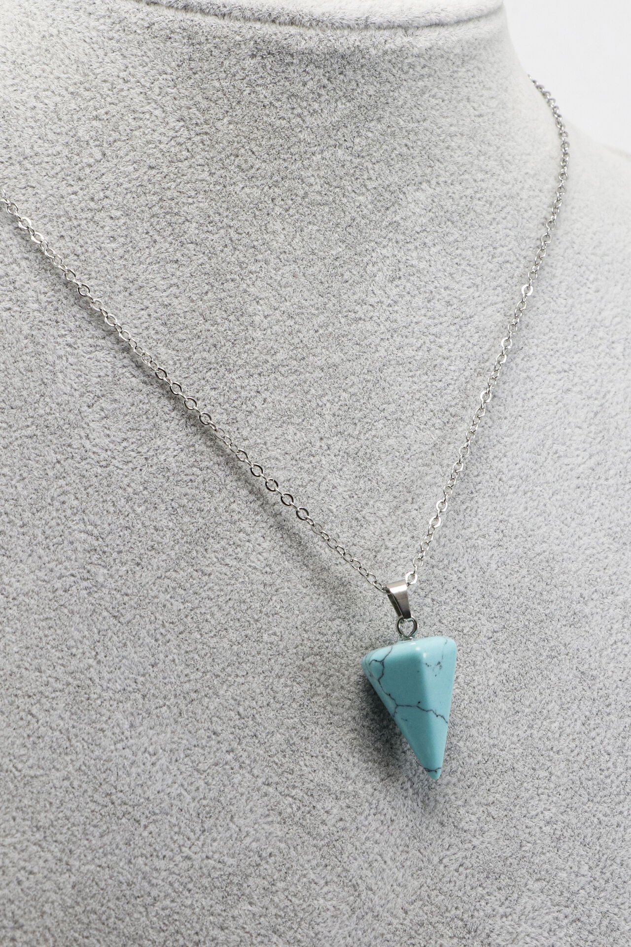 60 cm uzunluğundaki paslanmaz çelik zincirle tamamlanan bu şık kolye, göz alıcı sıkma firuze doğal taşı ile tasarlanmıştır.