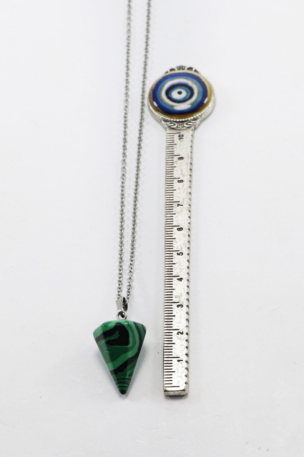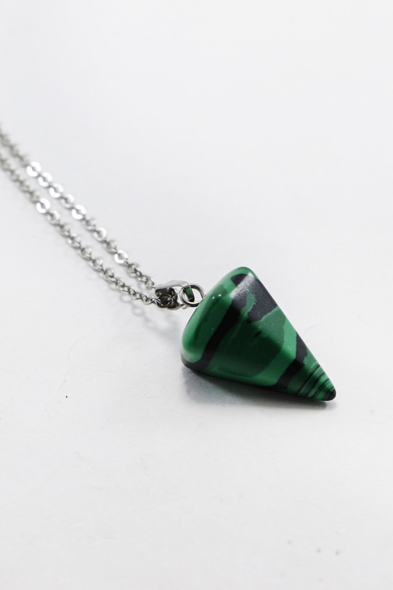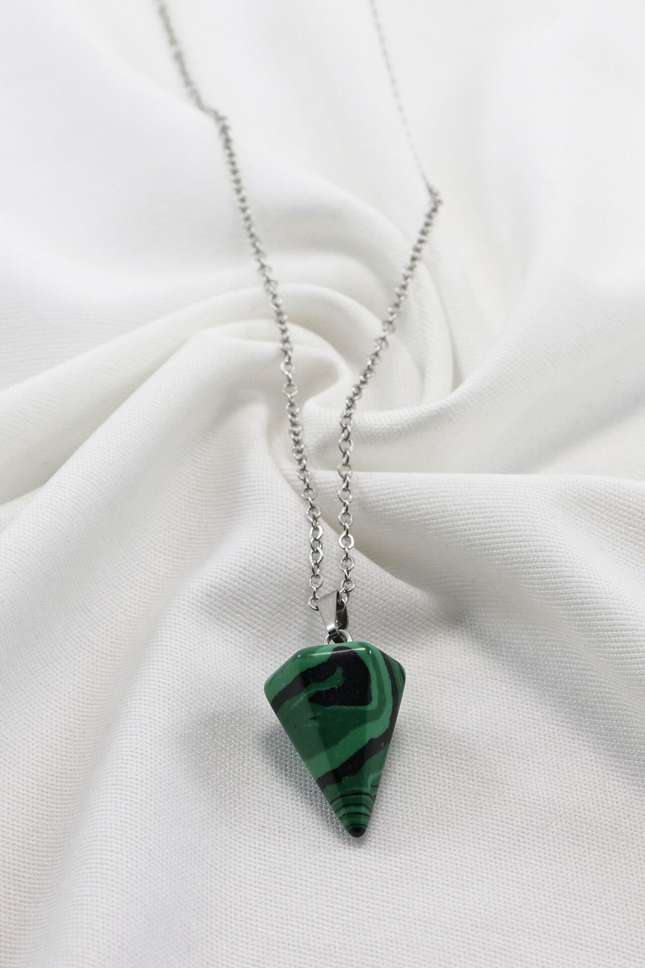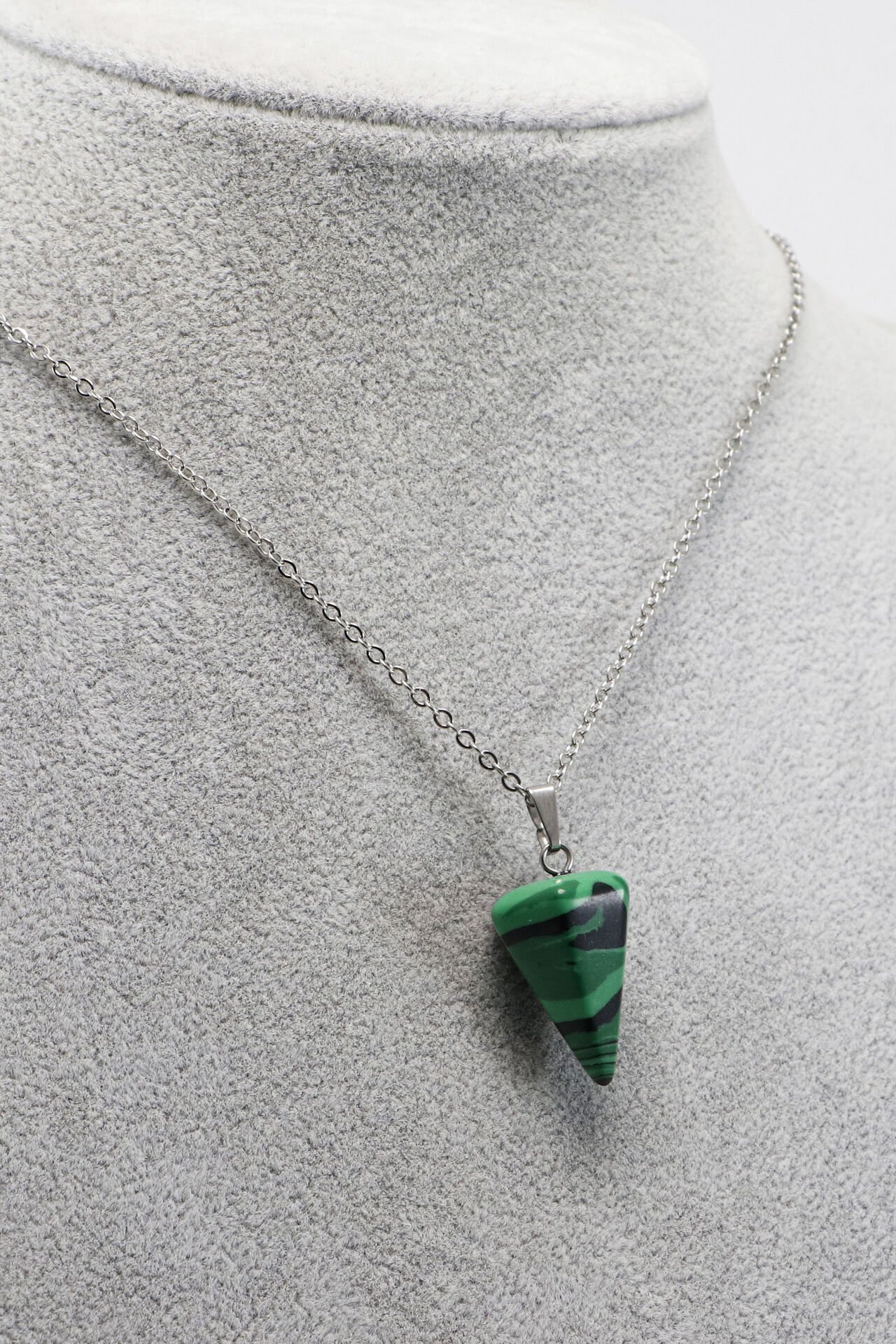 60 cm uzunluğundaki paslanmaz çelik zinciriyle tasarlanan bu kolye, sıkma malahit doğal taşıyla zarif ve enerjik bir görünüm sunar.