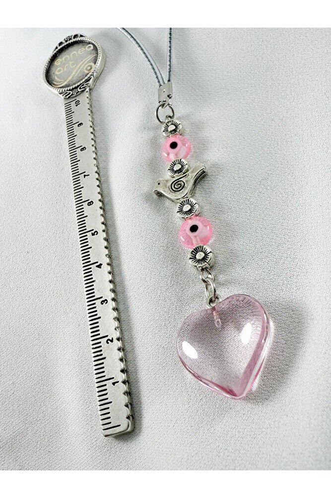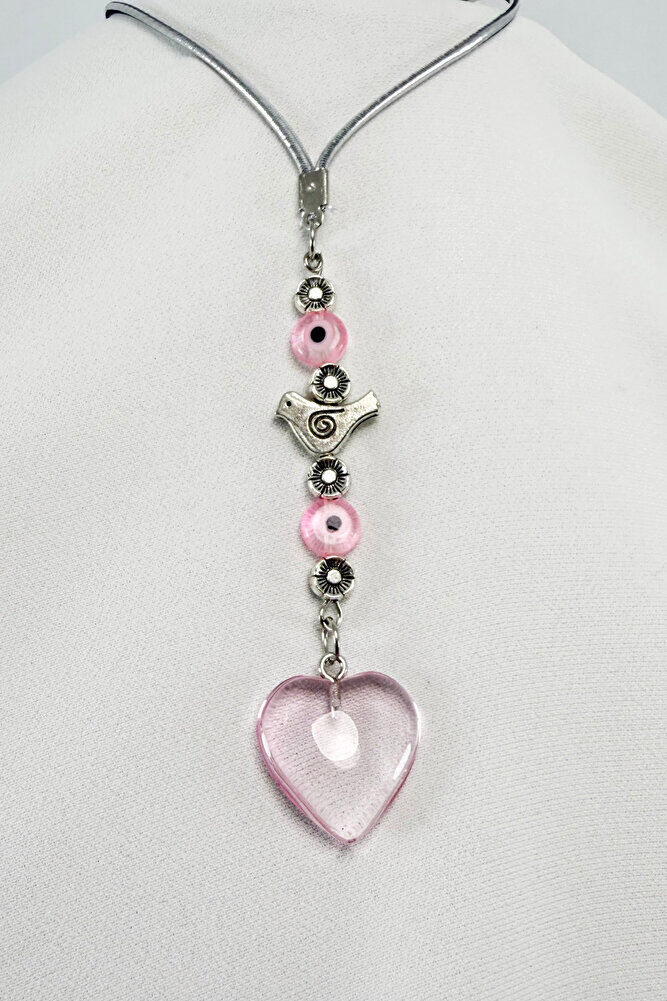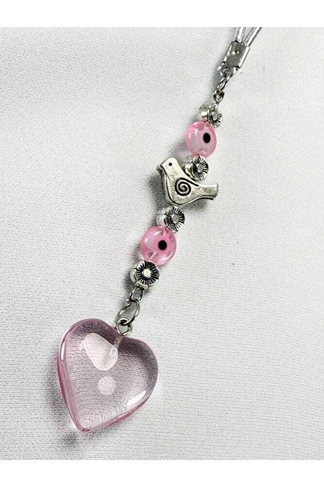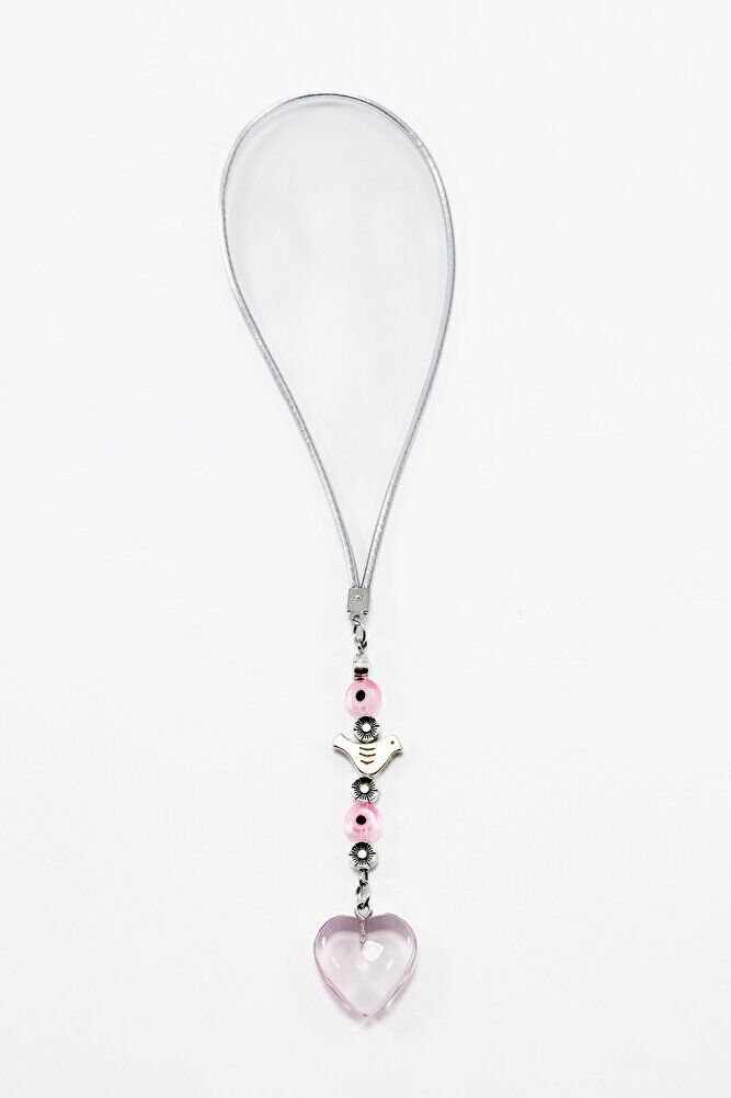 Pembe Cam Nazar Boncuğu Metal Kuş Araba Dikiz Ayna Süsü, Pembe Kalpli Yeni Araba Hediyesi