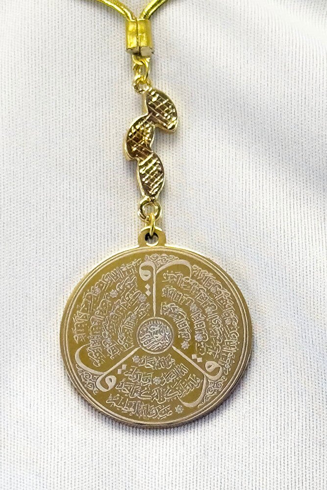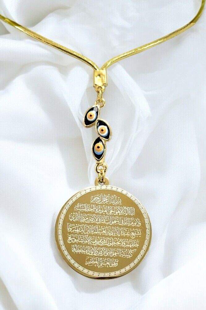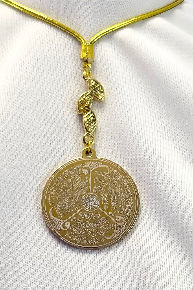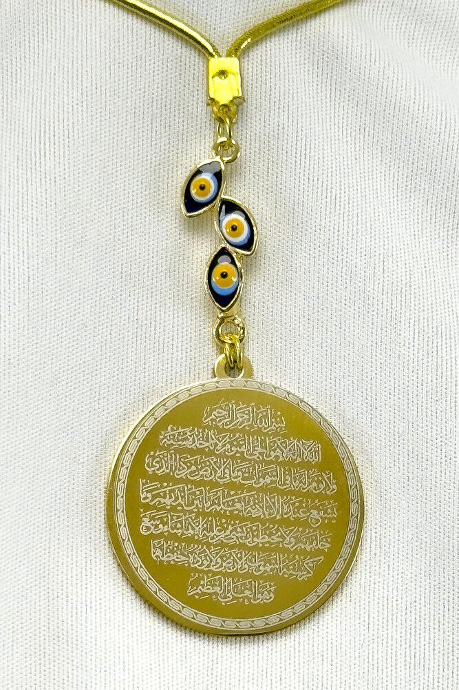 Dualar lazer kazıma tekniği ile kalıcı bir şekilde kazınmaktadır.; Lacivert salkım nazar boncuğu metaldir ve tek taraflıdır.; Ayetel Kürsi yazılı tarafında bulunmaktadır.; Ürün el yapımıdır el yapımı olduğu için ufak farklılık ve düzensizlikler olasıdır.; İp elastiktir.; Elastik olduğu için her modele rahatlıkla takılabilmektedir.; Plaka altın renkli paslanmaz çeliktir.; Bağlantı materyelleri dayanıklı altın kaplamadır.; Çelik plaka 3,5 cm ölçülerindedir.; Plaka çift taraflıdır.; Bir yüzünde Ayetel Kürsi diğer yüzünde ise Felak Nas İhlas bulunmaktadır.; Felak, Nas ve İhlas sureleri, İslam inancında korunma ve manevi güç sağlamak için okunan önemli dualardır.; İnanılır kabul edilir ki, Felak ve Nas sureleri, özellikle kötü gözlerden, nazardan ve şeytani etkilerden korunmak için okunur.; Felak suresi, karanlık güçlere karşı koruma sağlarken, Nas suresi de olumsuz düşünceler ve zararlı enerjilerden korunmayı sağlar.; İhlas suresi ise, Allah ın birliğini ve sınırsız gücünü ifade eder, bu sureye inanılır ki, kişi manevi huzur ve Allah ın koruması altında olur.; Bu sureler, sıkça güven ve huzur arayışında olanlar için okunur ve ruhsal dengeyi sağlamak isteyenlere büyük fayda sağladığına inanılır.; Ayetel Kürsi, İslam inancında en güçlü ve koruyucu dualardan biri olarak kabul edilir.; Ayetel Kürsi, Allah ın büyüklüğünü ve egemenliğini ifade eden bir ayet olup, koruma ve manevi güç sağlamak amacıyla sıkça okunur.; Bu ayet, göklerde ve yerin her şeyinin Allah a ait olduğunu vurgular ve şeytani etkilerden korunma sağlar.; Özellikle gece yatmadan önce okunmasının, güvende olma, zararlı enerjilerden korunma ve ruhsal huzur sağlama açısından büyük fayda verdiğine inanılır.; Aynı zamanda, Allah ın her şeyi bildiği ve her şeyin O na bağlı olduğu inancı ile kişiye manevi rahatlık ve güç verir.;